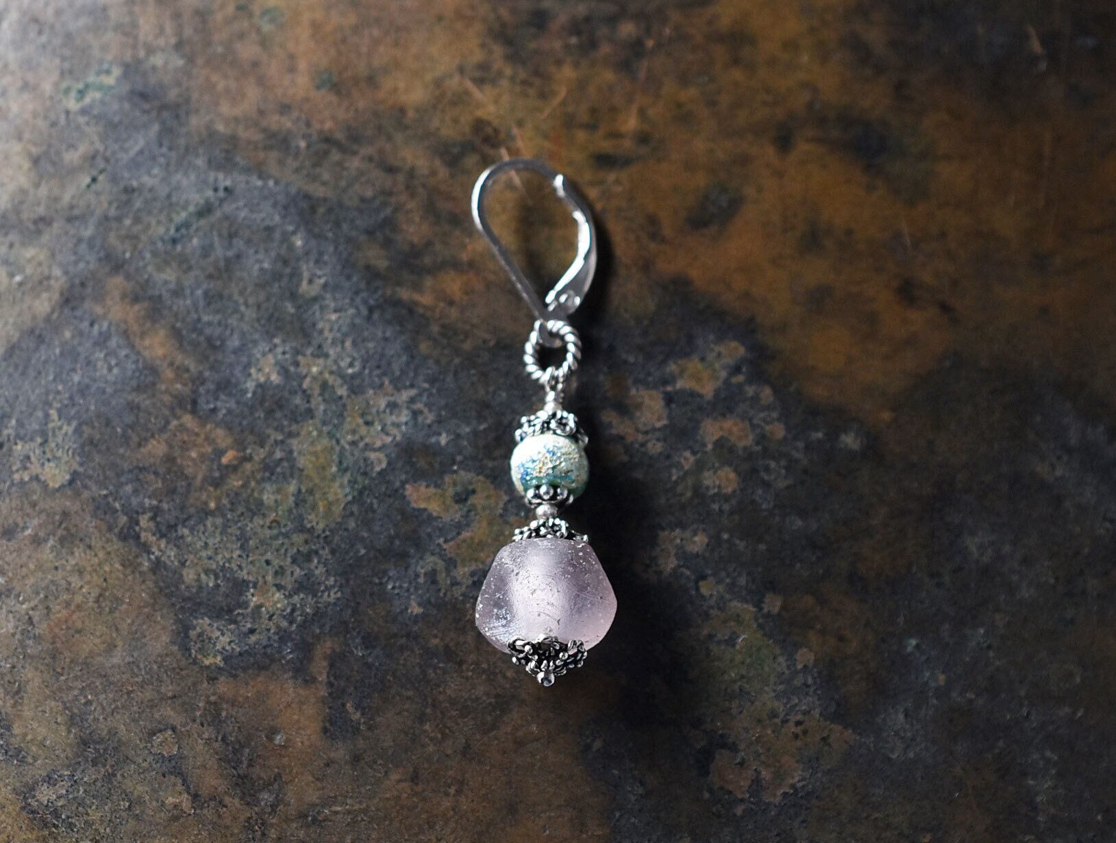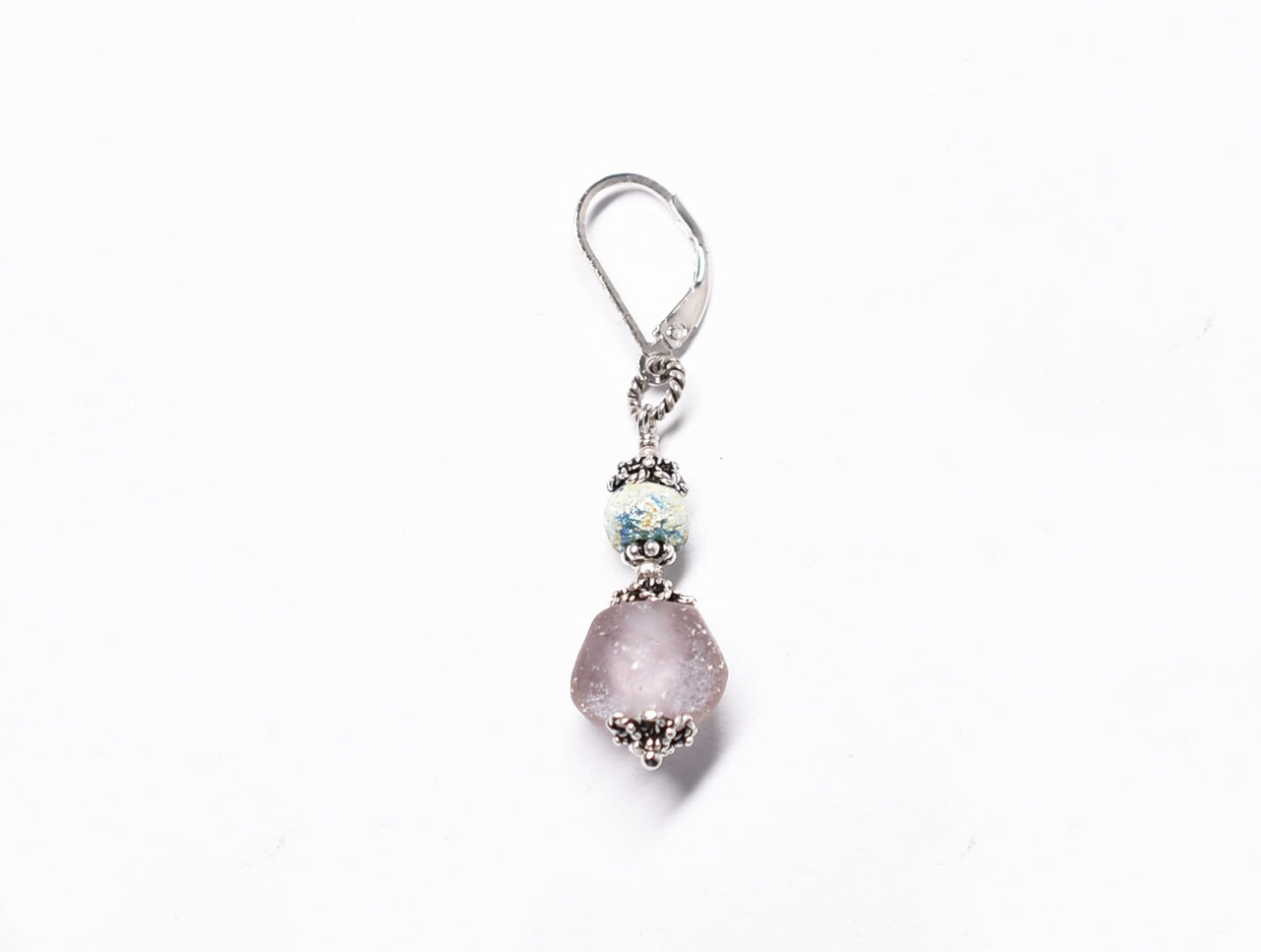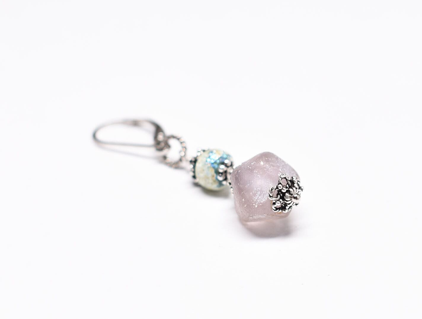 薄すみれ色ドゴンビーズと銀化ローマングラスビーズの片耳ピアス