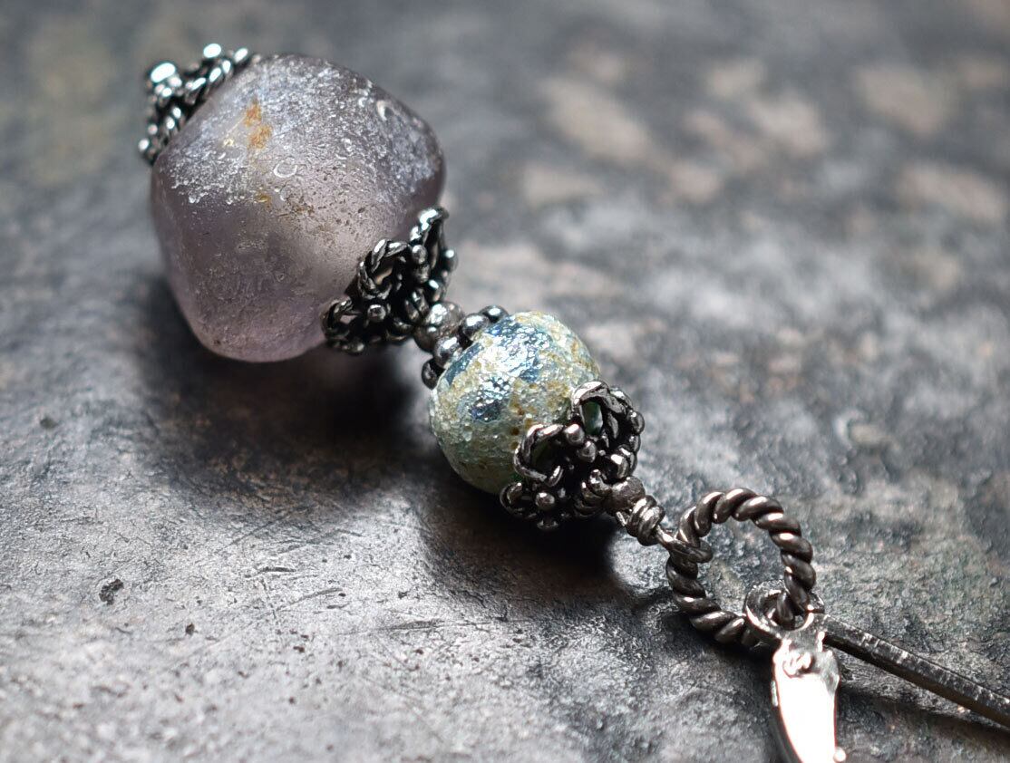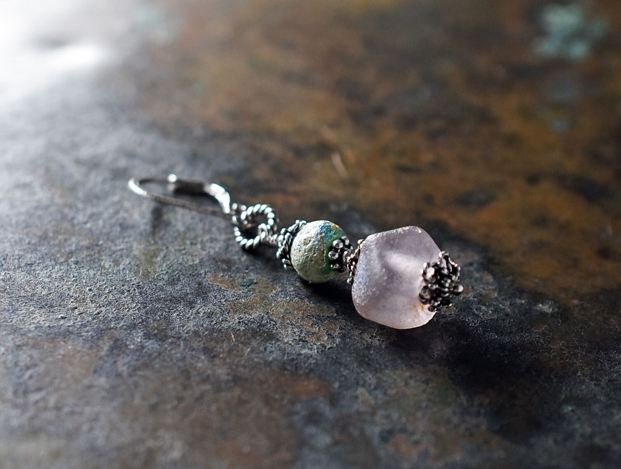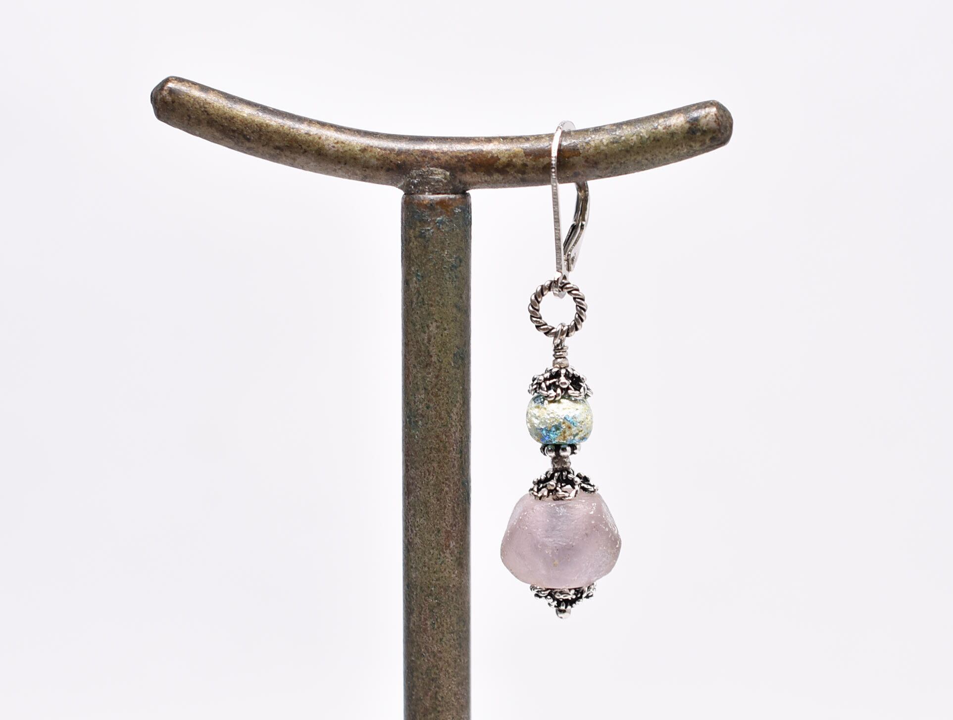 薄すみれ色ドゴンビーズと銀化ローマングラスビーズの片耳ピアス