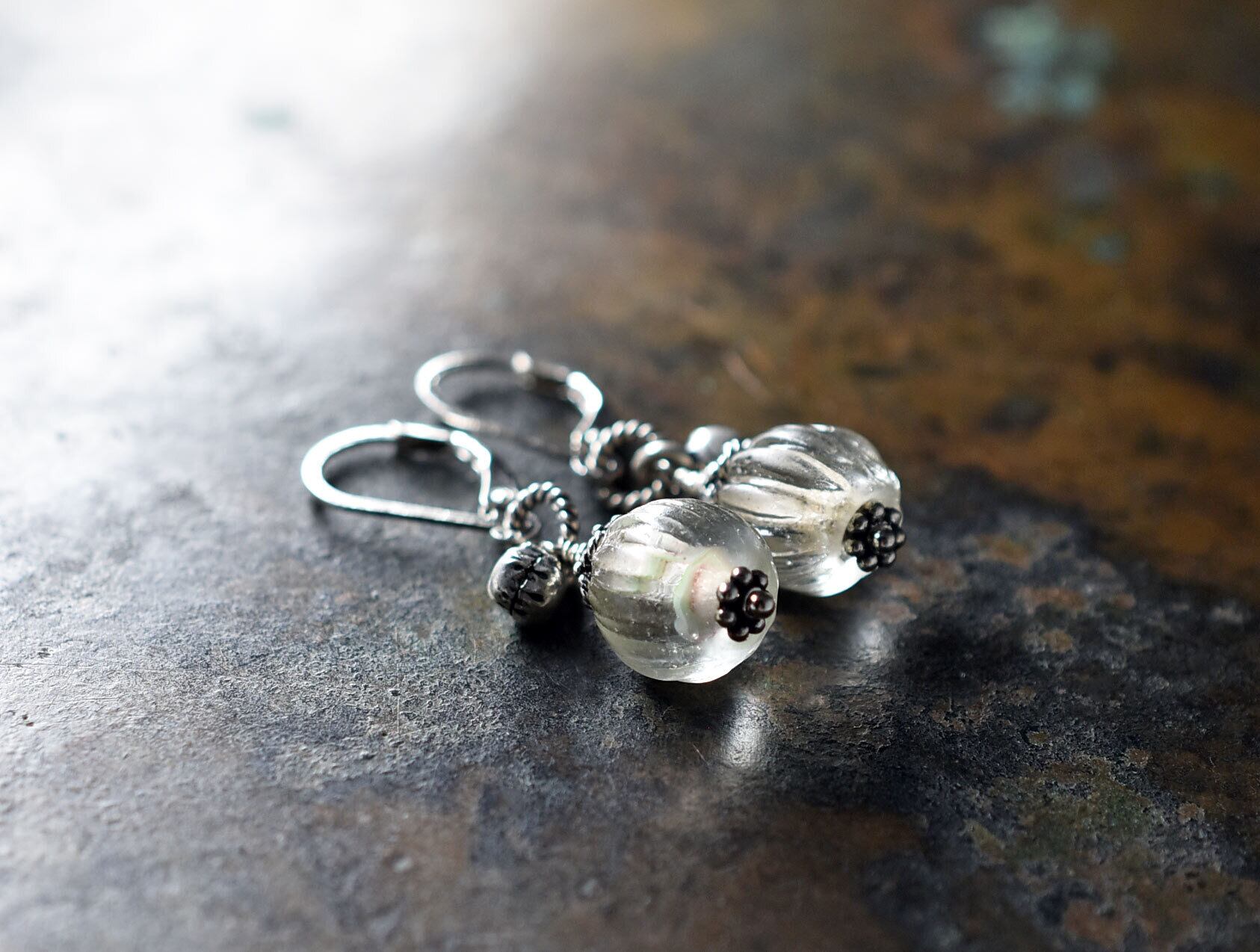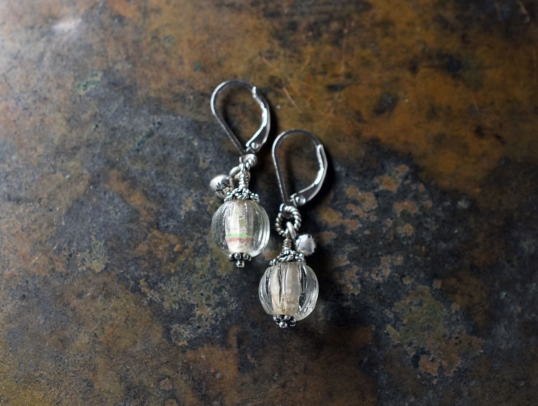 oldクリア蜜柑玉とインドシルバー鈴を繋いだピアスです。
