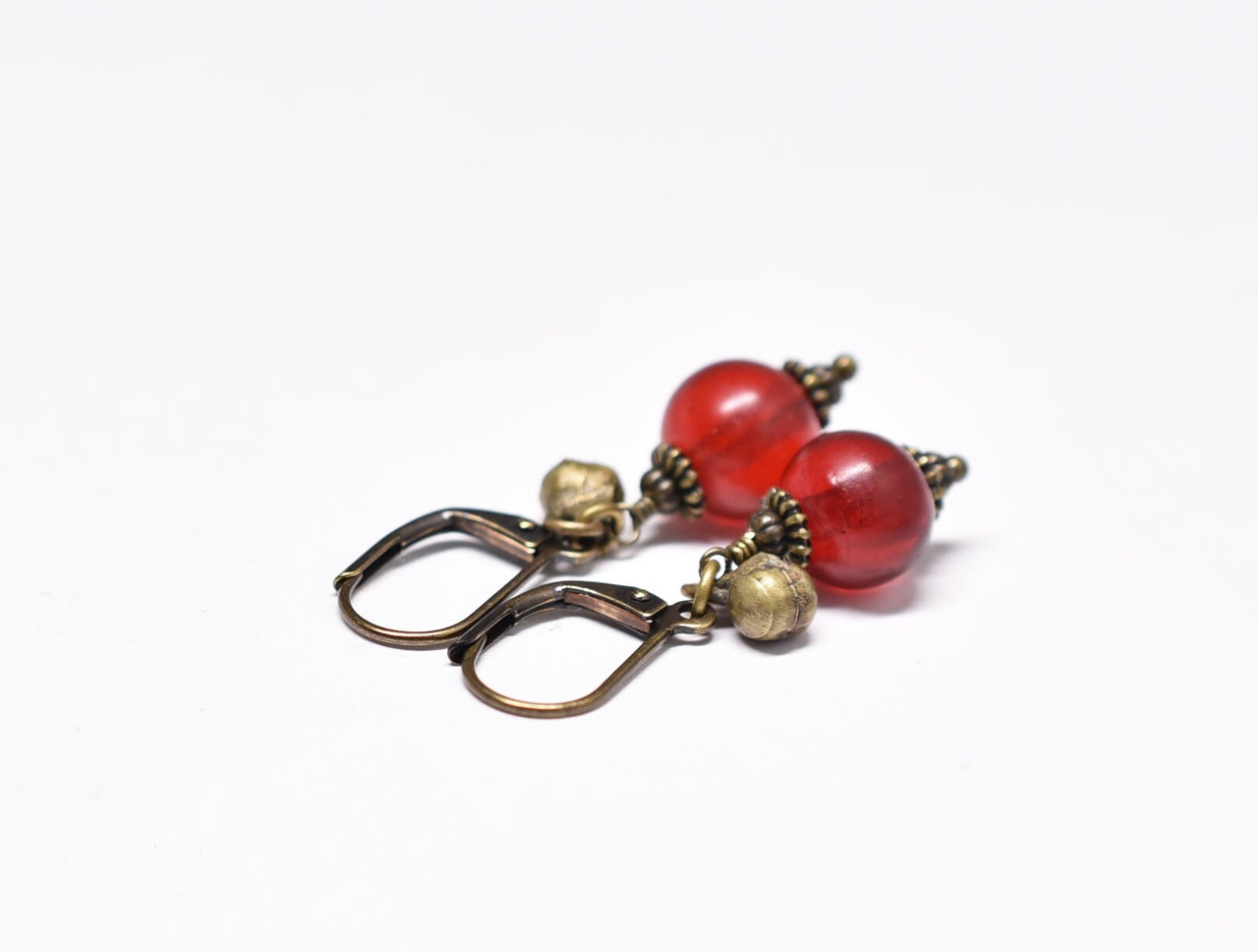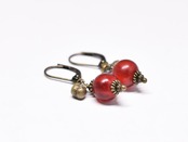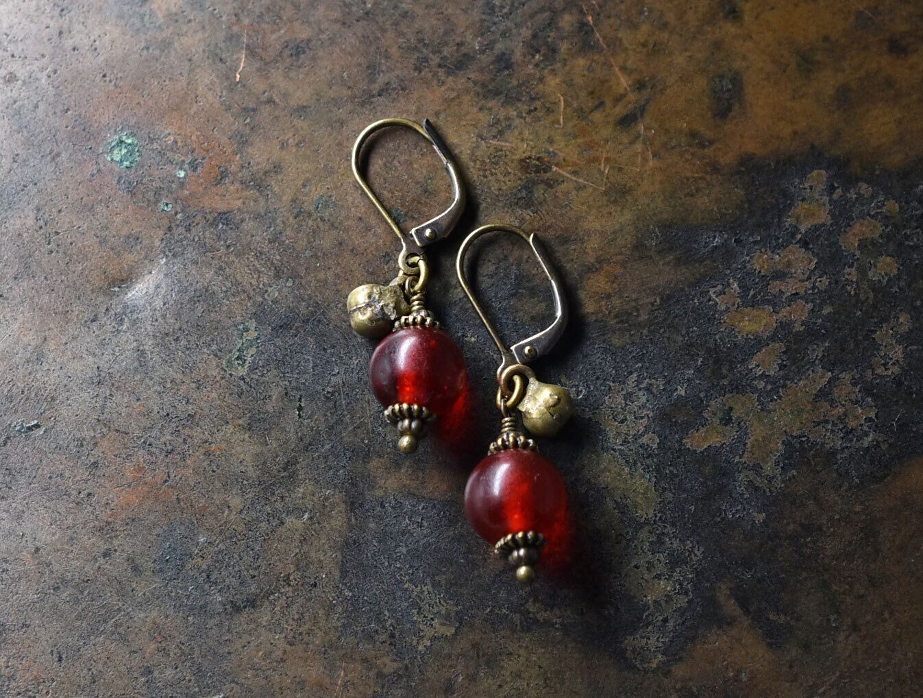 深紅アンティークボヘミアビーズと民族鈴を繋いだピアスです。
