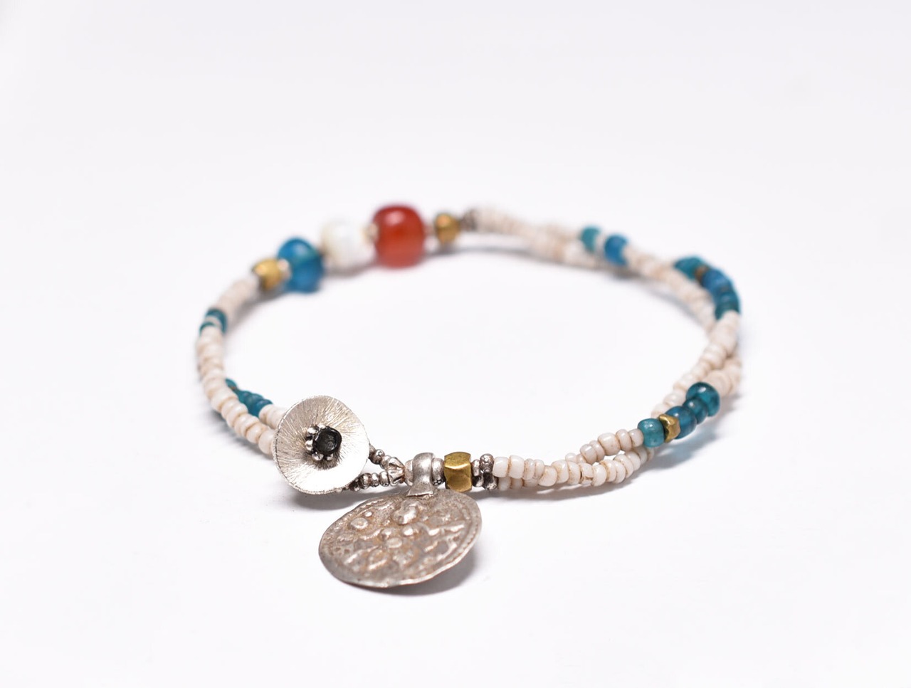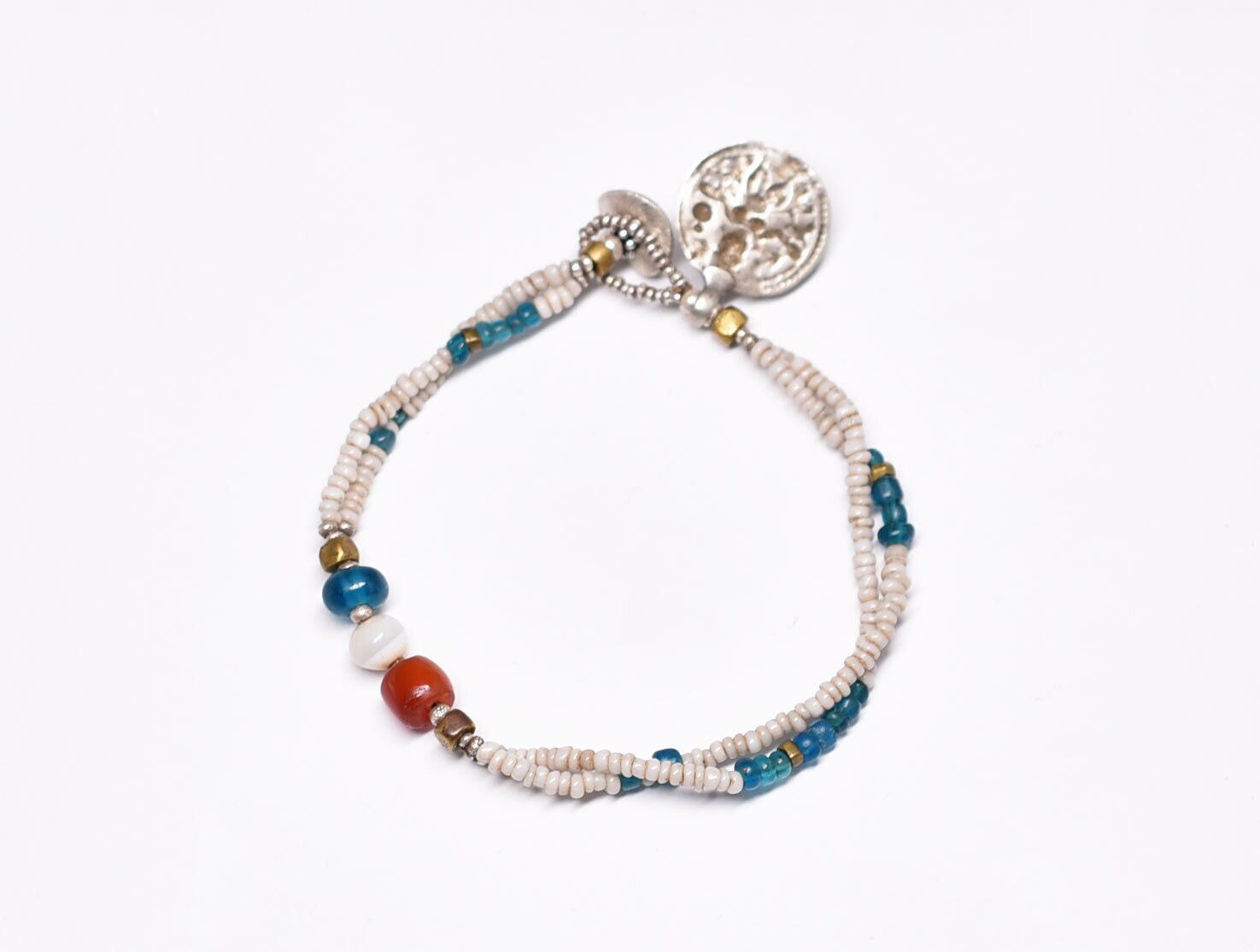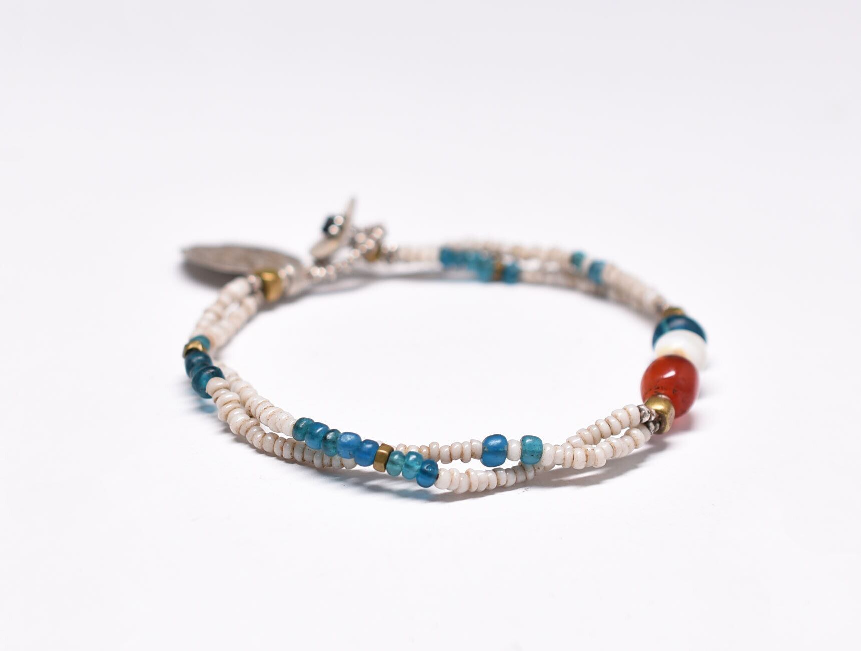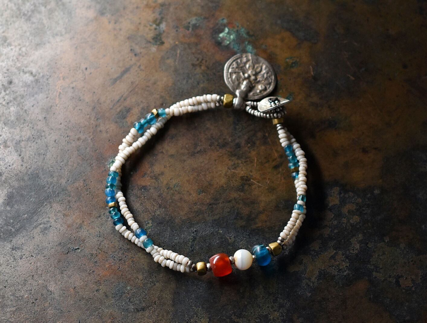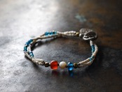 oldインドシルバートップとoldチンシルバー、ミゾーラムカーネリアン、古代瑪瑙、ホワイト&エメラルドブルービーズを繋いだ2連のブレスです。
