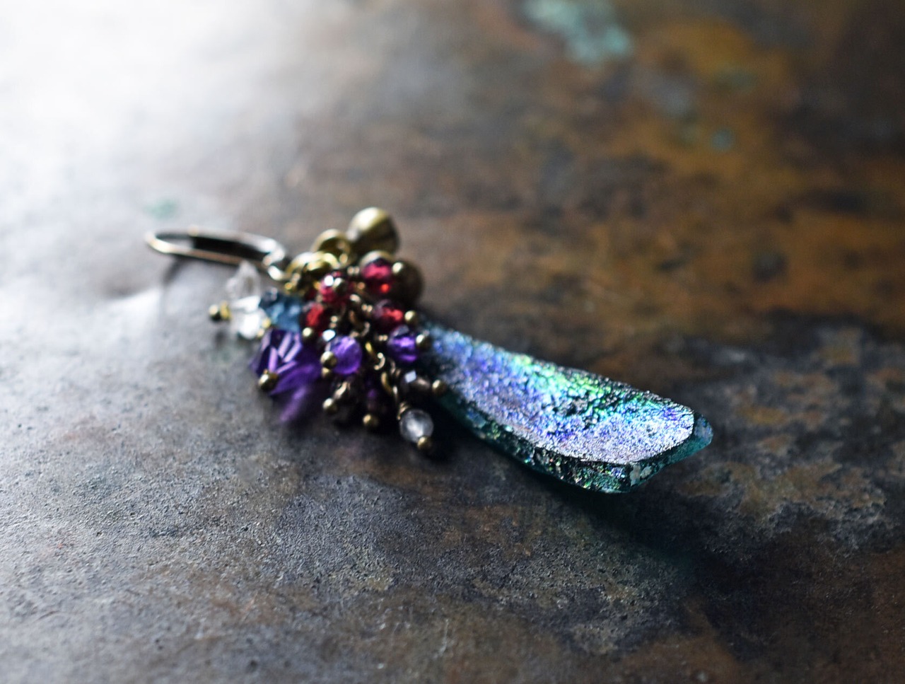 素材:ガラス、真鍮、ミックスメタル、ラブラドライト、スモーキークォーツ、アメジスト、ガーネット、ハーキマーダイヤモンド、モスカイヤナイト、カレンシルバー