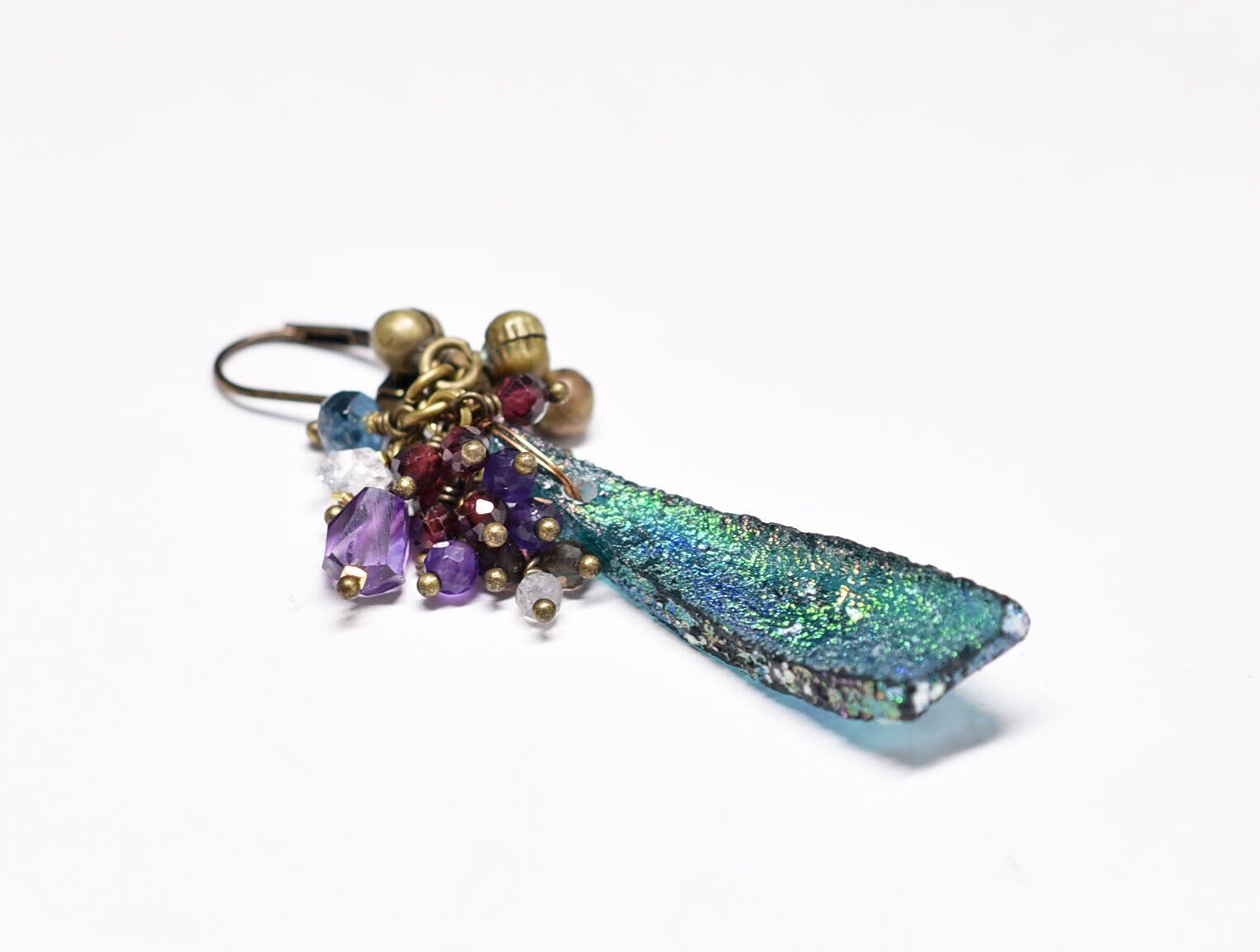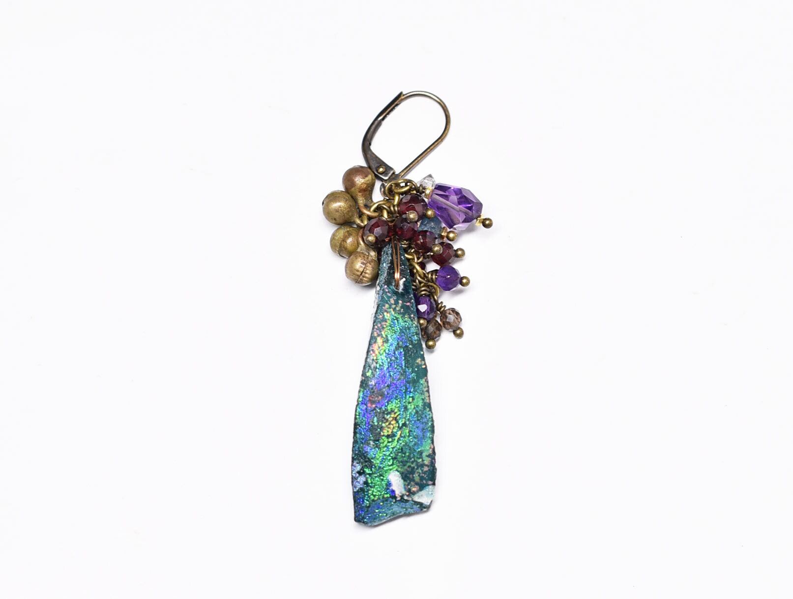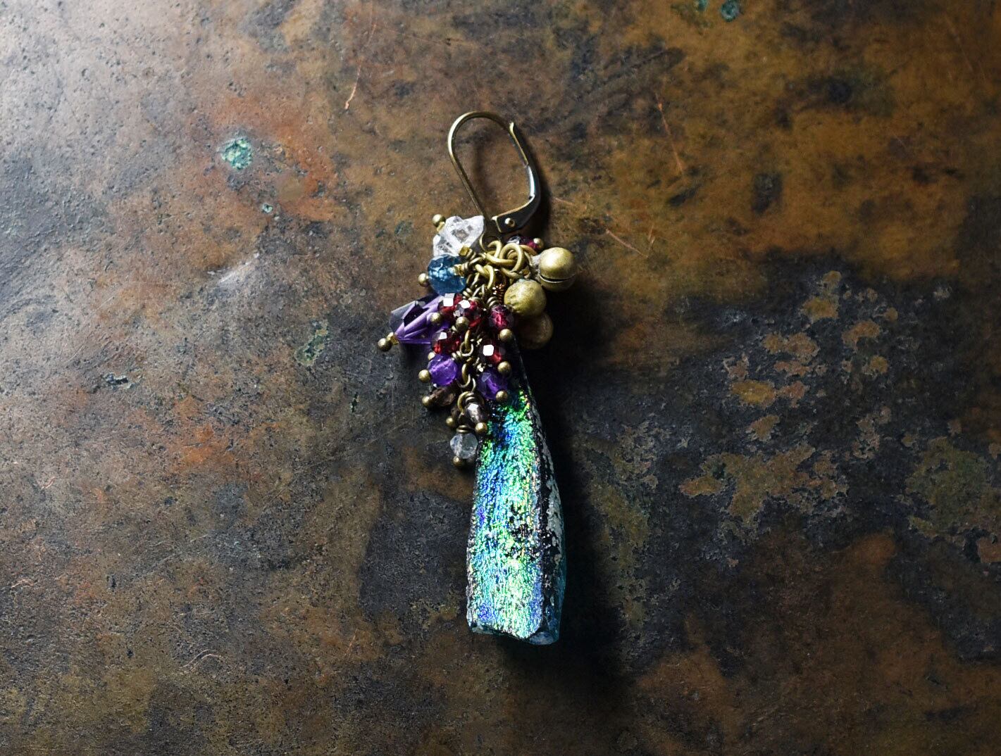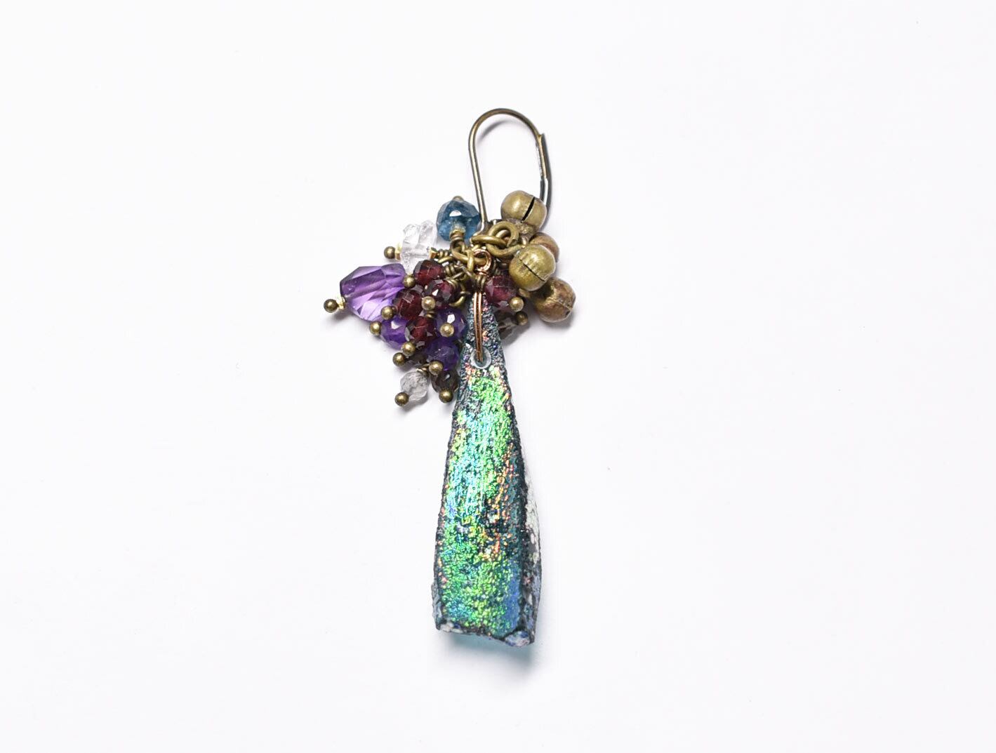 ブルーグリーン玉虫色銀化ローマングラスとたわわなストーンビーズ、民族鈴を繋いだ片耳のピアスです。