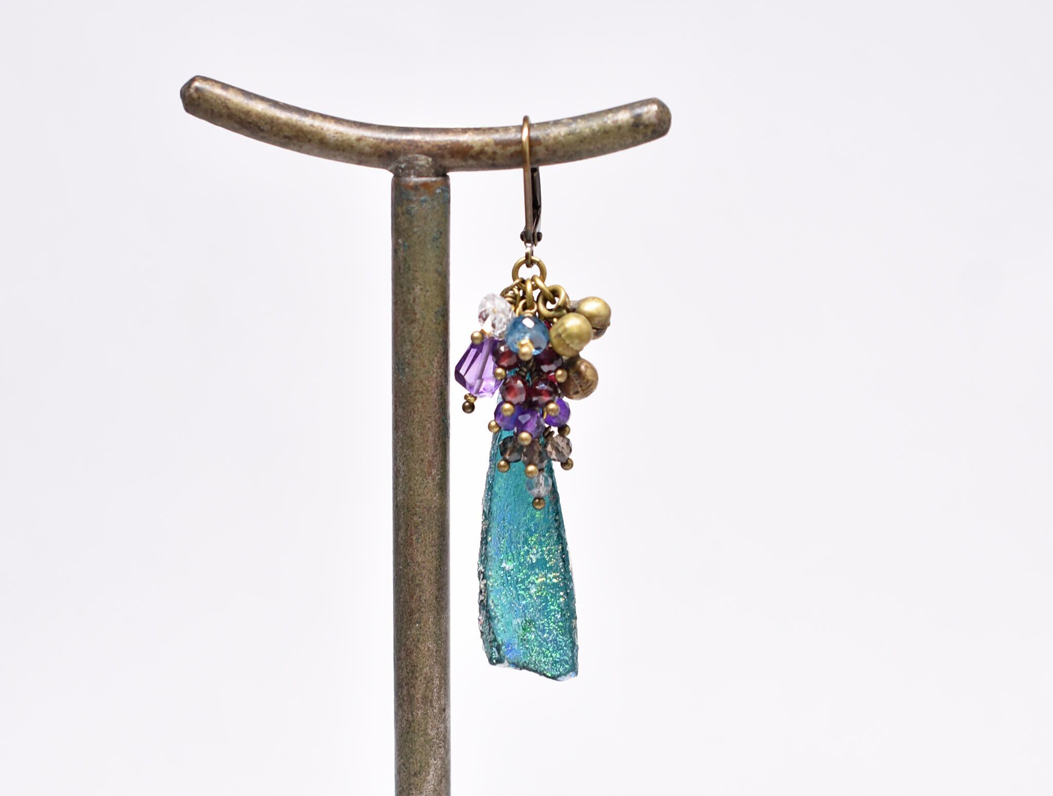 ブルーグリーン玉虫色銀化ローマングラスとたわわなストーンビーズ、民族鈴の片耳ピアス