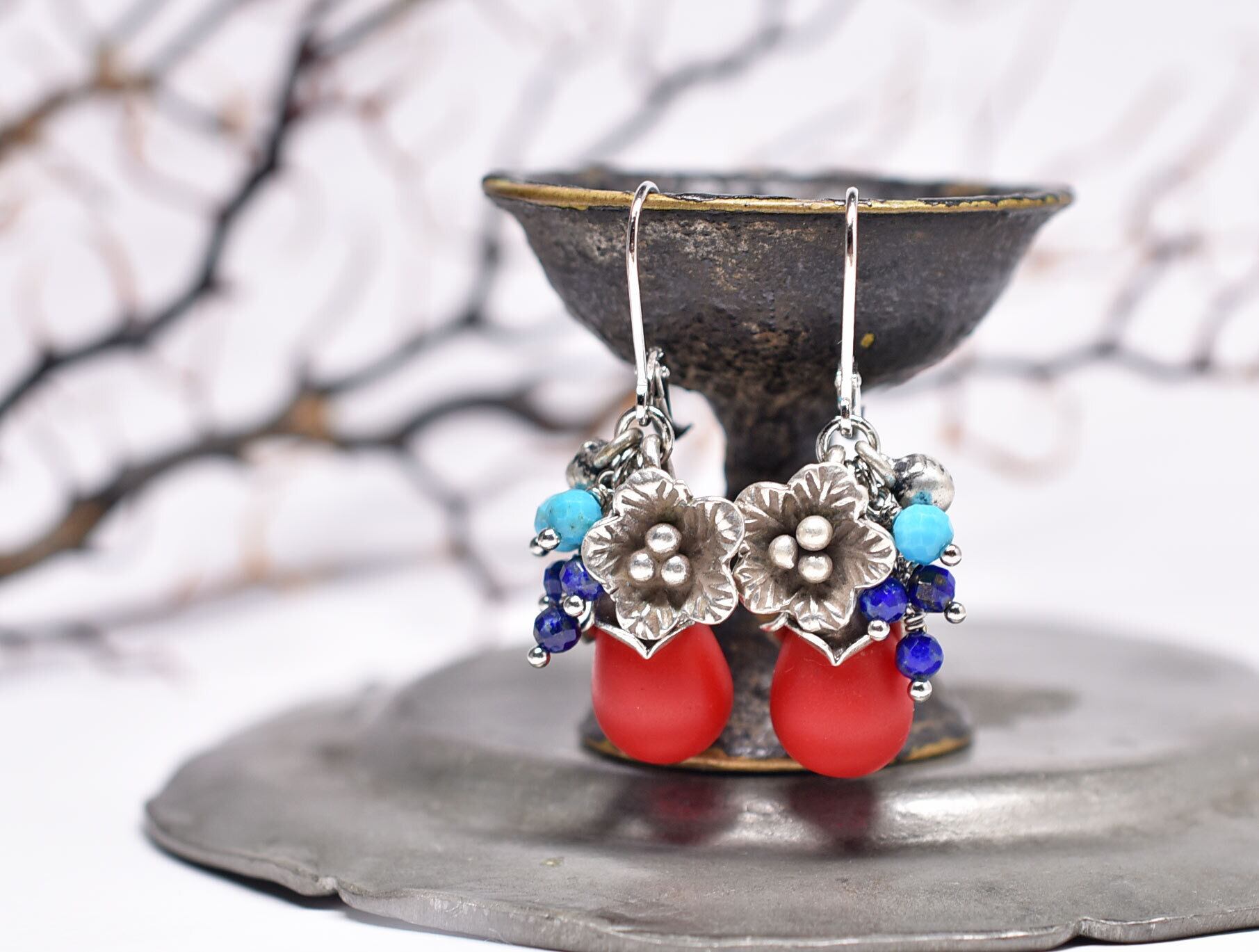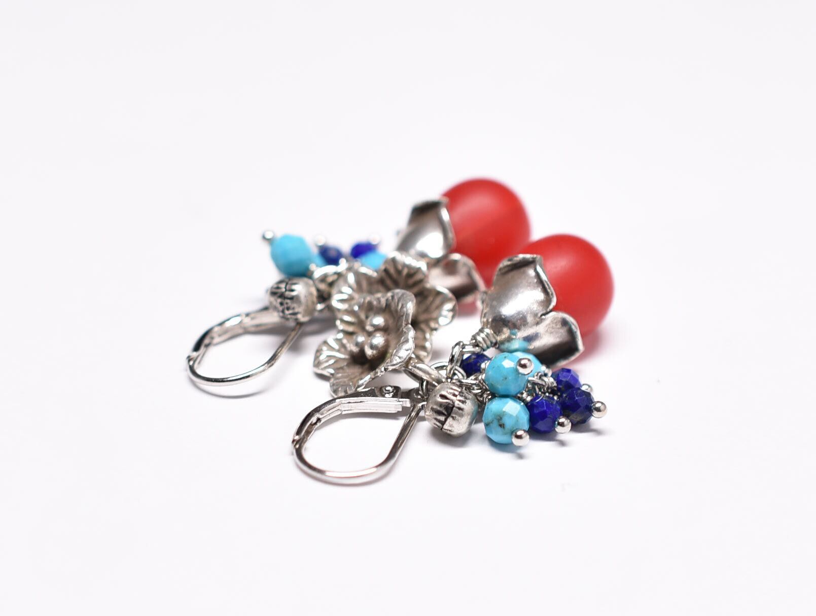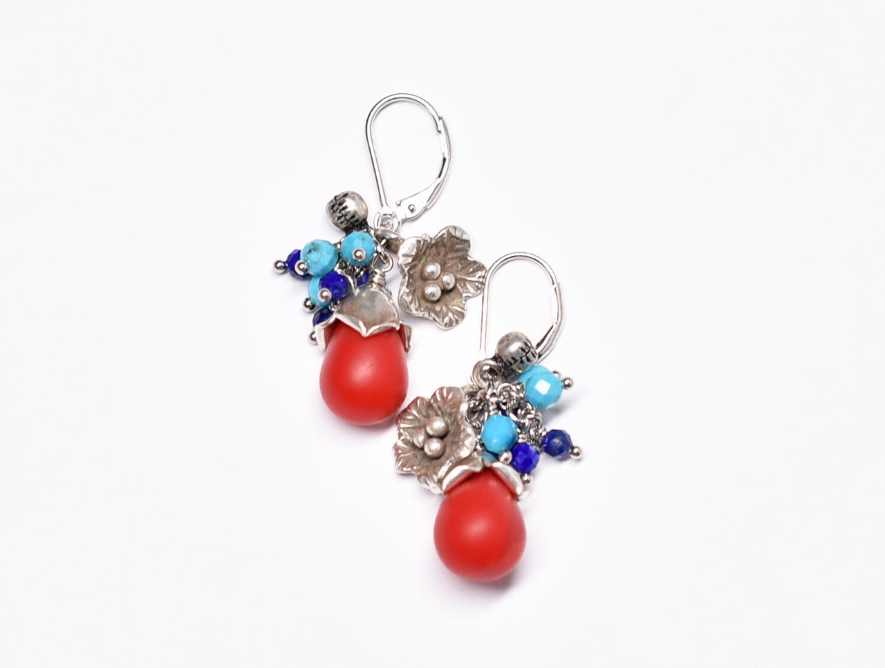 朱赤ウエディングビーズとたわわなラピス&ターコイズ、お花カレンシルバーと小さな鈴のピアス