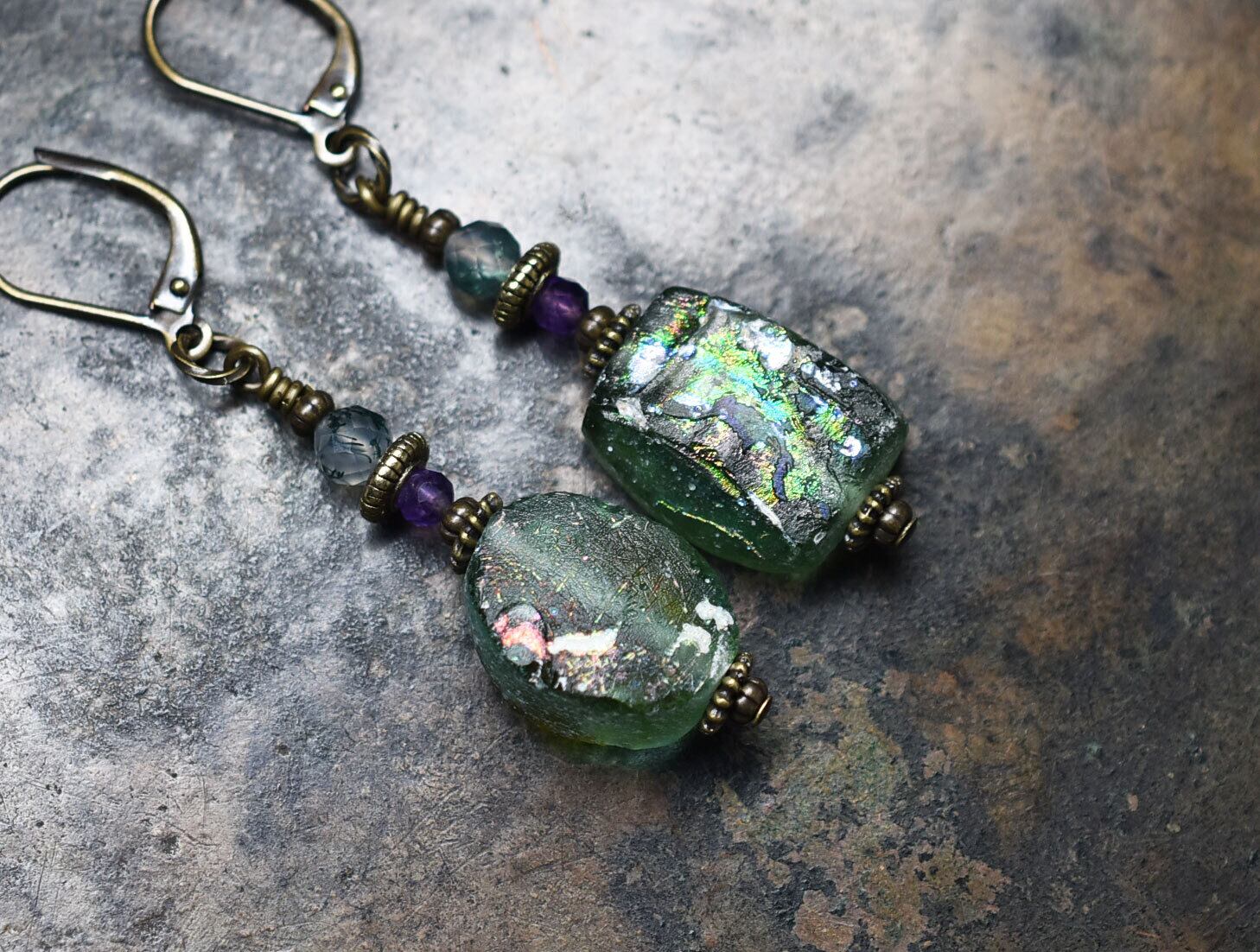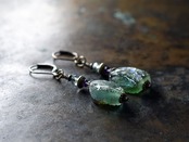 カーキ色銀化ローマングラスとアメジスト、モスアゲートのピアス