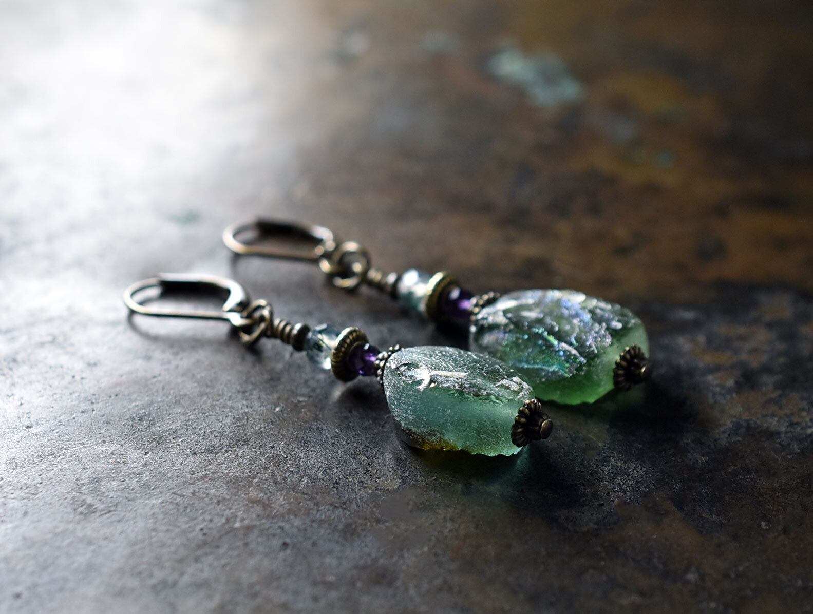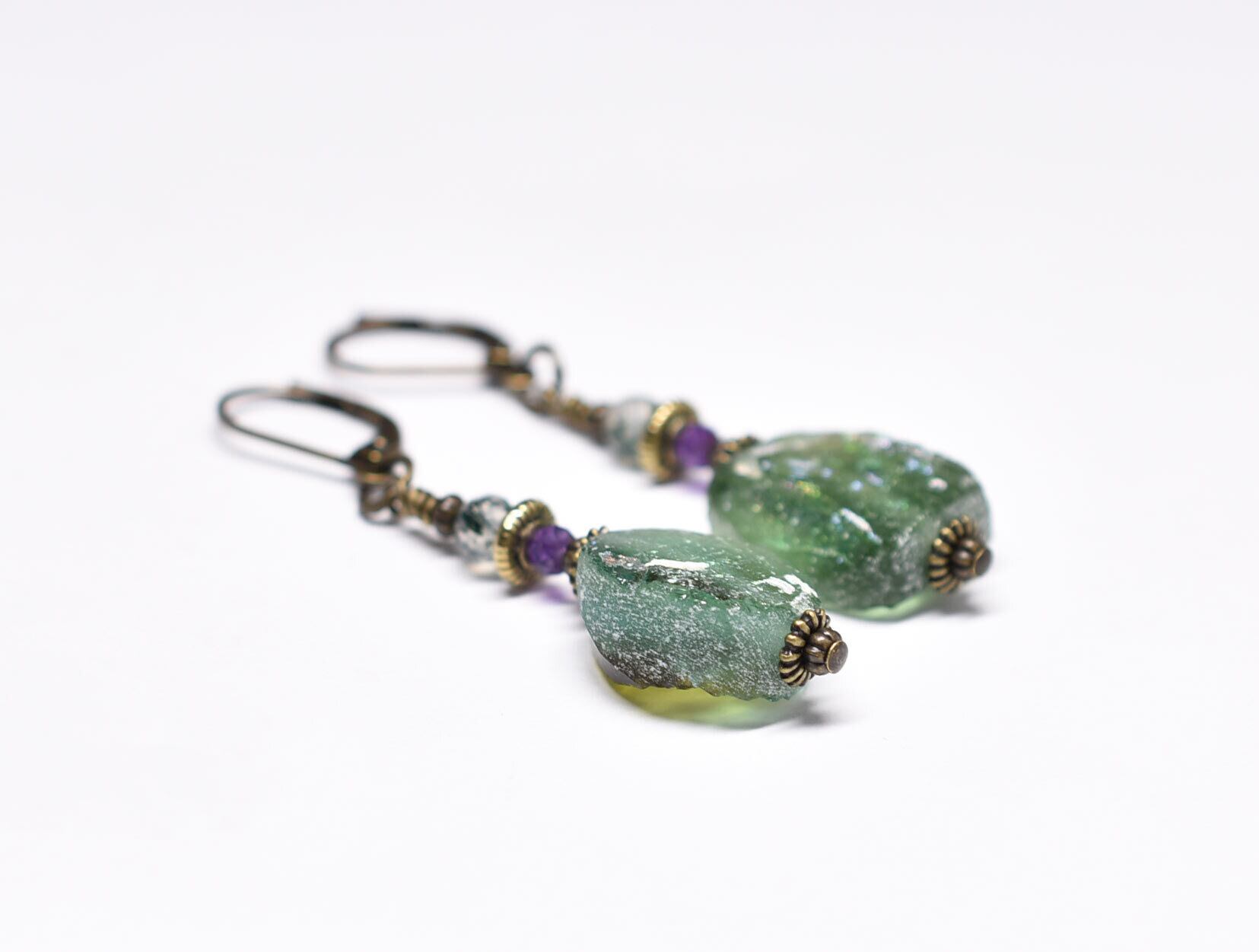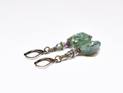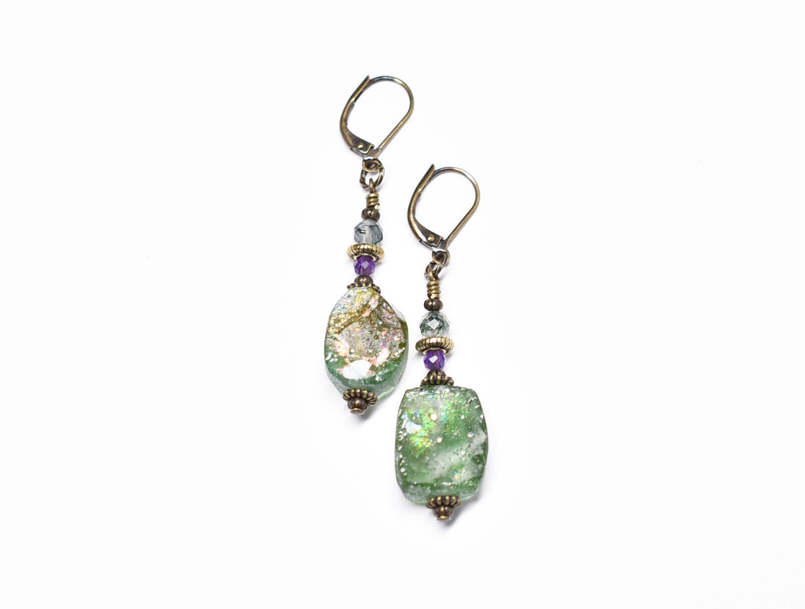 カーキ色銀化ローマングラスとアメジスト、モスアゲートを繋いだピアスです。
