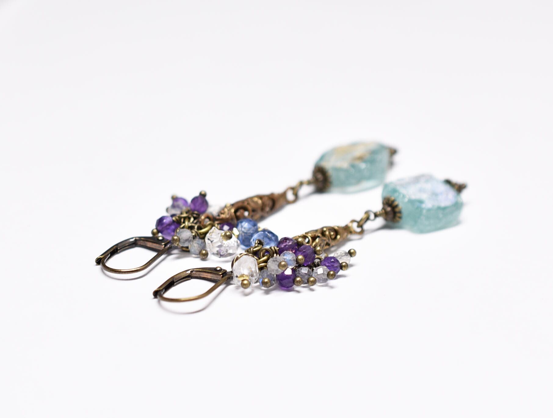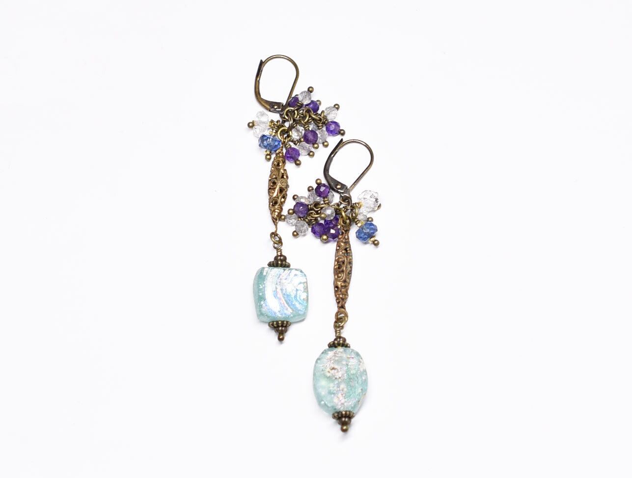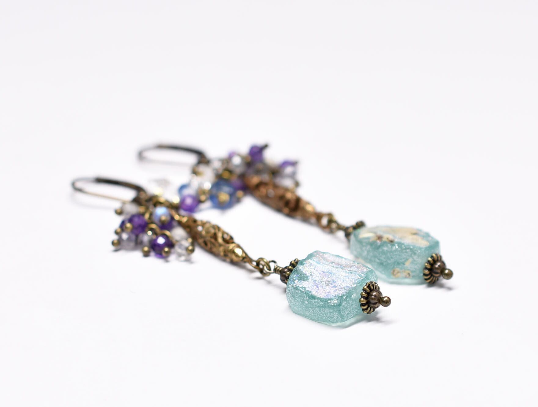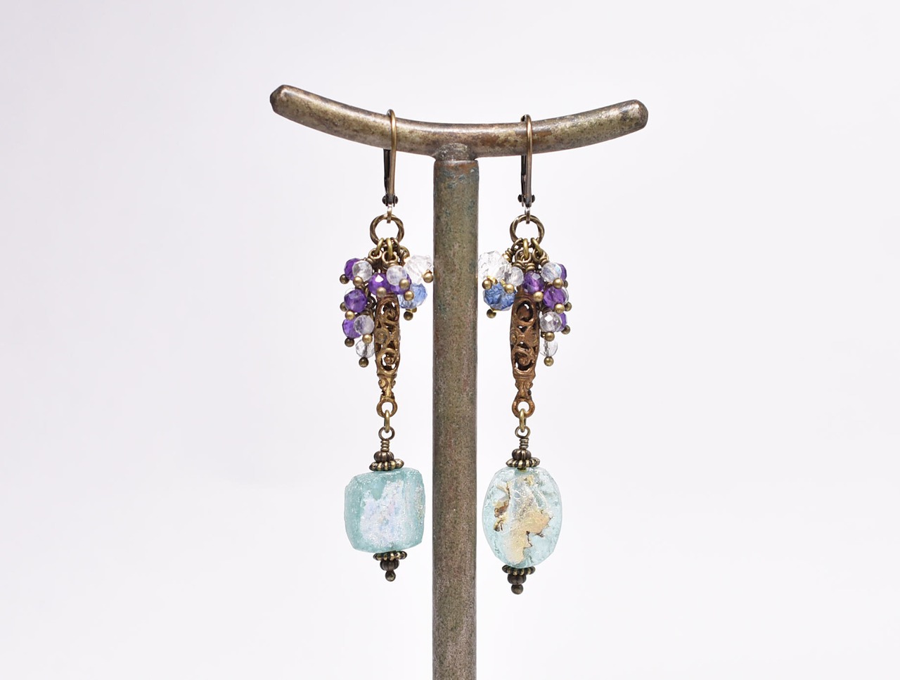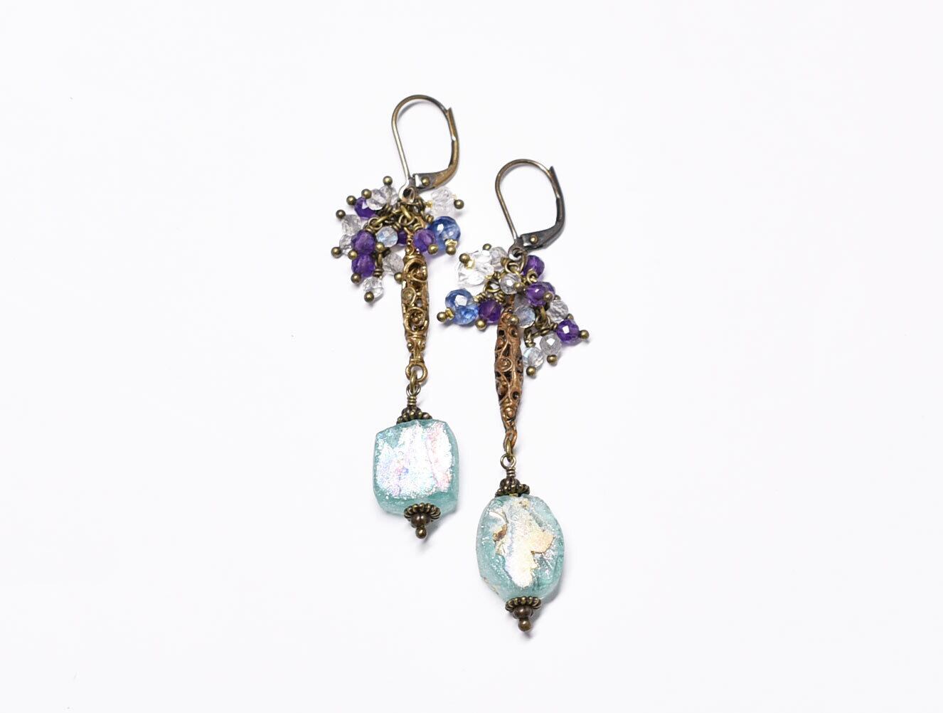 ソーダブルー銀化ローマングラスと繊細細工ブラス、たわわなストーンビーズのピアス