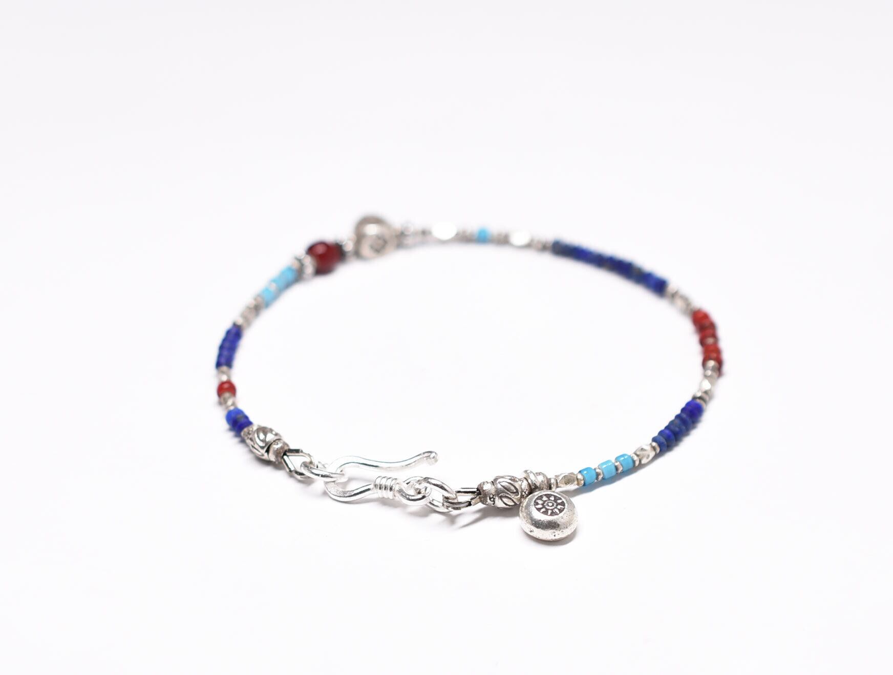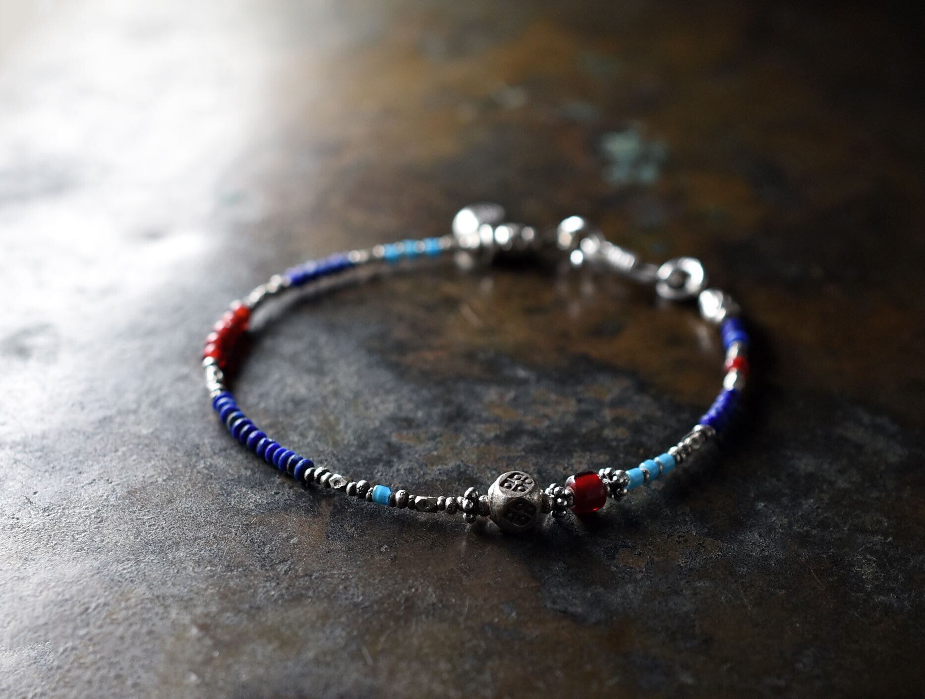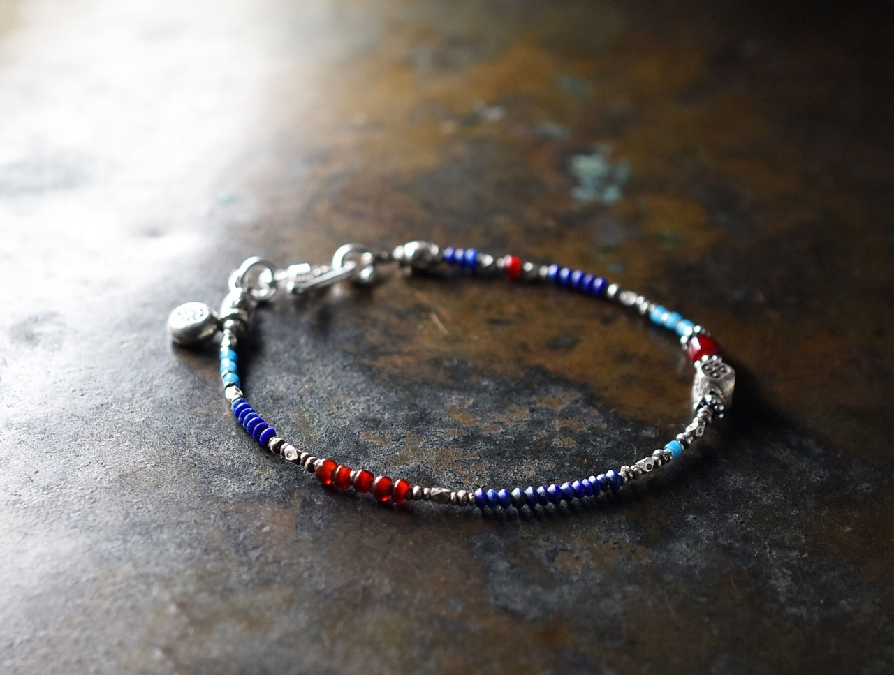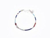 ラピスとスカイブルー&濃赤ホワイトハーツ 、カレンシルバーを繋いだ華奢なブレスです。