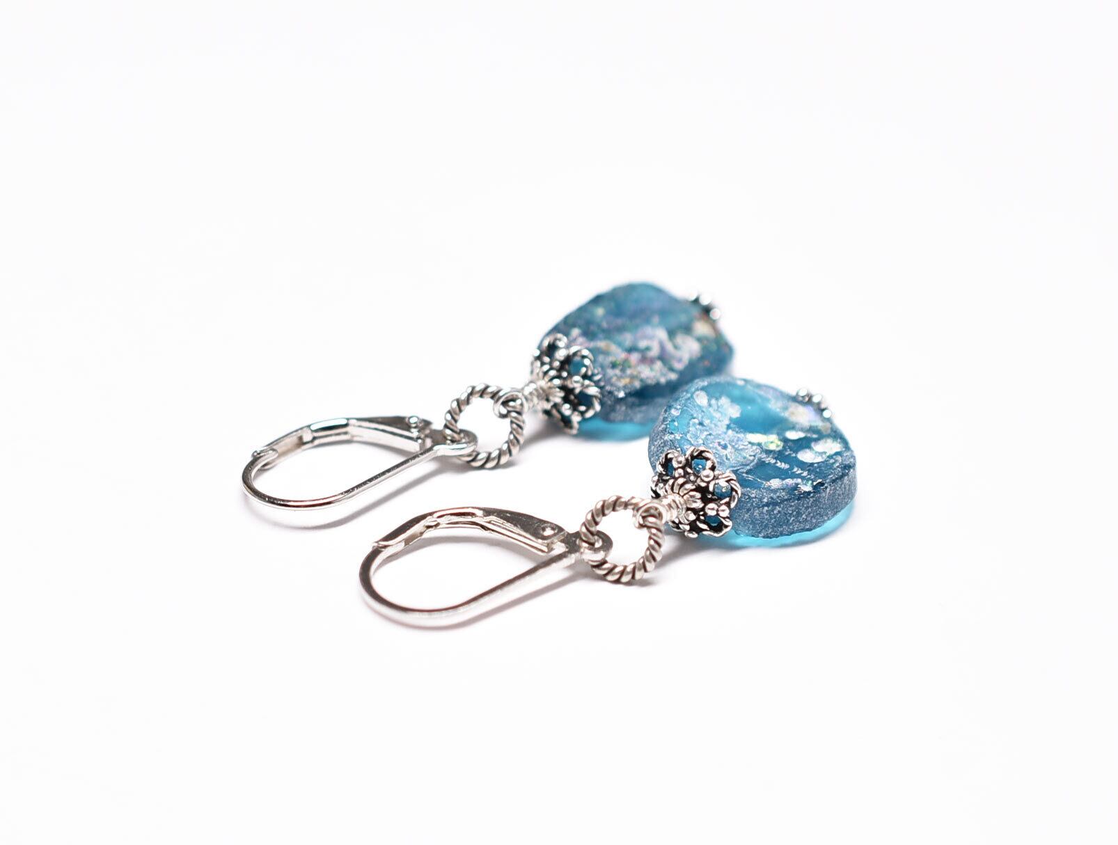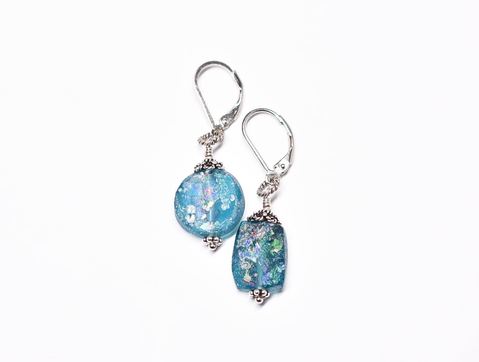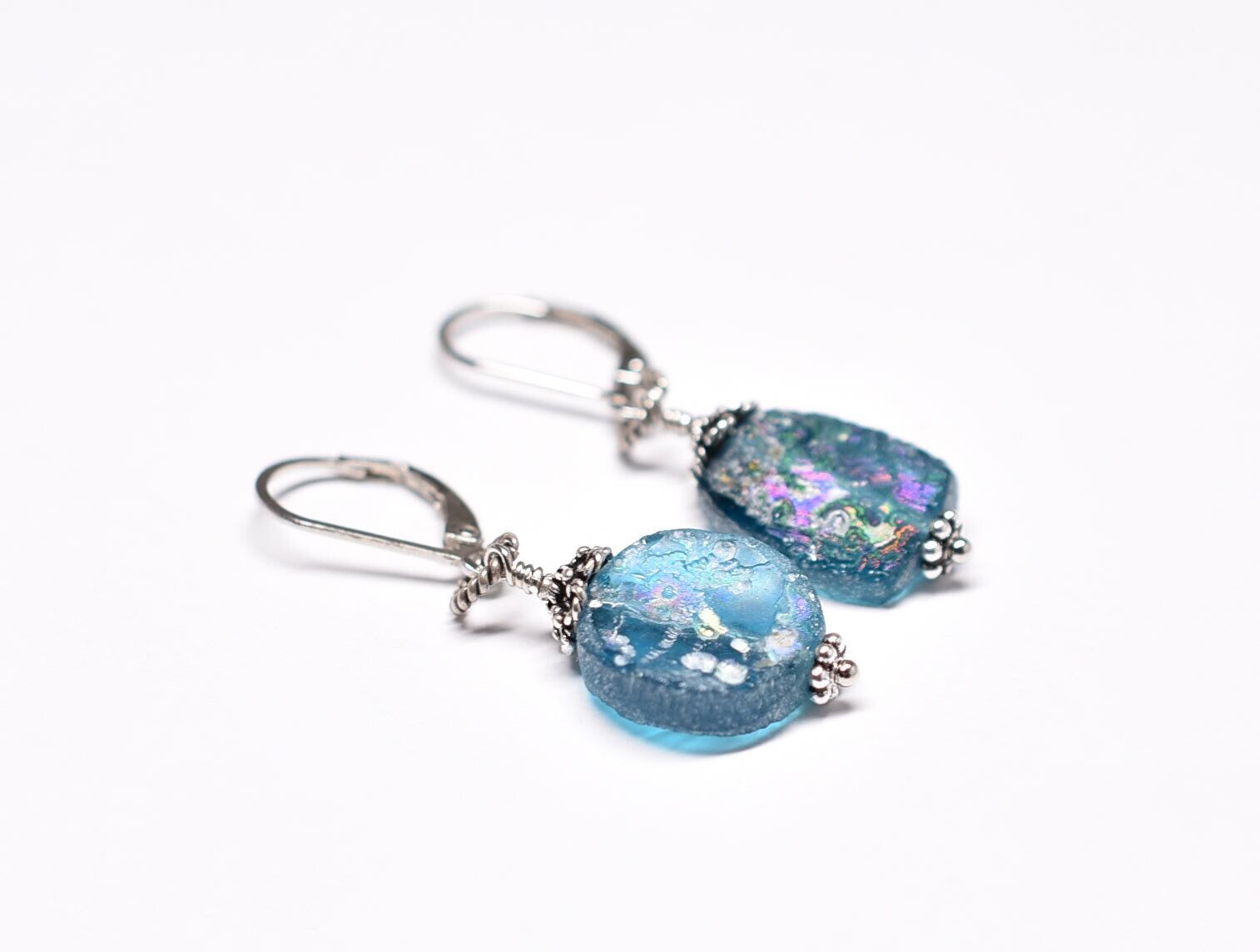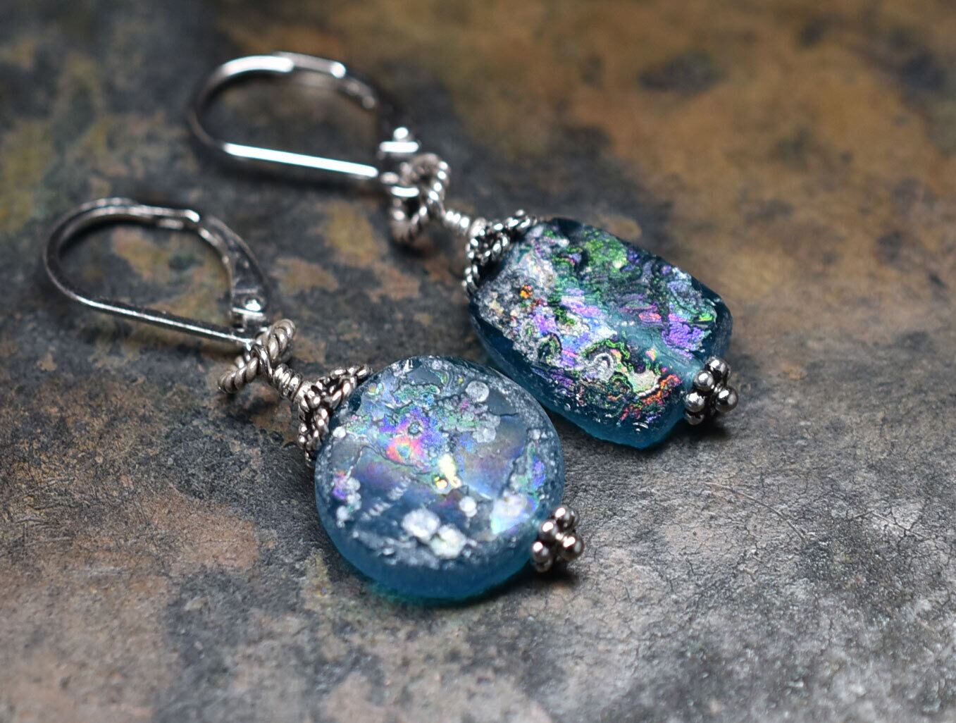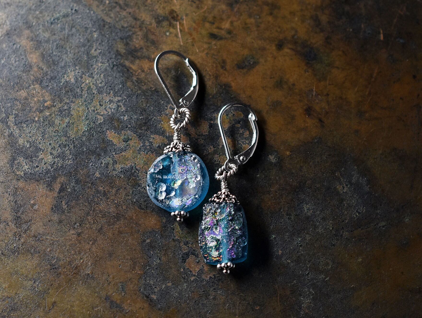 美しい色合いの古代ガラスに、儚げな銀化が現れたピアスです。