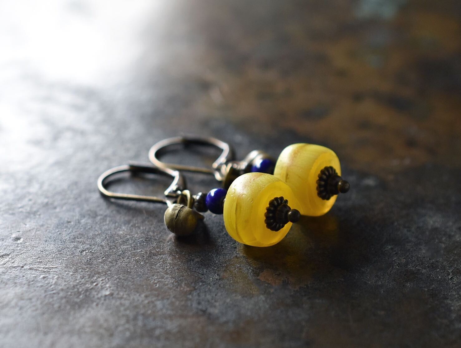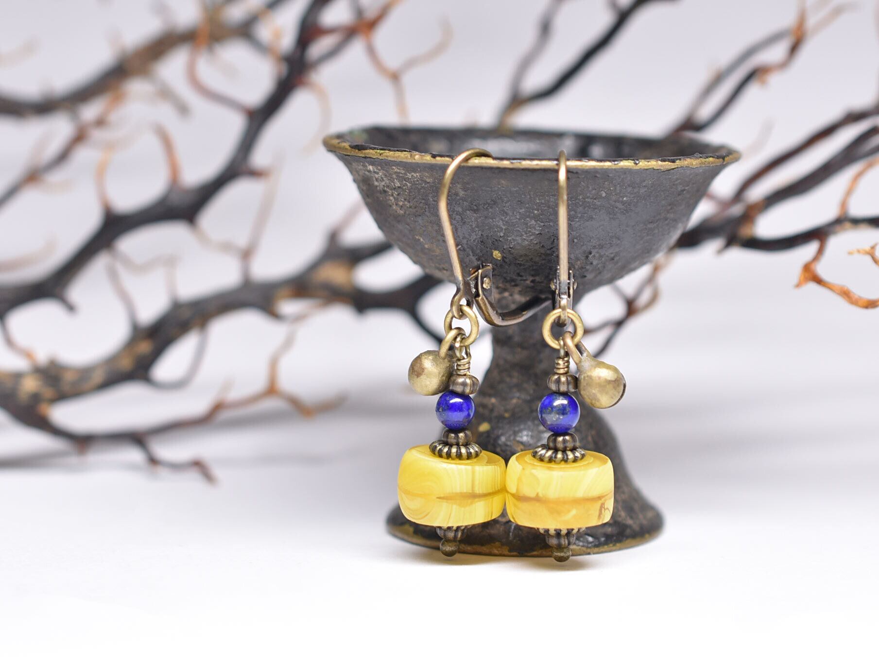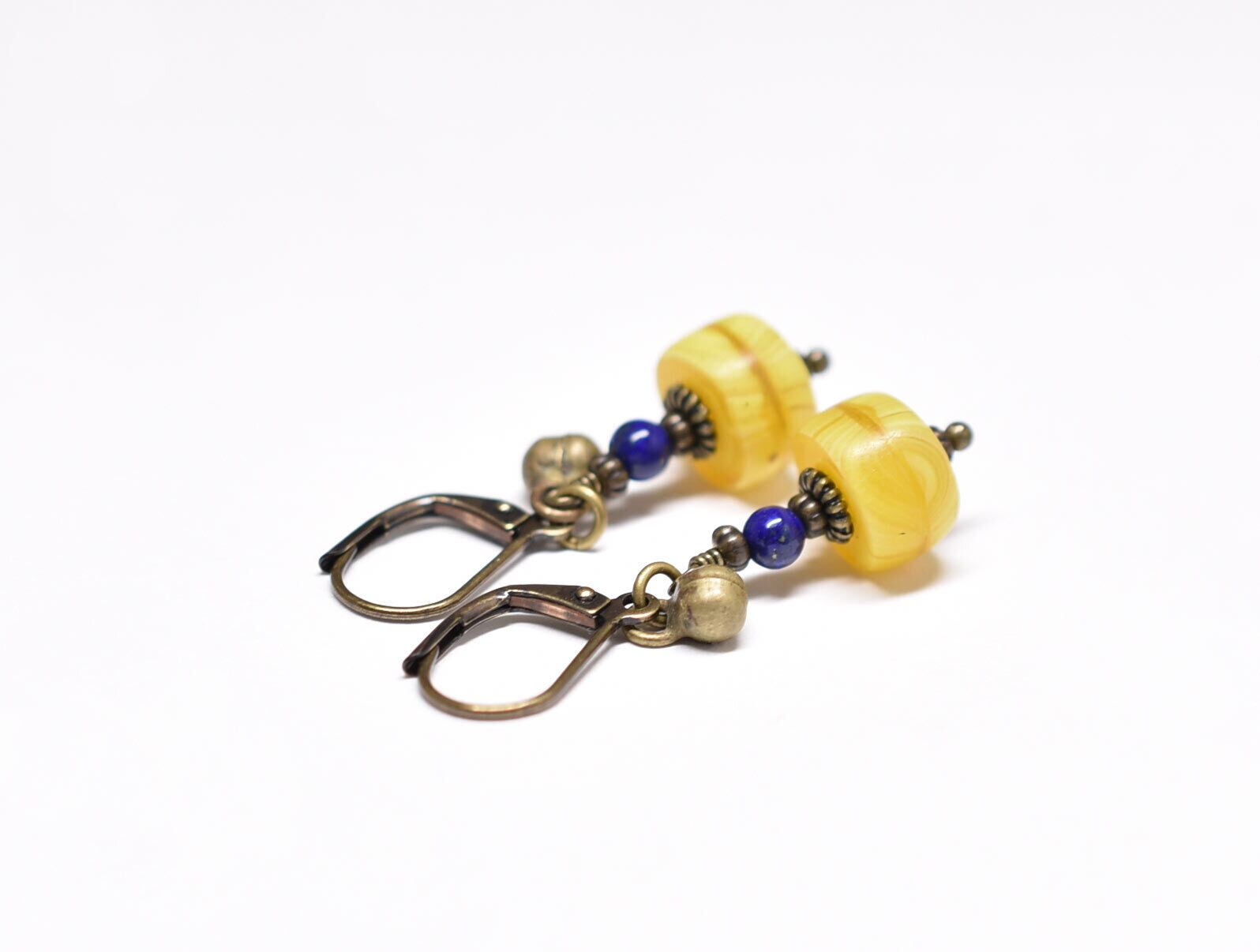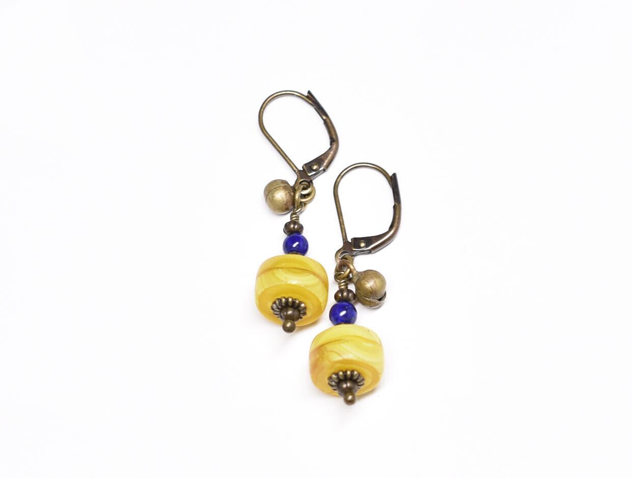 イエローカカンバビーズとラピス、民族鈴のピアス