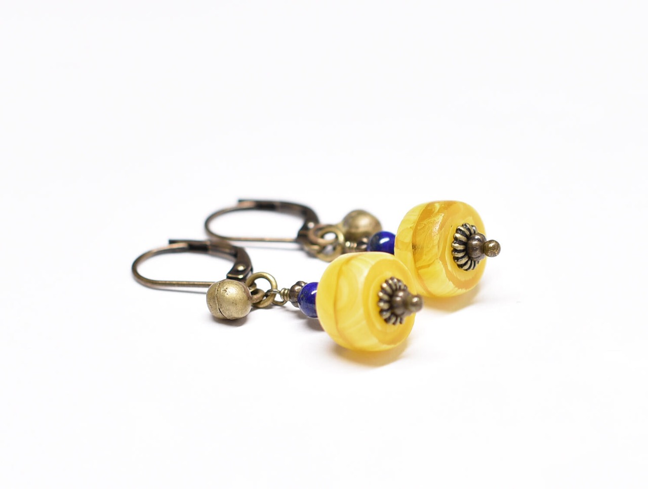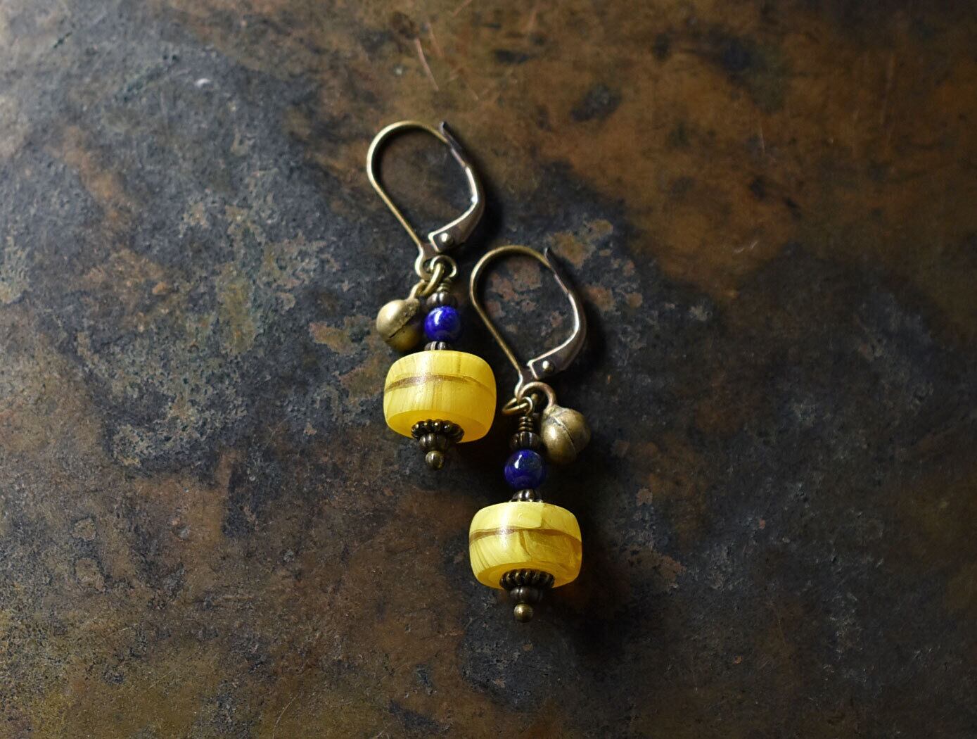 イエローカカンバビーズとラピス、民族鈴を繋いだピアスです。