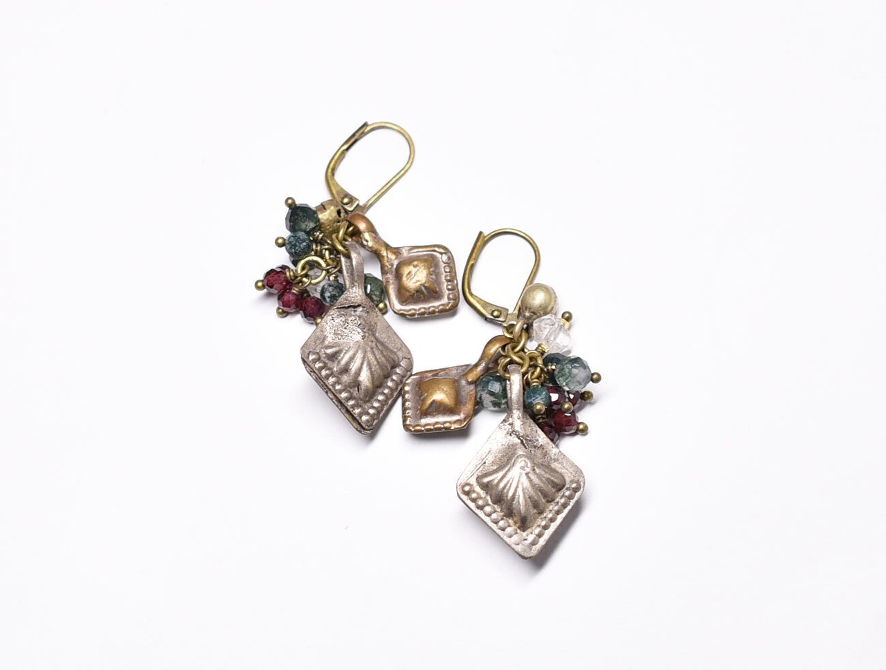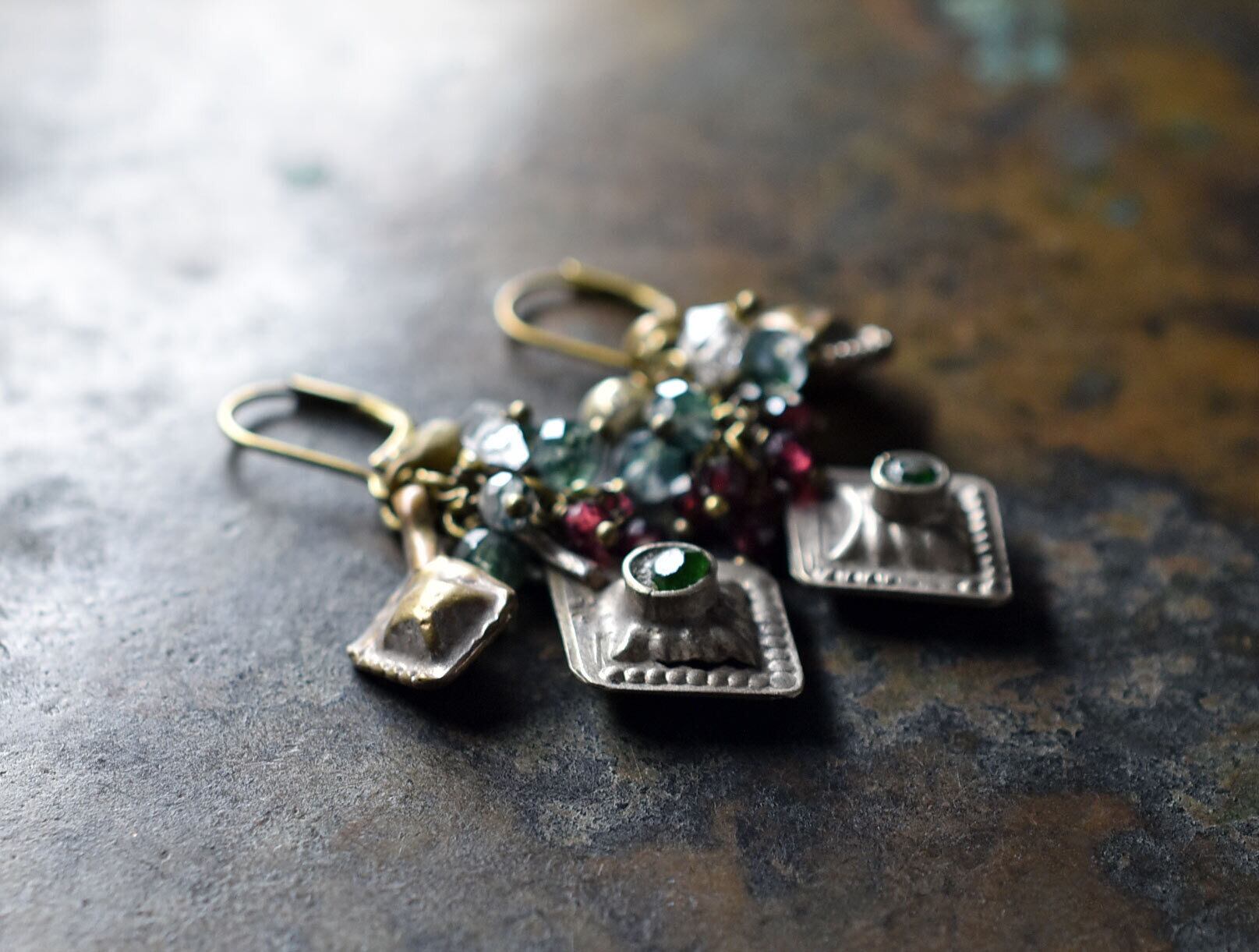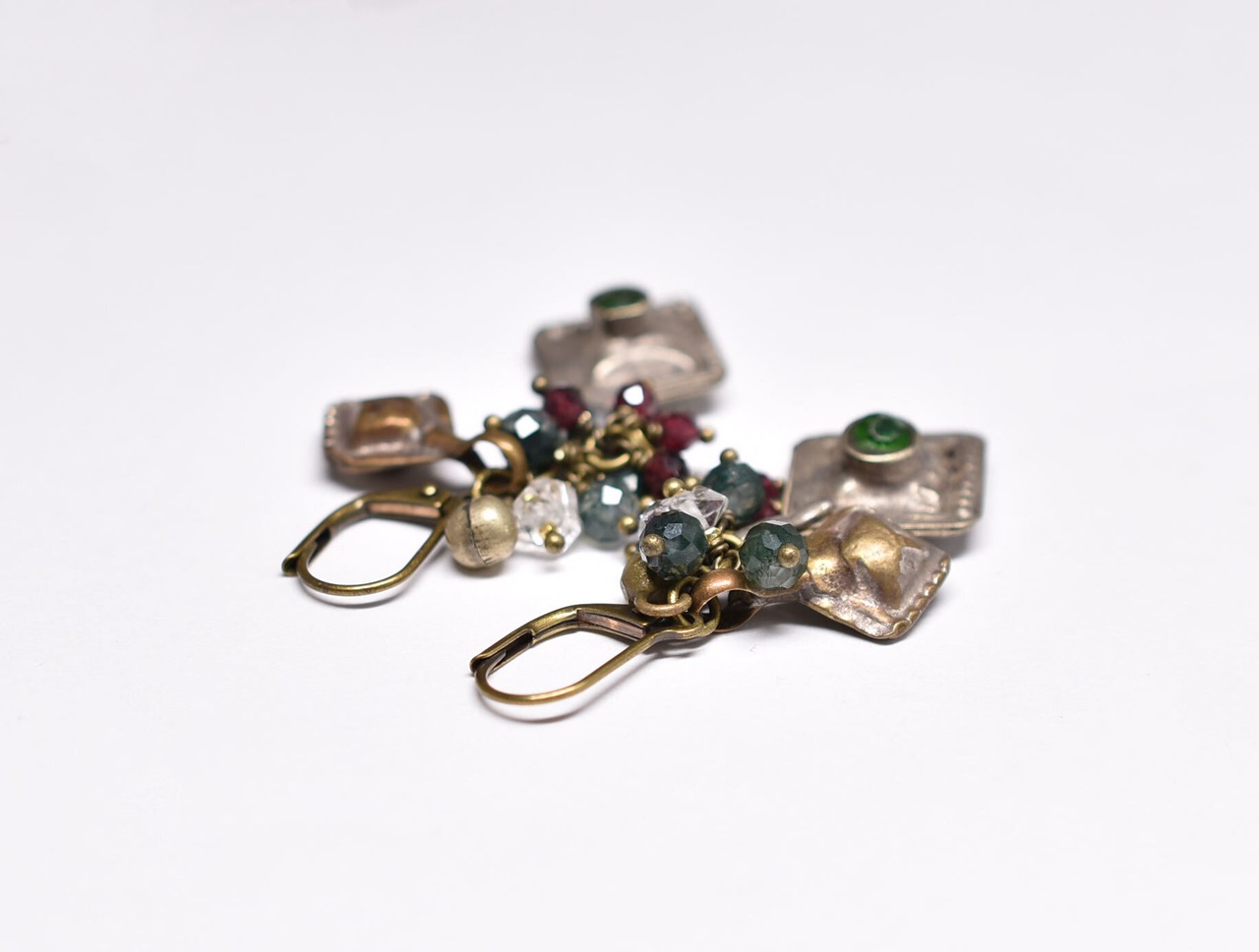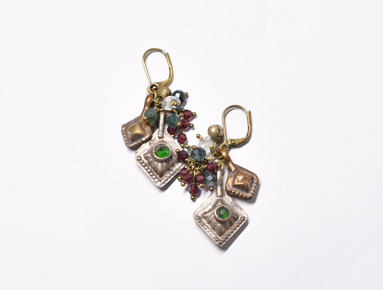 素材:ミックスメタル、ガーネット、モスアゲート、ハーキマーダイヤモンド、真鍮、カレンシルバー
