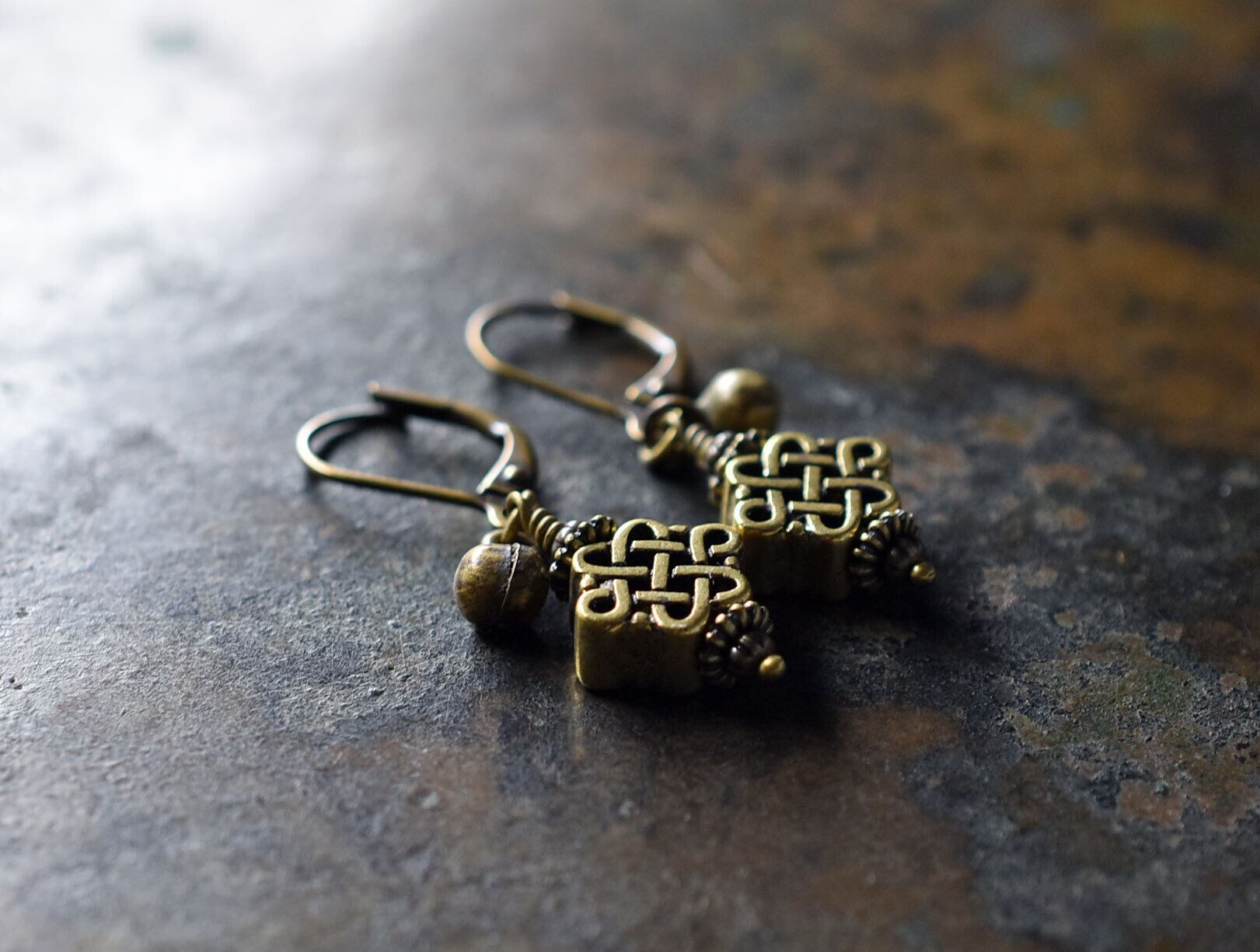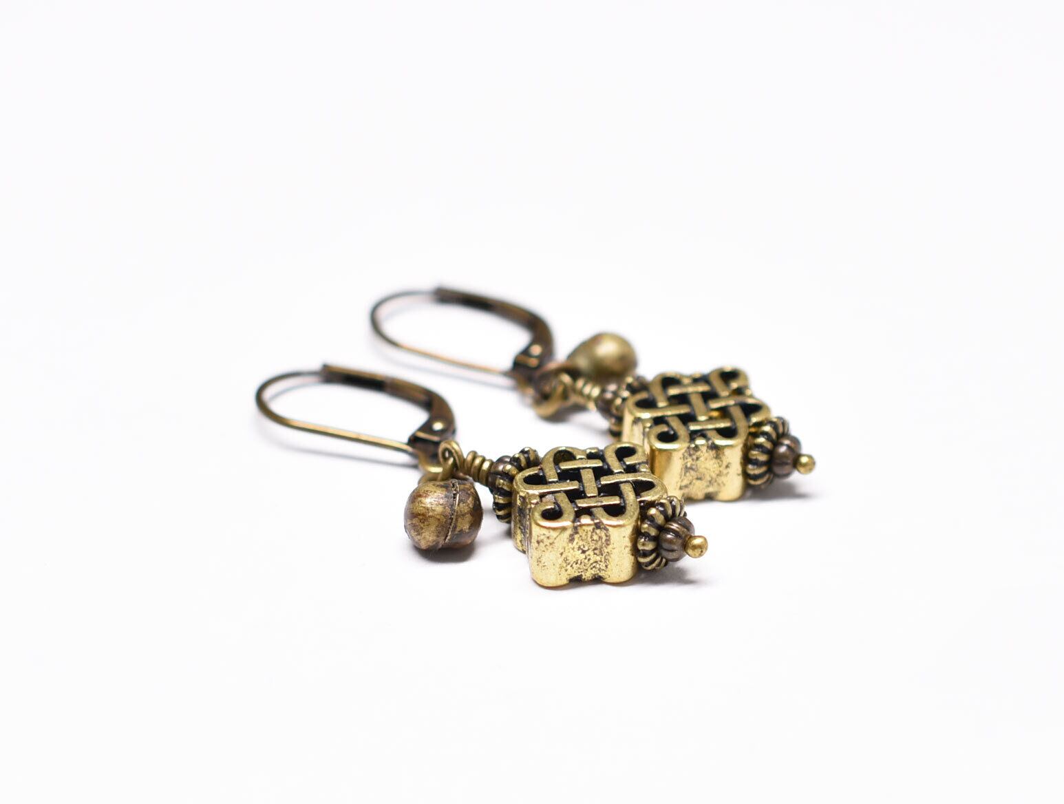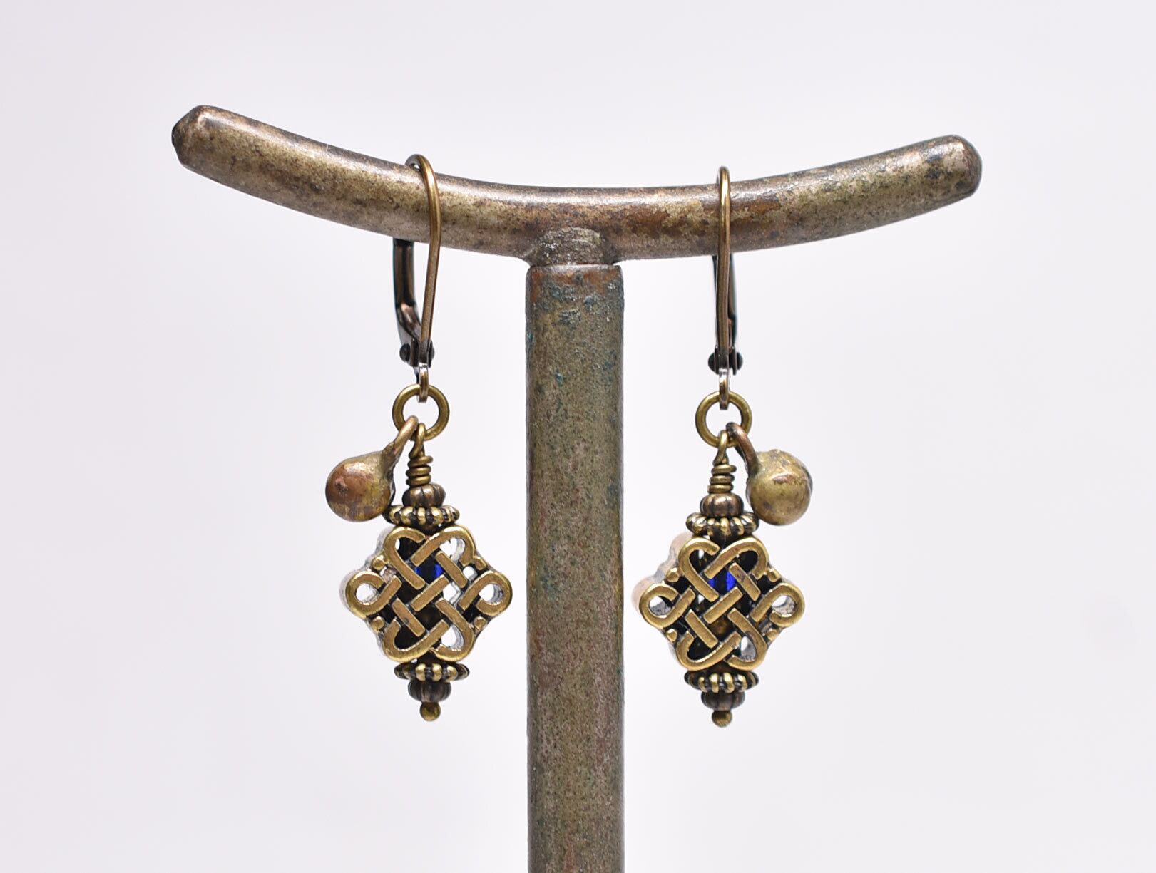 真鍮のエンドレスノットと民族鈴を繋いだピアスです。