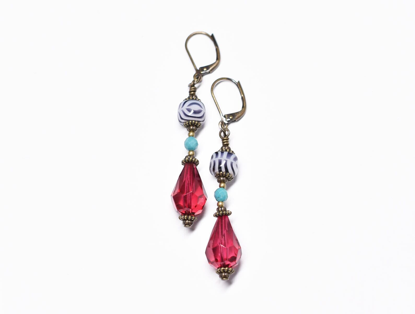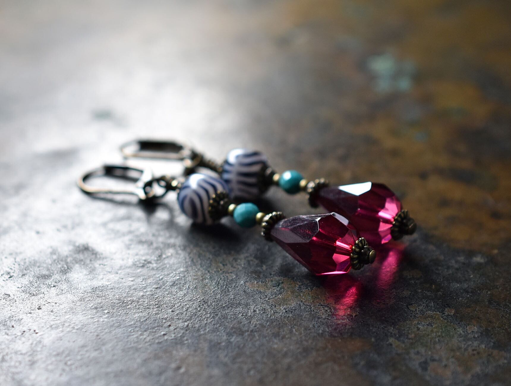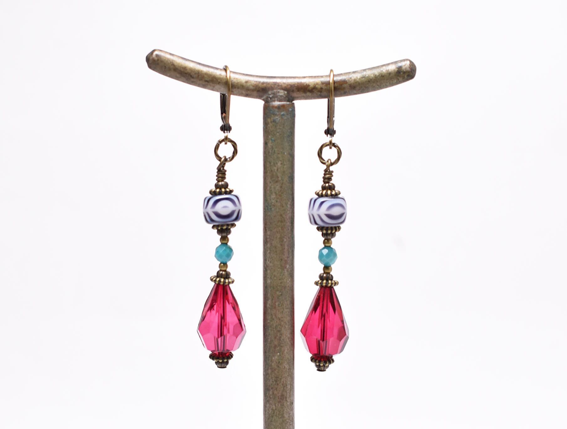 ゼブラ柄ヴィンテージビーズとラズベリーカラービーズ、ターコイズのピアス