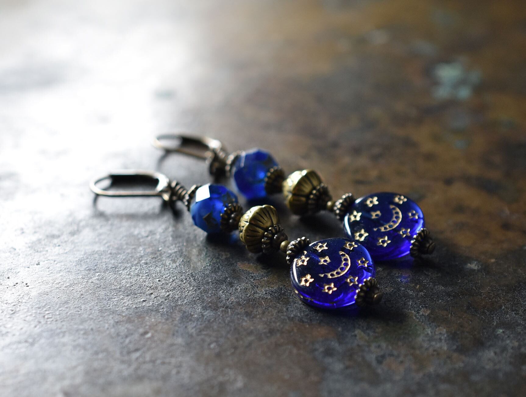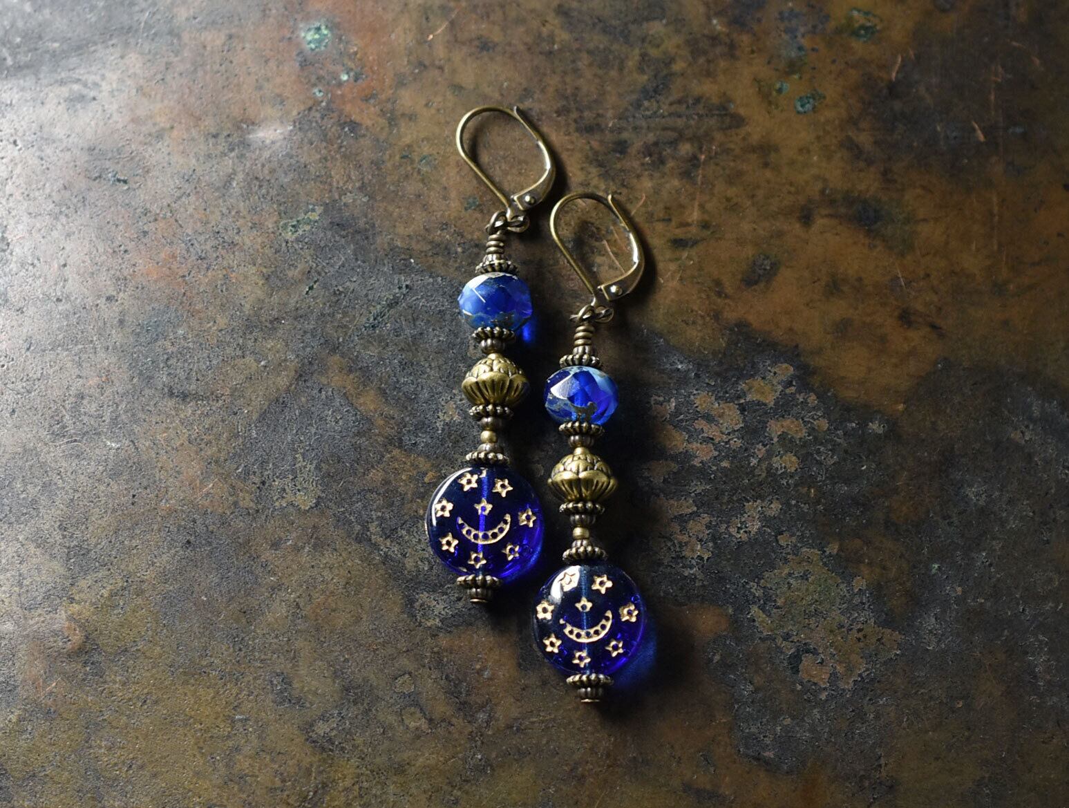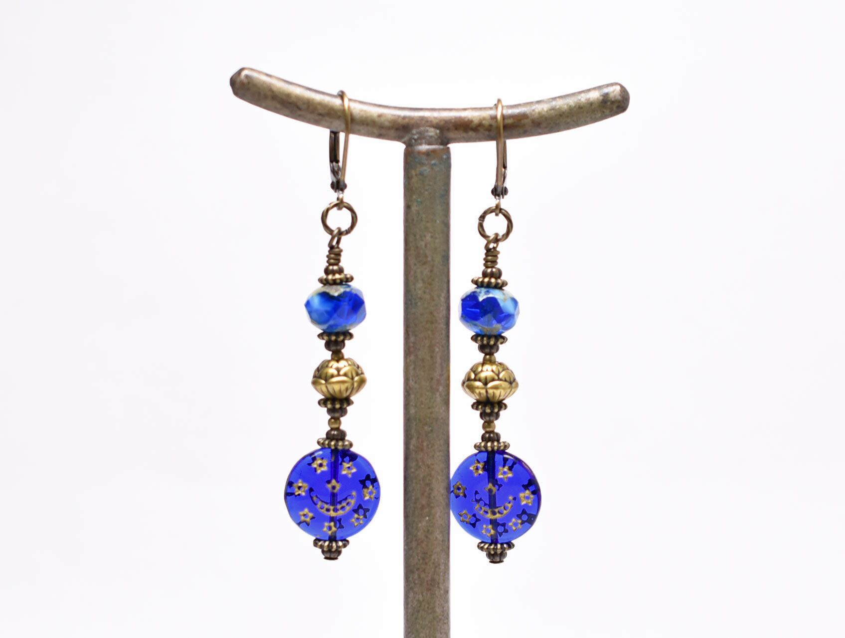 ブルー聖者のビーズとチェコヴィンテージビーズ、蓮華ブラスのピアス