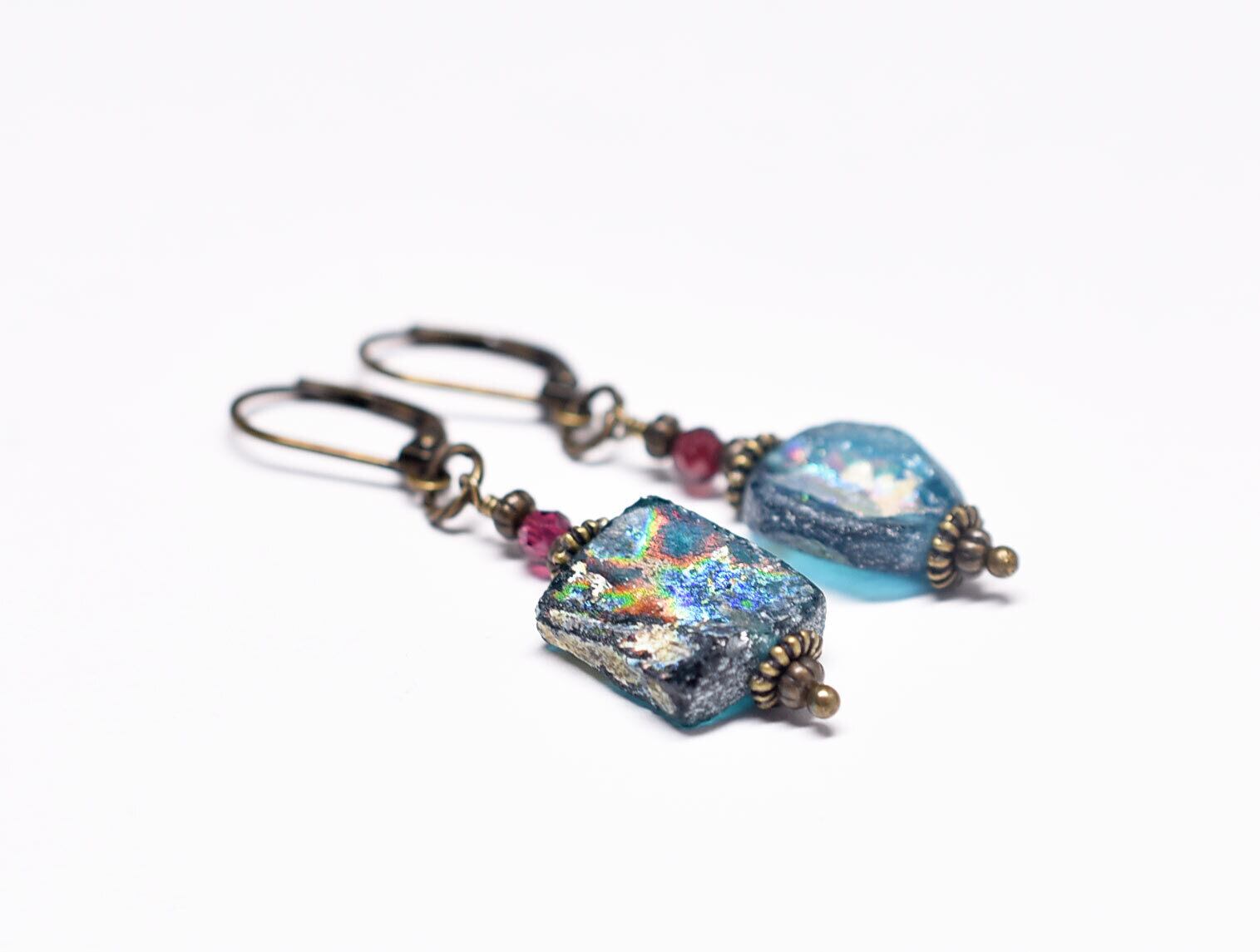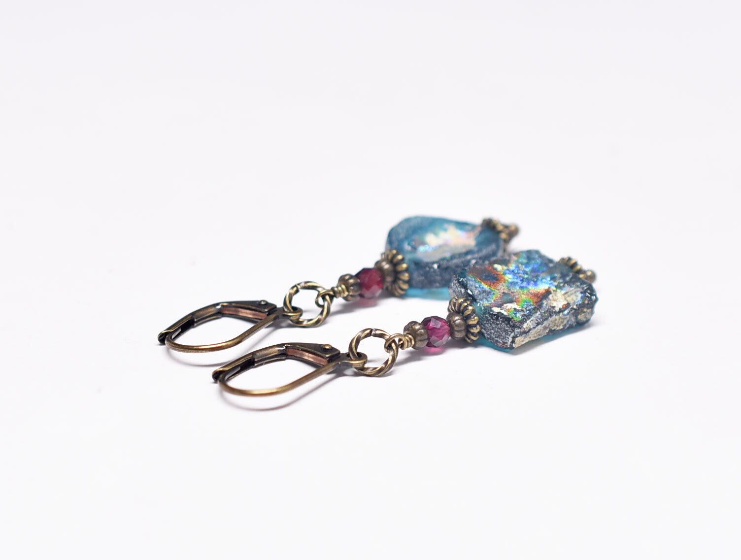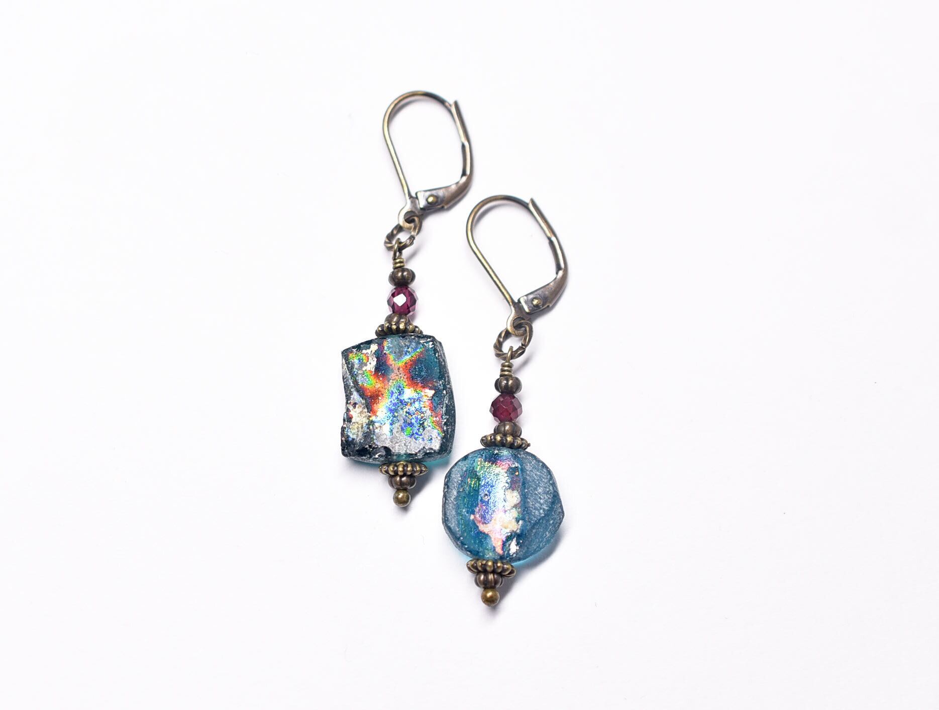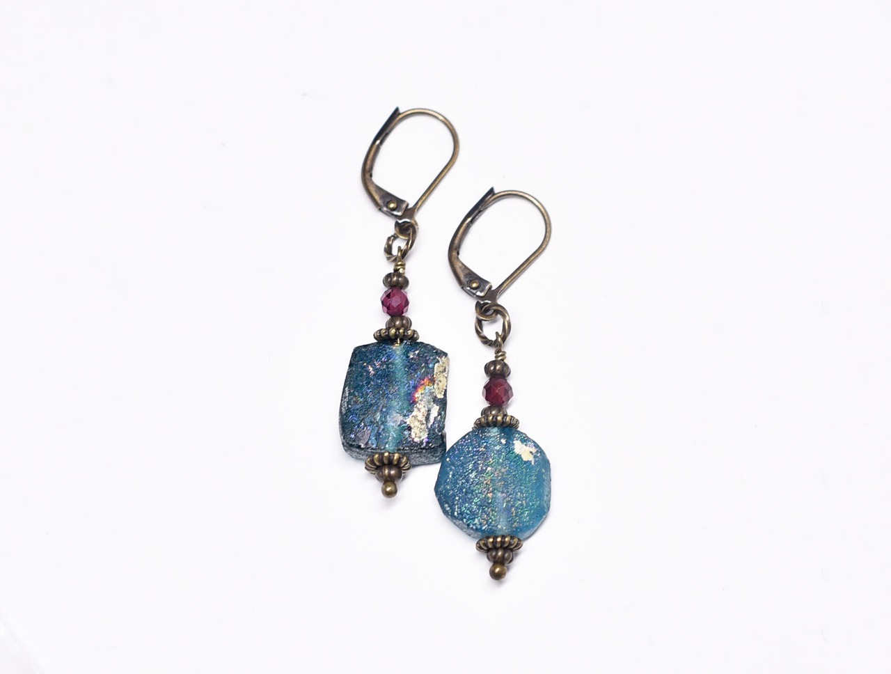 ブルーグリーン銀化ローマングラスとガーネットのピアス