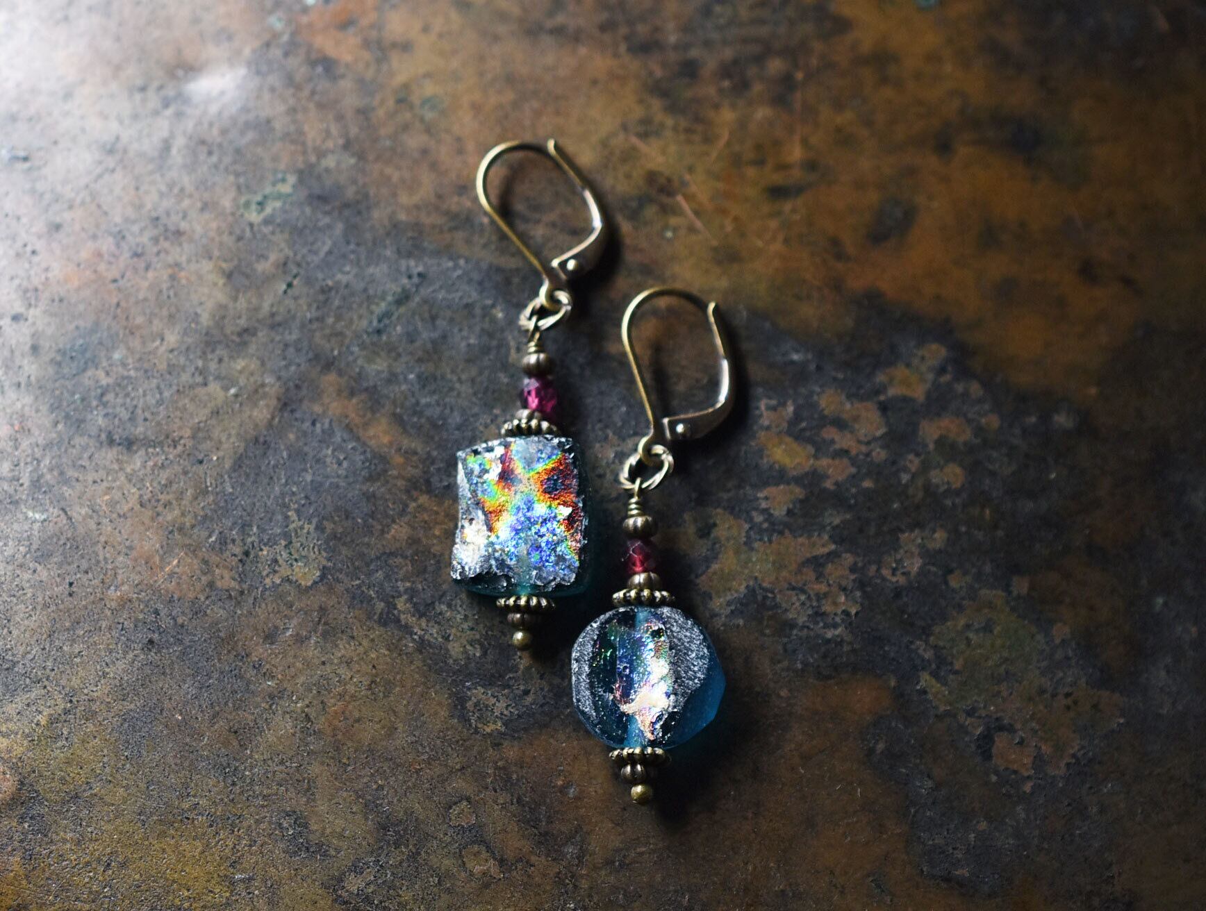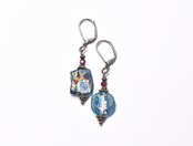 ブルーグリーン銀化ローマングラスとガーネットを繋いだピアスです。