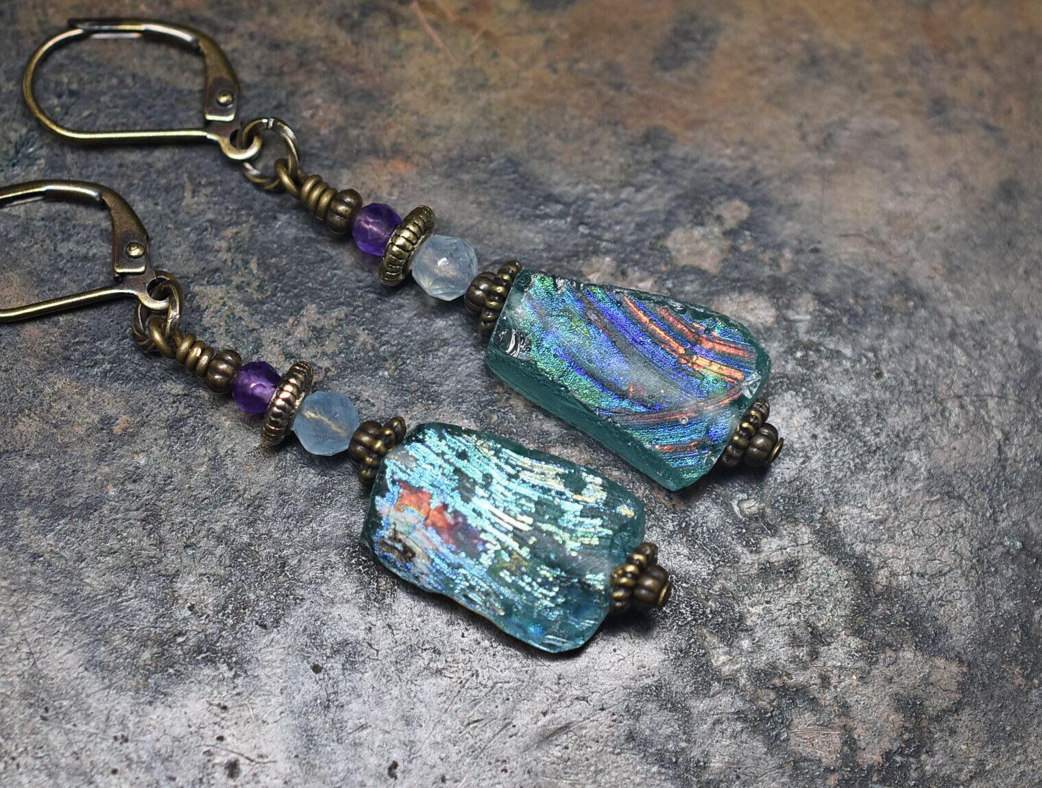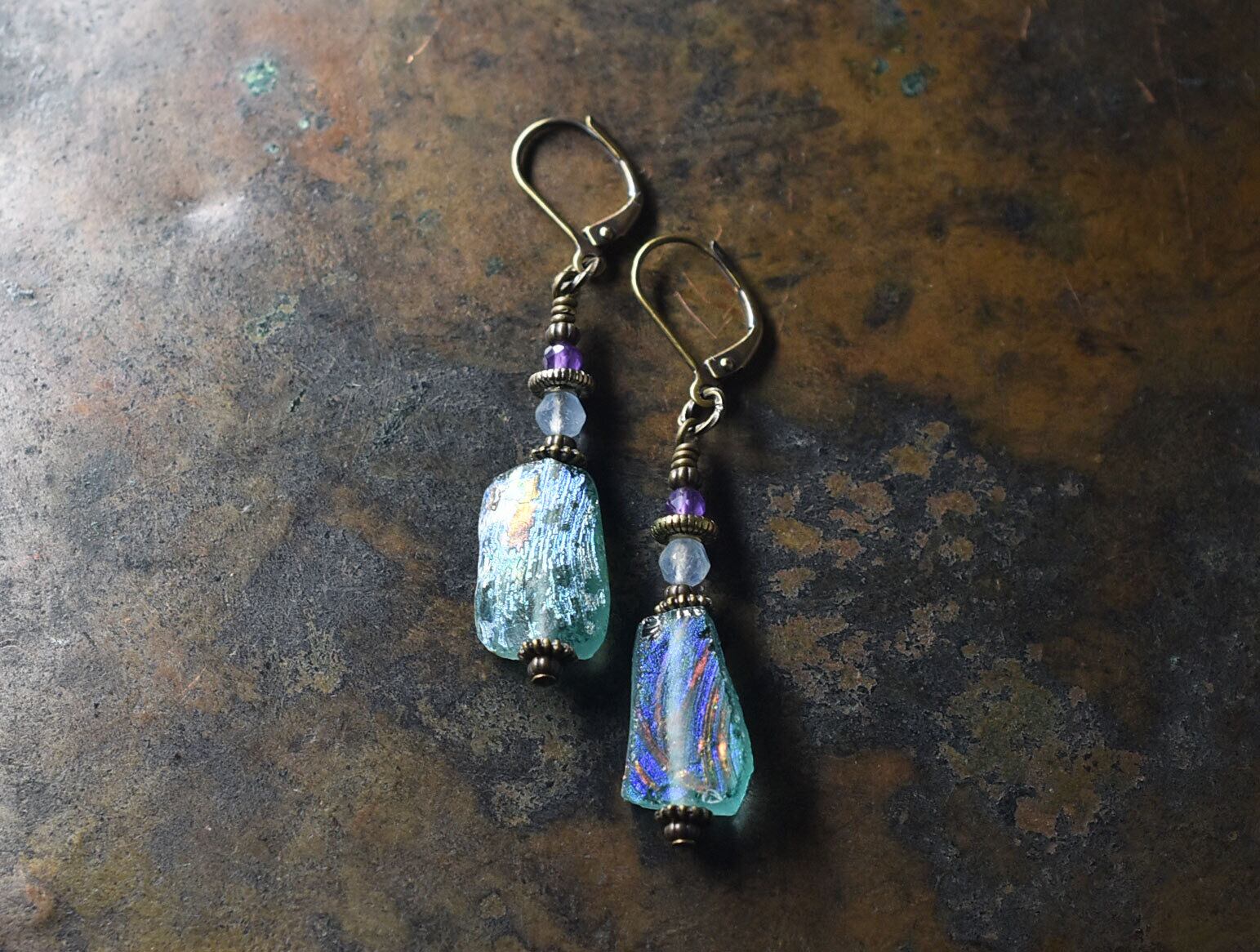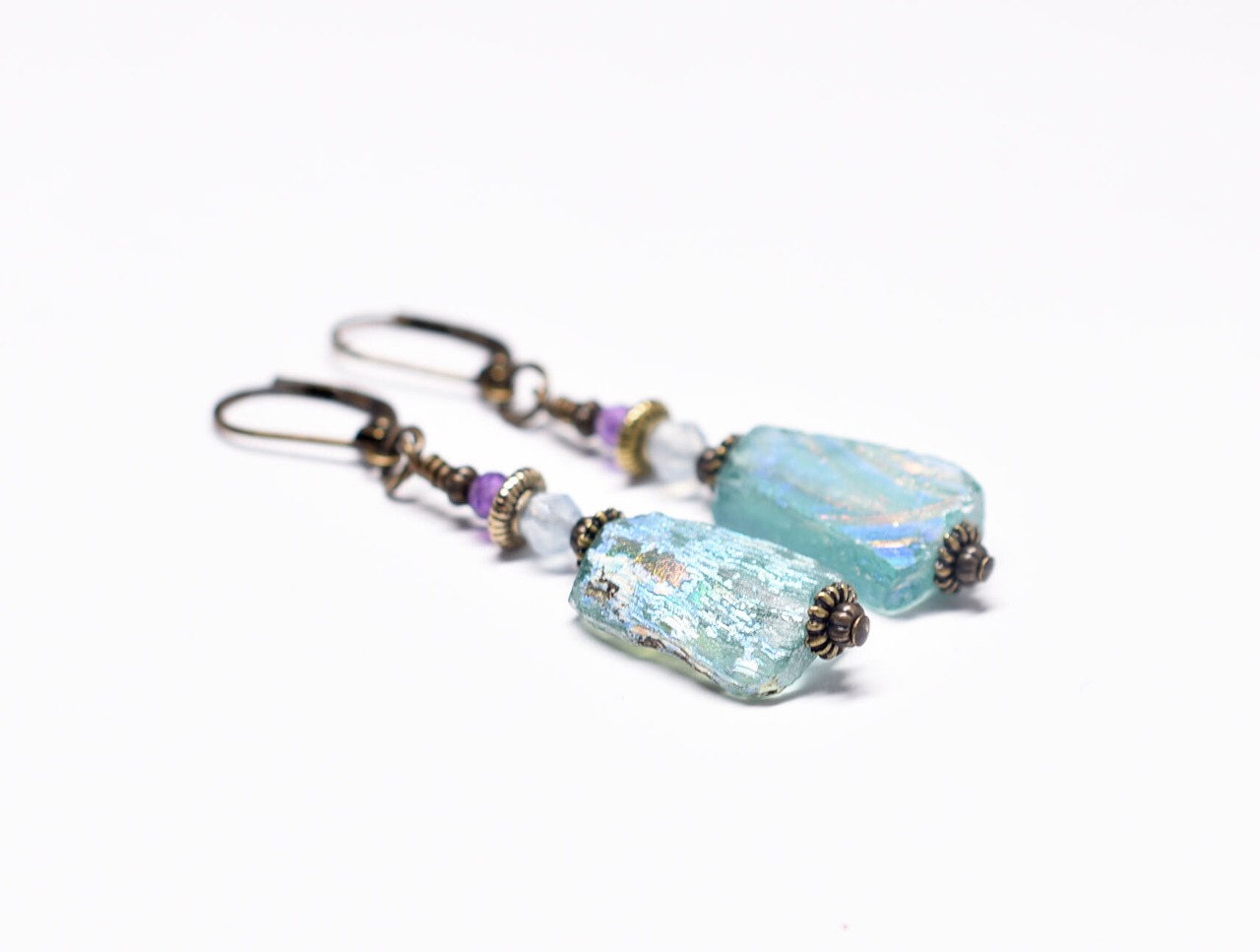 ソーダブルー銀化ローマングラスとアクアマリン、アメジストを繋いだピアスです。