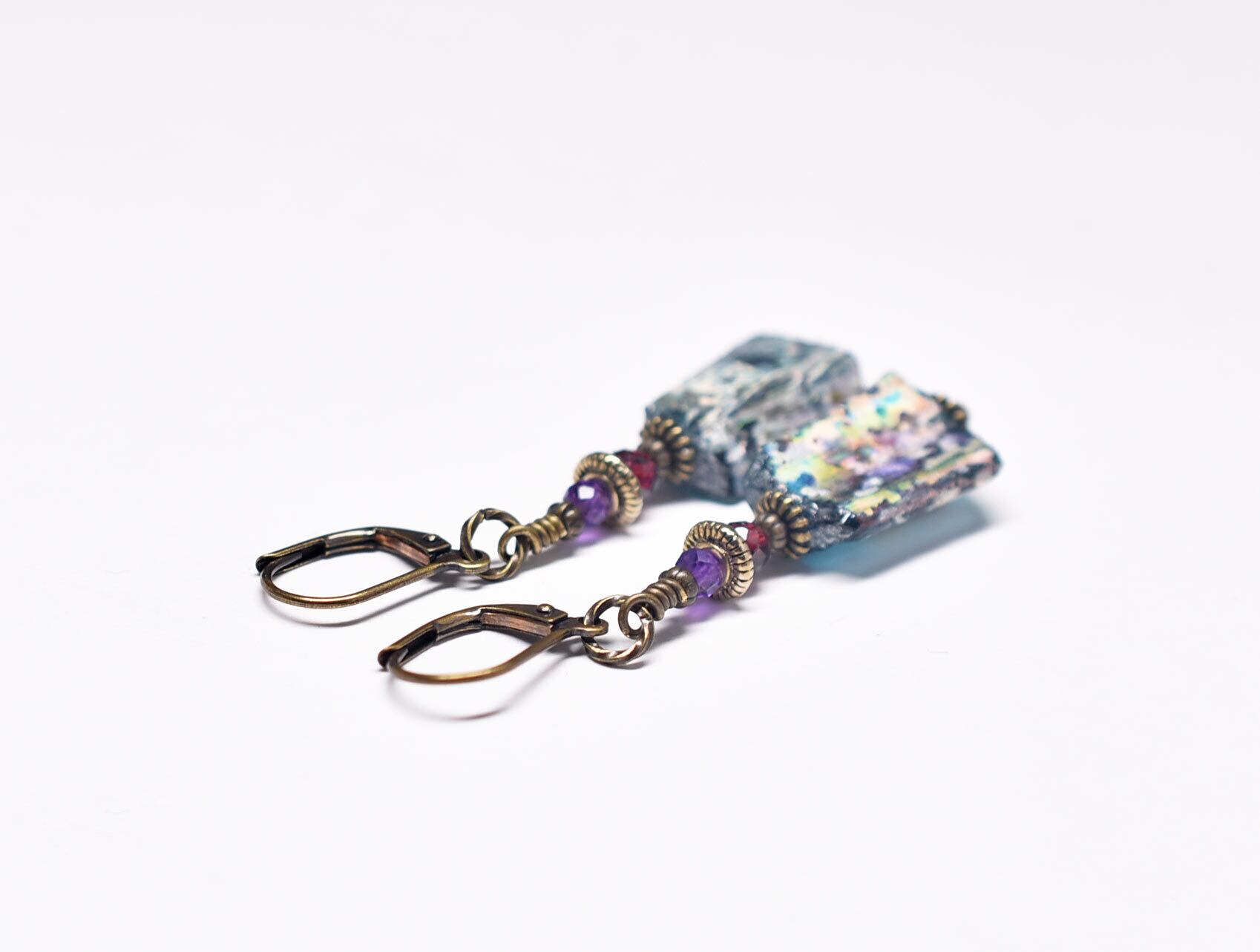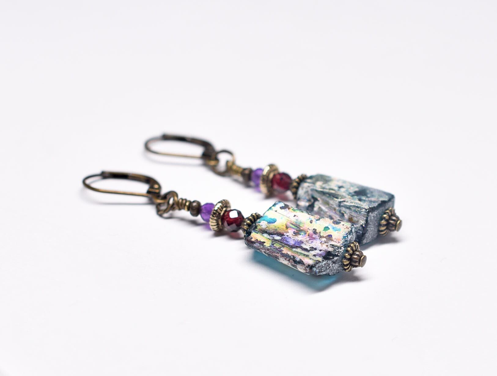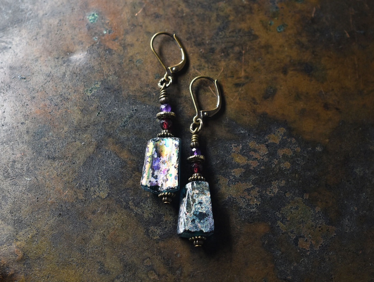 ブルーグリーン銀化ローマングラスとガーネット、アメジストを繋いだピアスです。