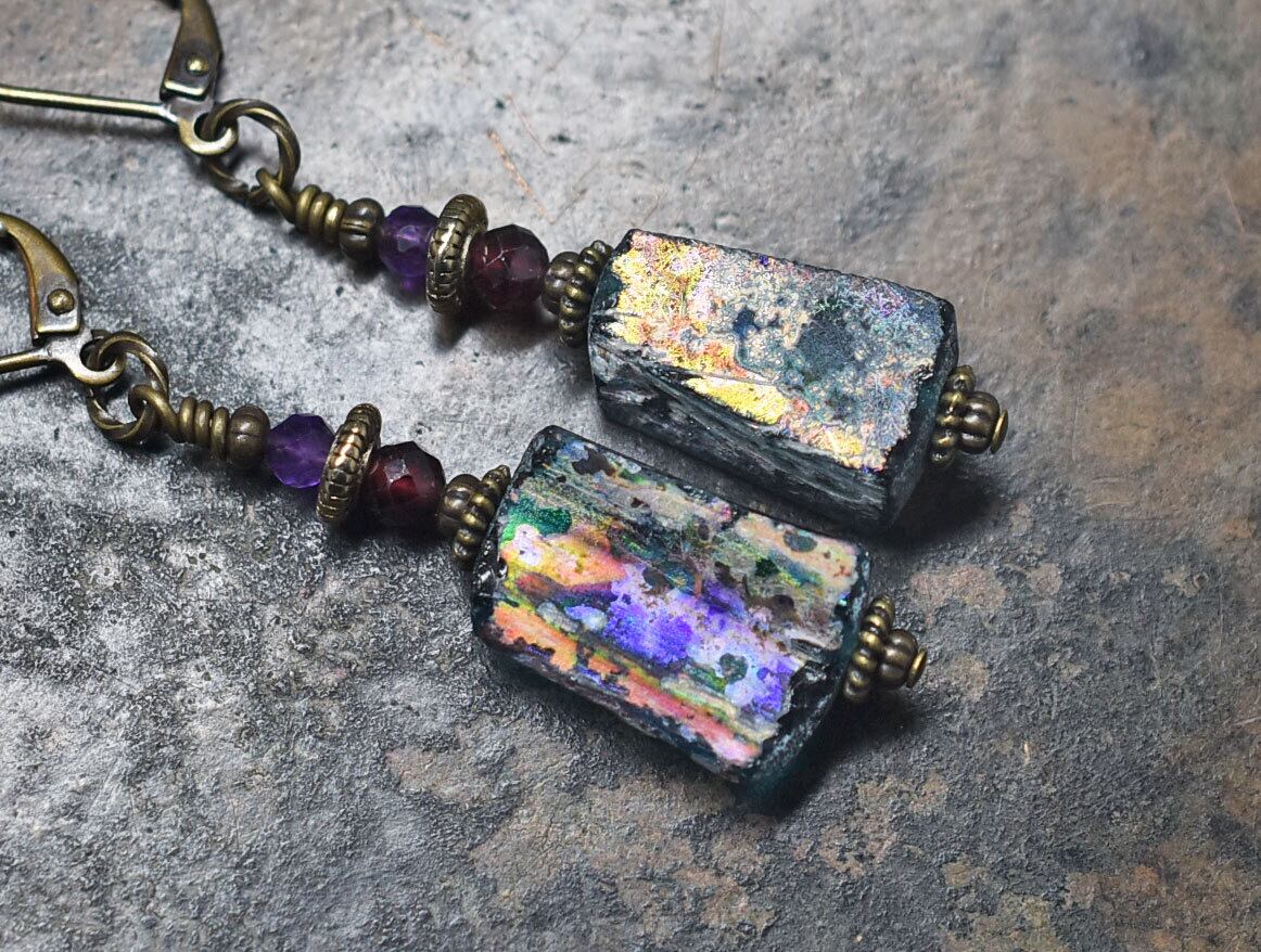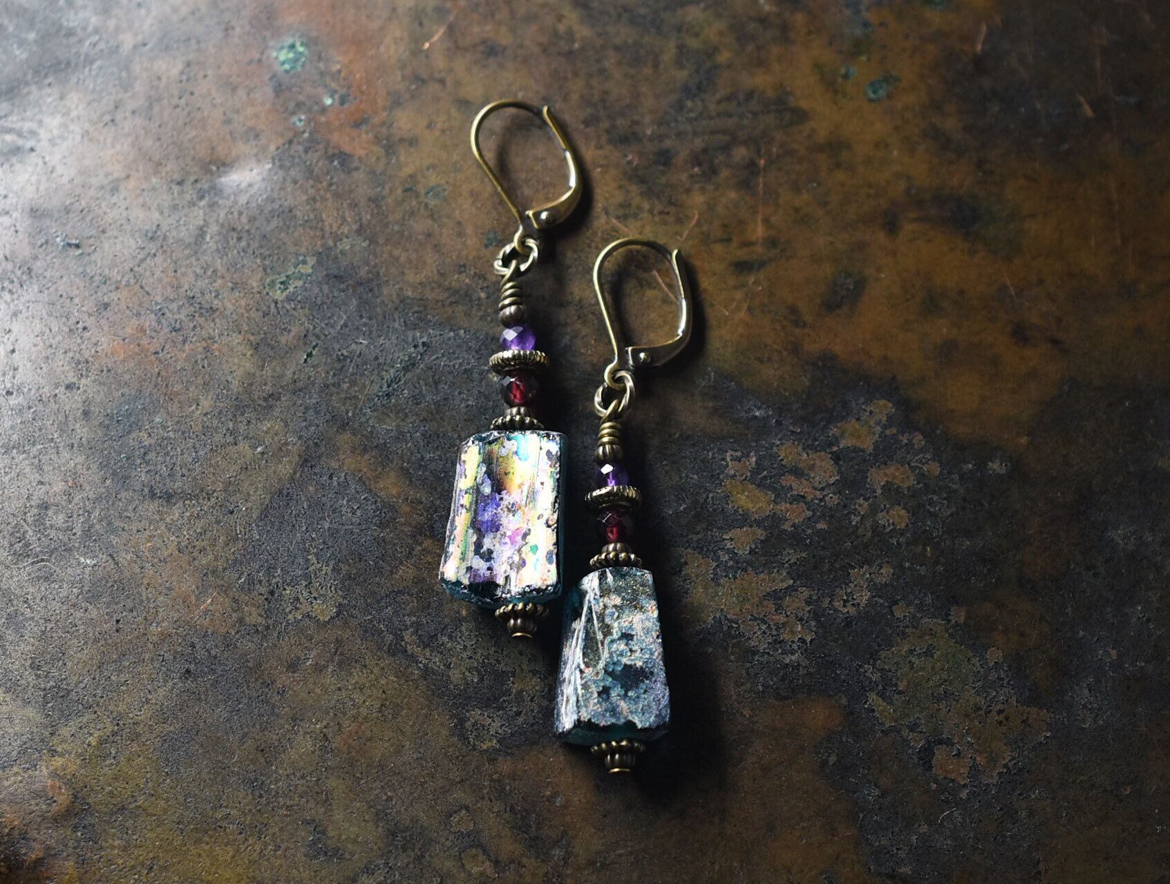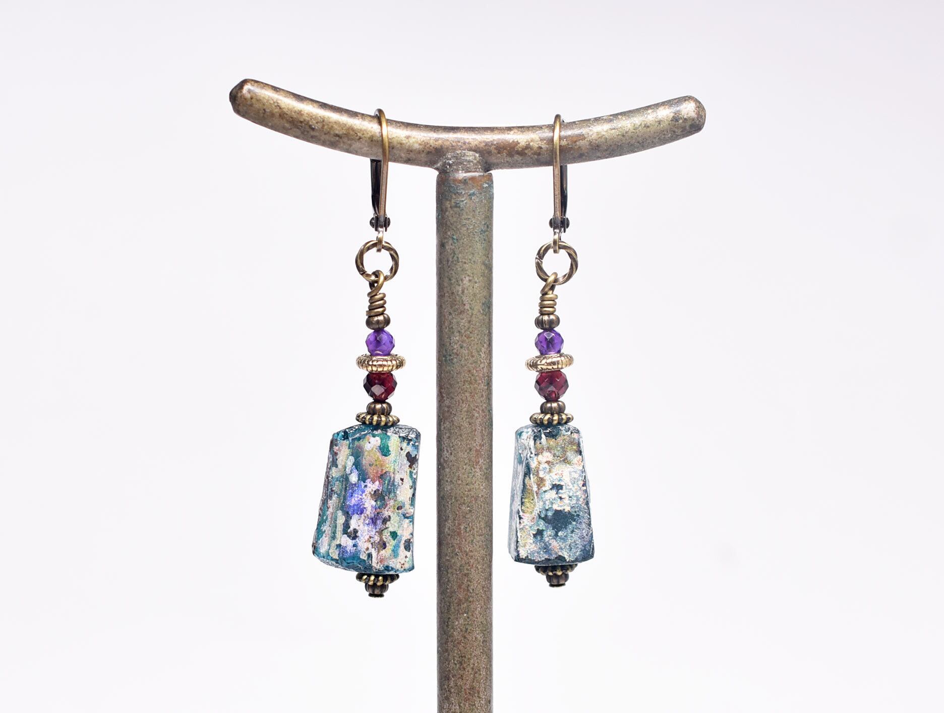 ブルーグリーン銀化ローマングラスとガーネット、アメジストのピアス