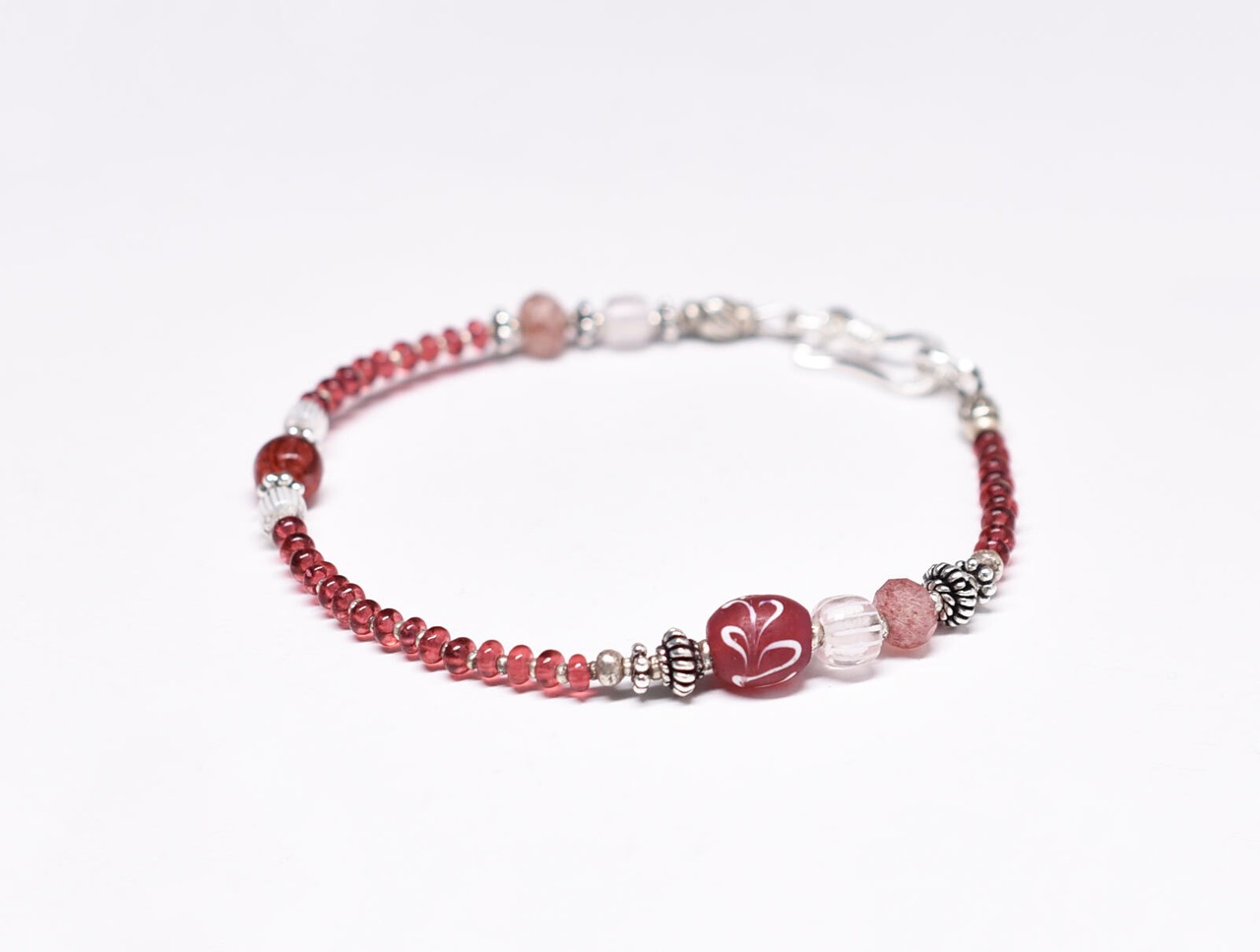 スクイッグルとグーズベリー、ストロベリークォーツ、金赤アンティークビーズを繋いだブレスです。