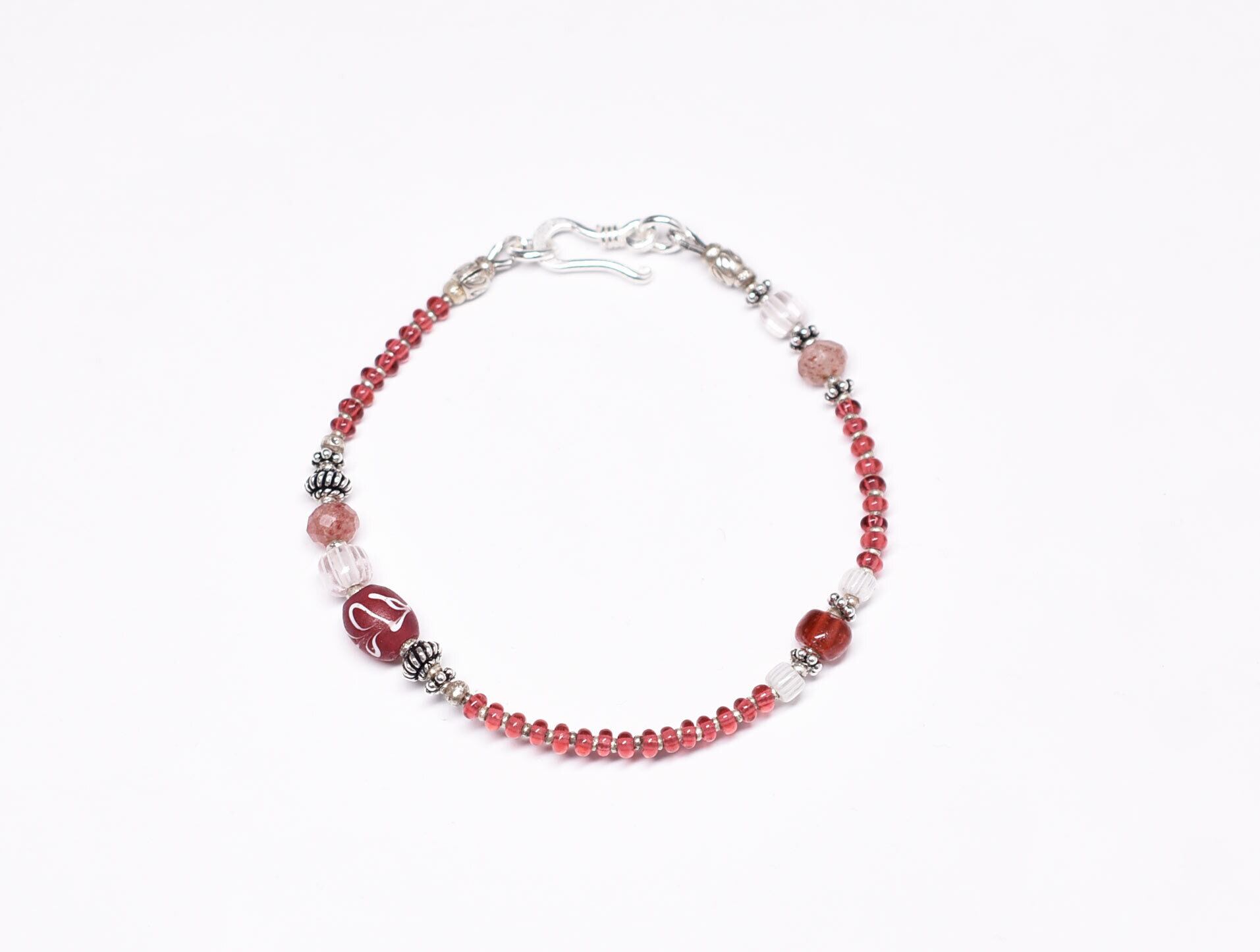スクイッグルとグーズベリー、ストロベリークォーツ、金赤アンティークビーズのブレス