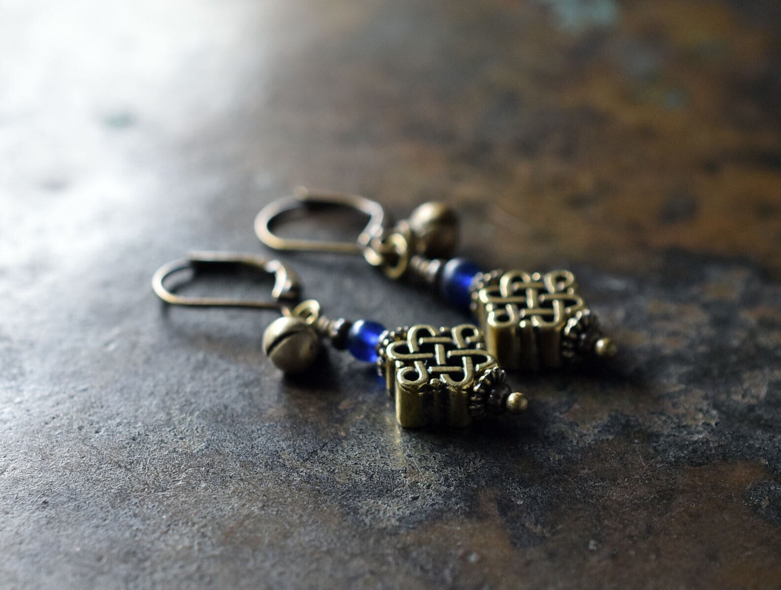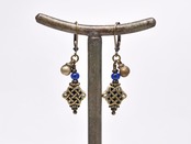真鍮のエンドレスノットとブルーアンティークビーズ、民族鈴を繋いだピアスです。