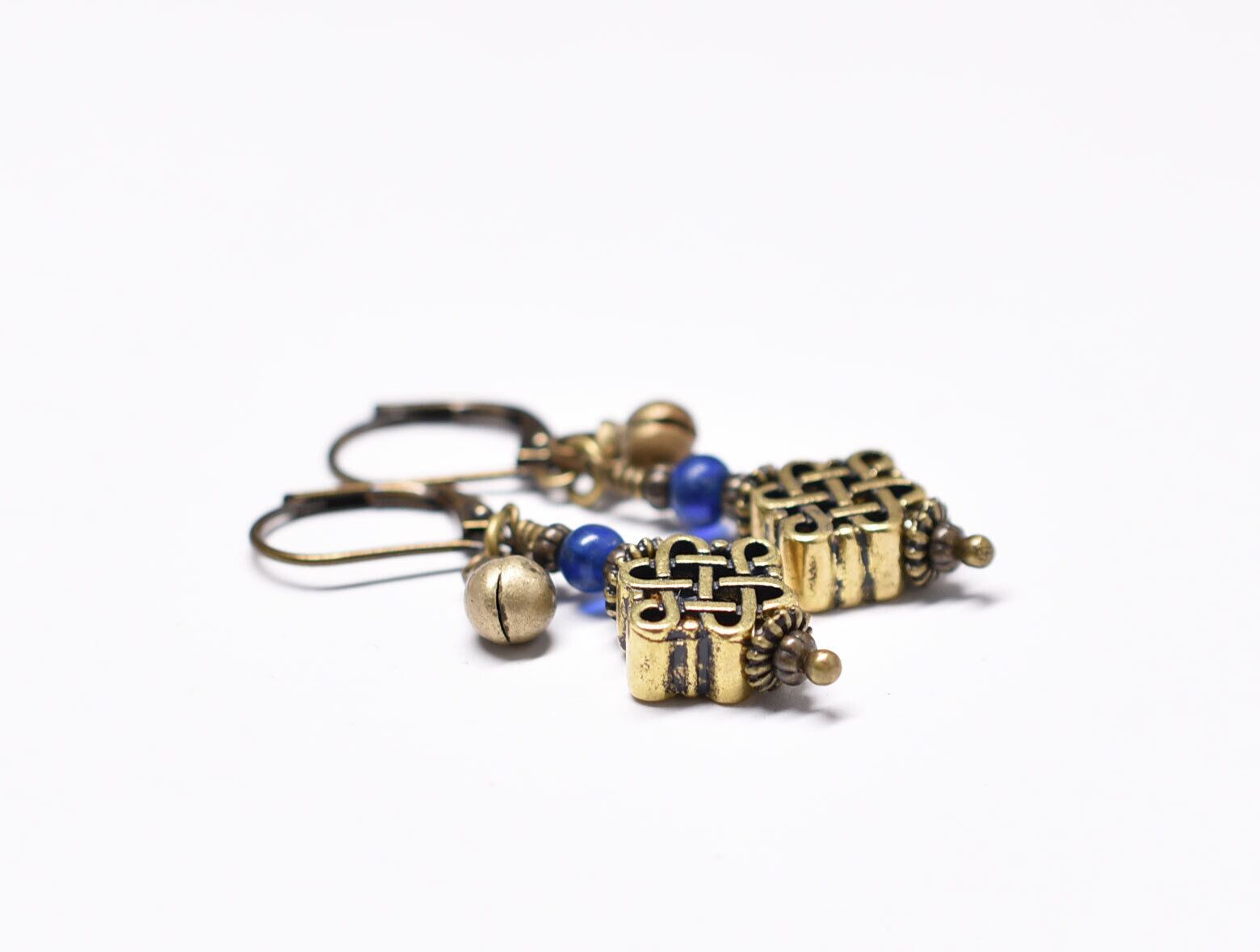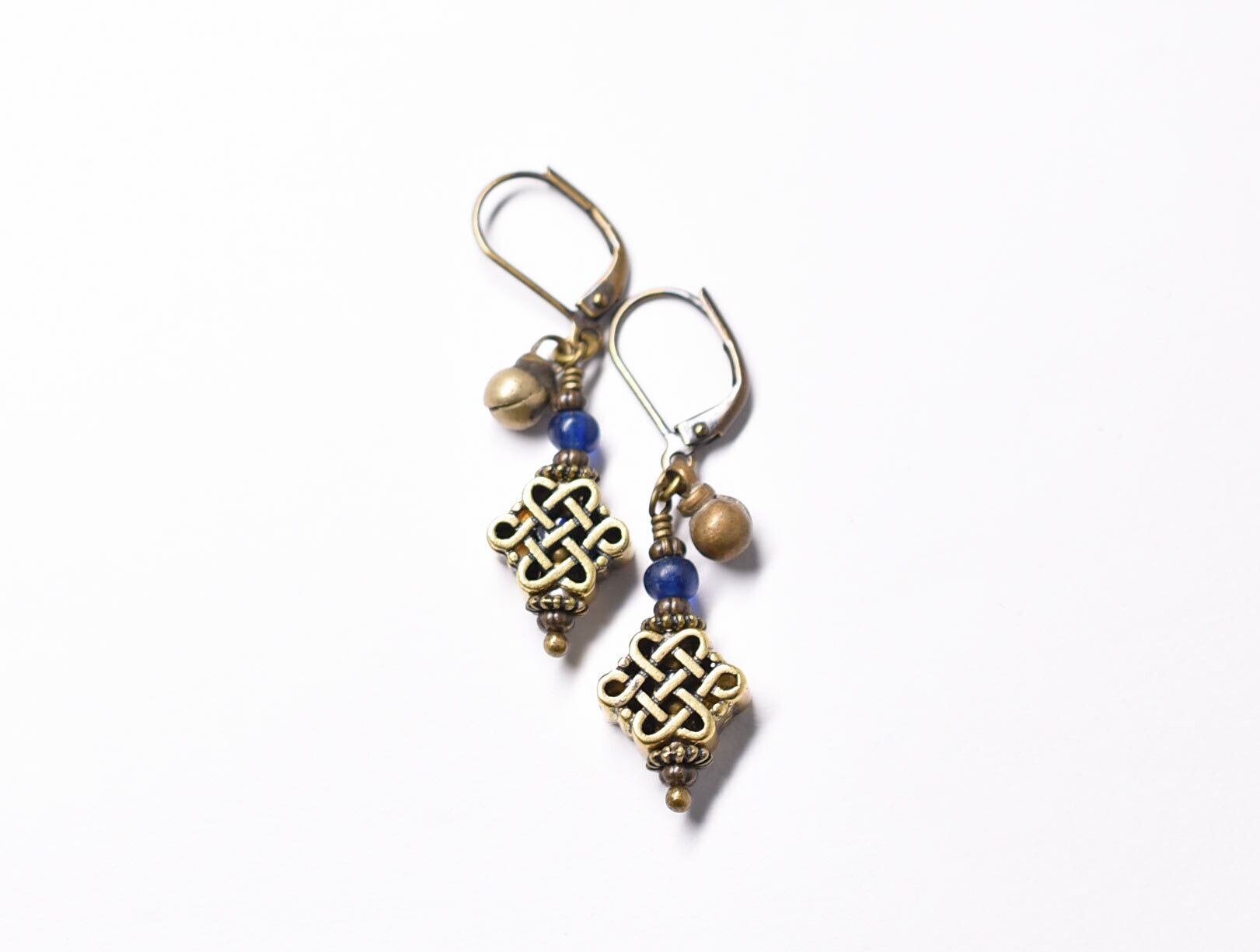 エンドレスノットとブルーアンティークビーズ、民族鈴のピアス