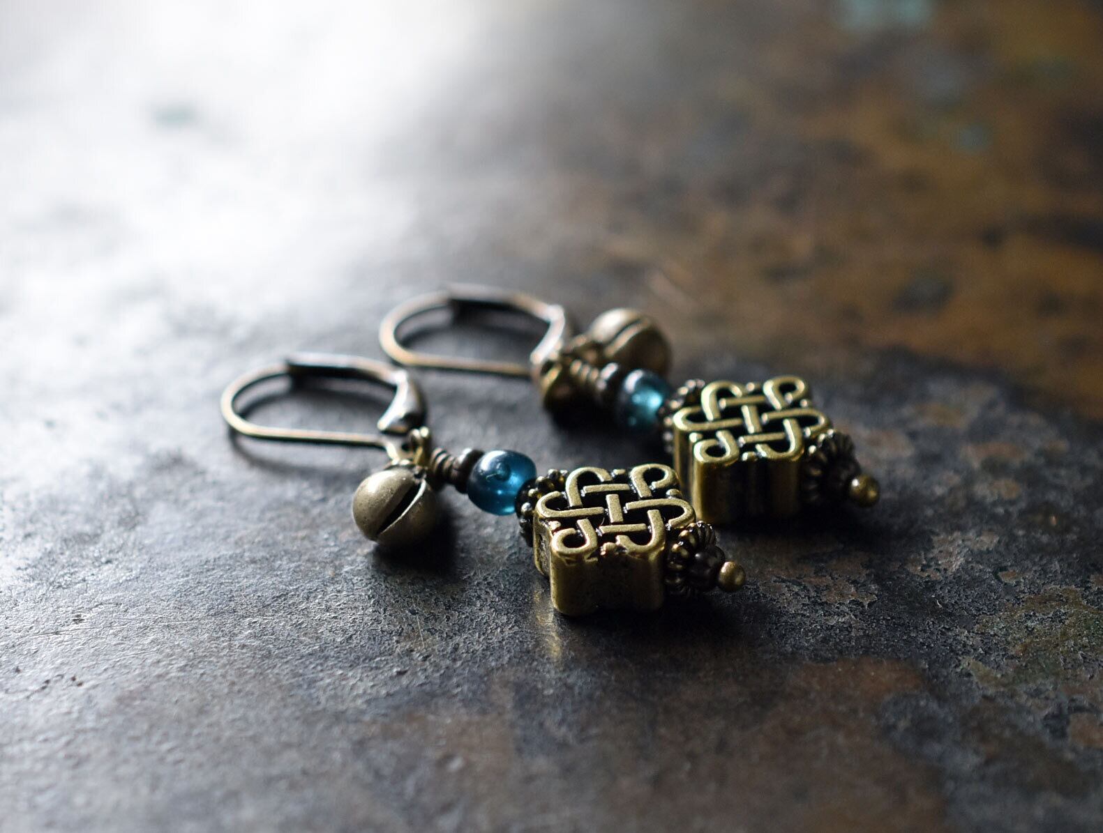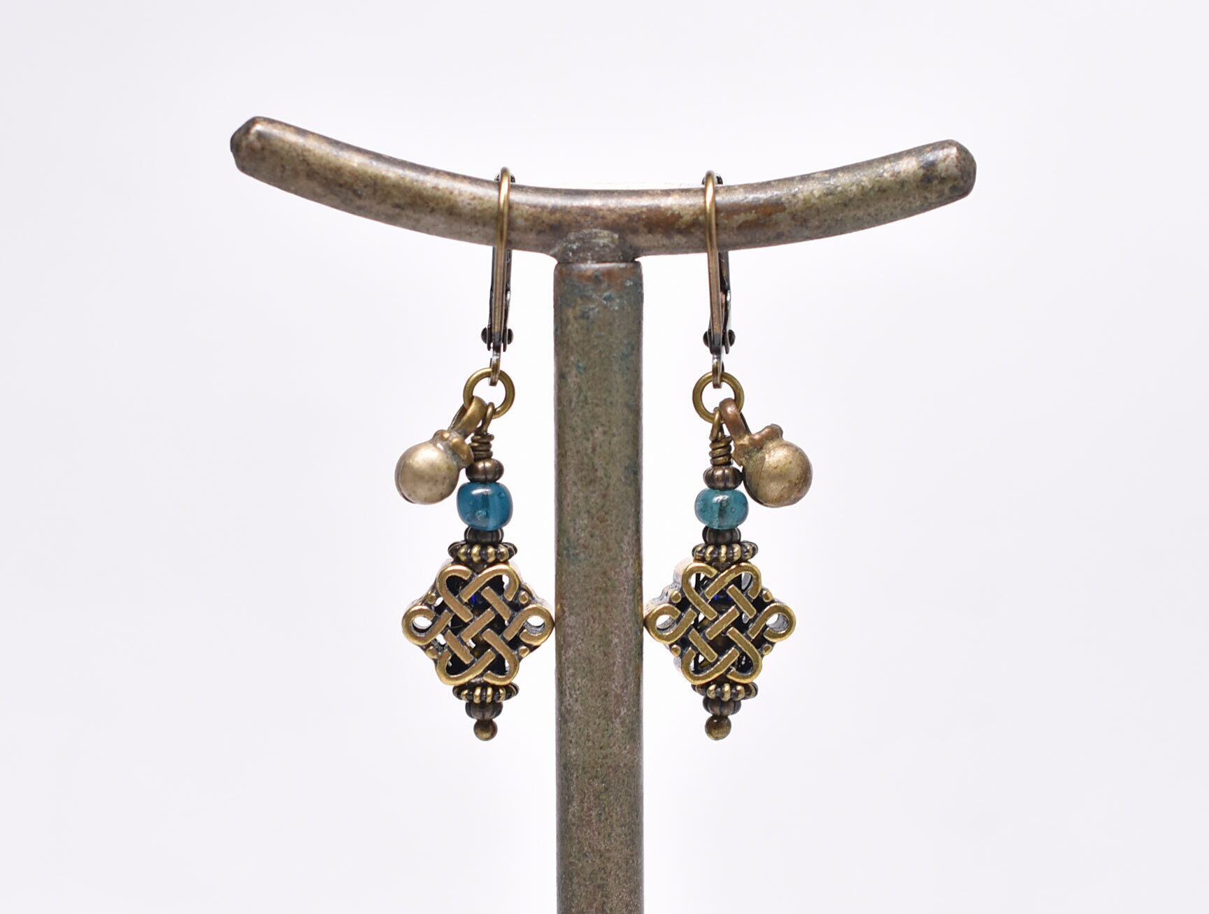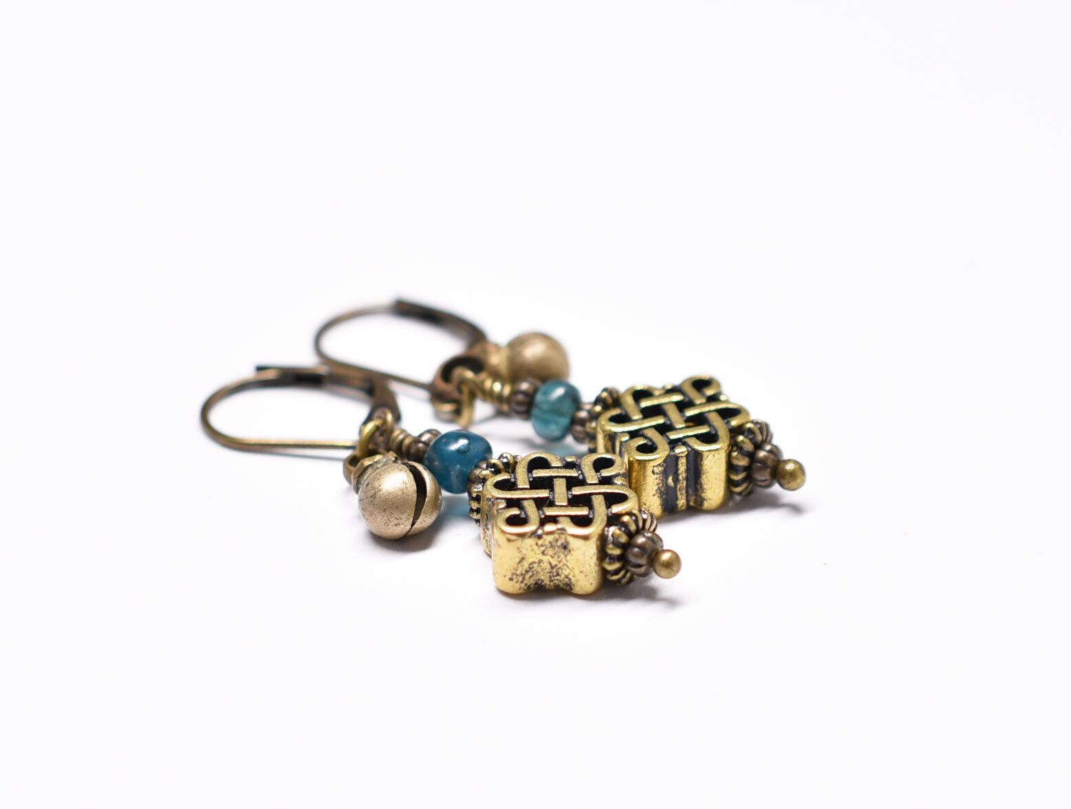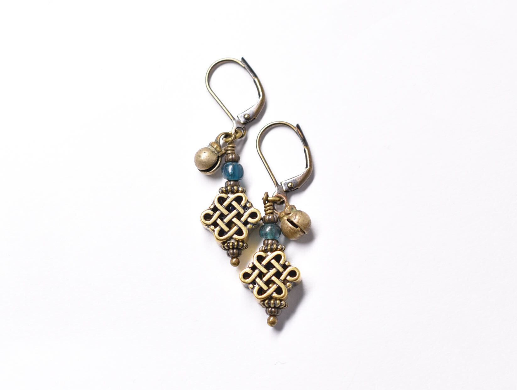 真鍮のエンドレスノットとブルーグリーンアンティークビーズ、民族鈴を繋いだピアスです。
