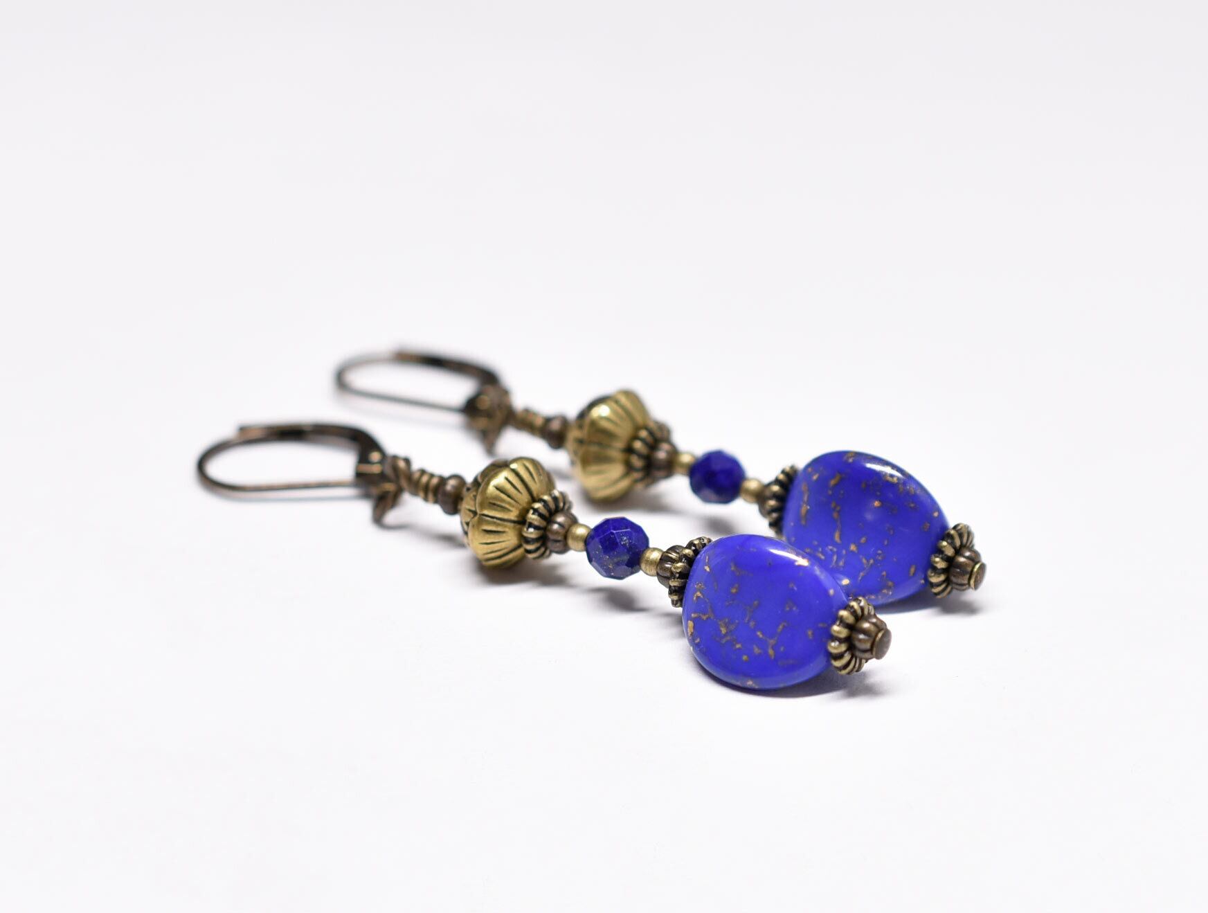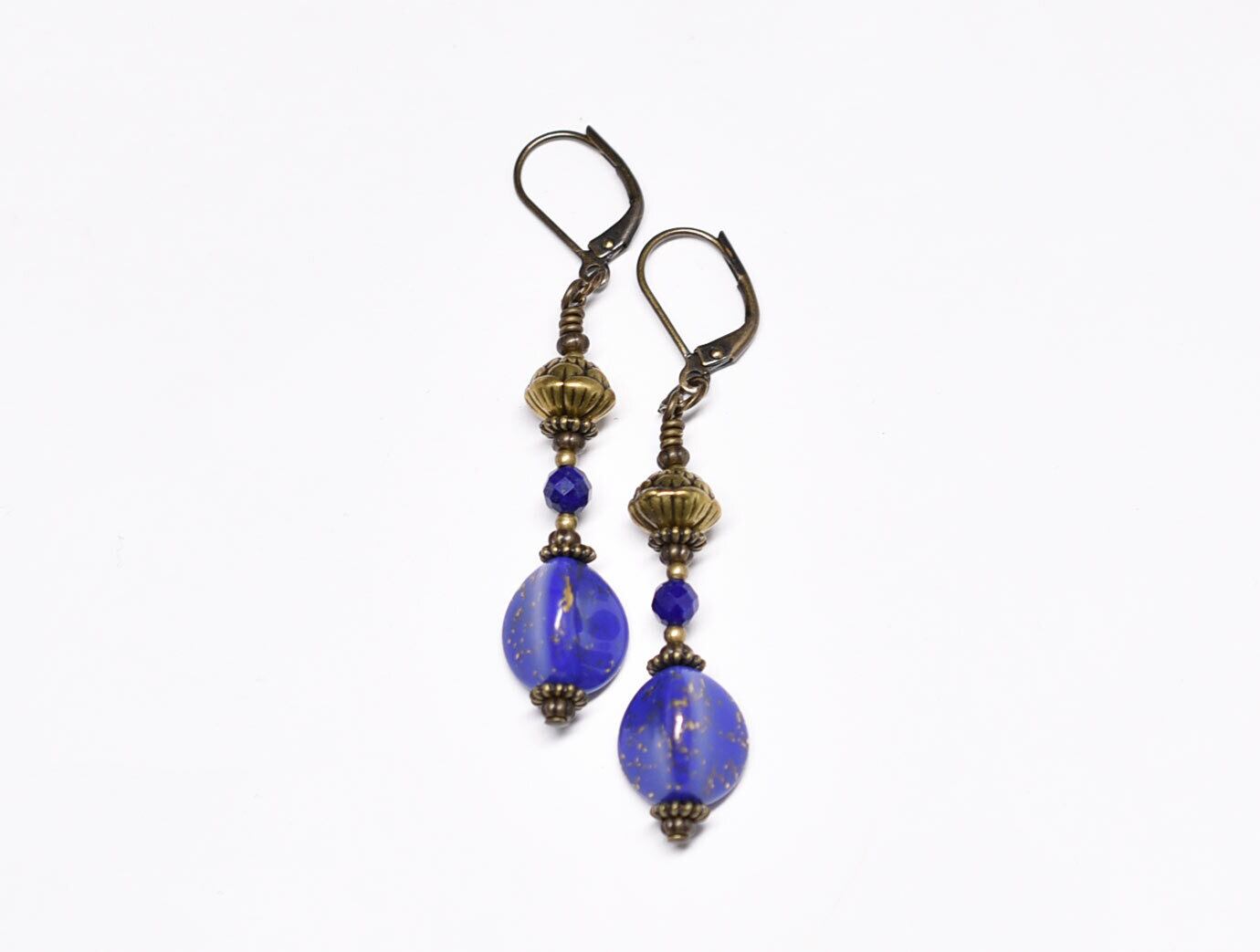 群青色ドイツヴィンテージビーズとラピス、蓮華ブラスのピアス