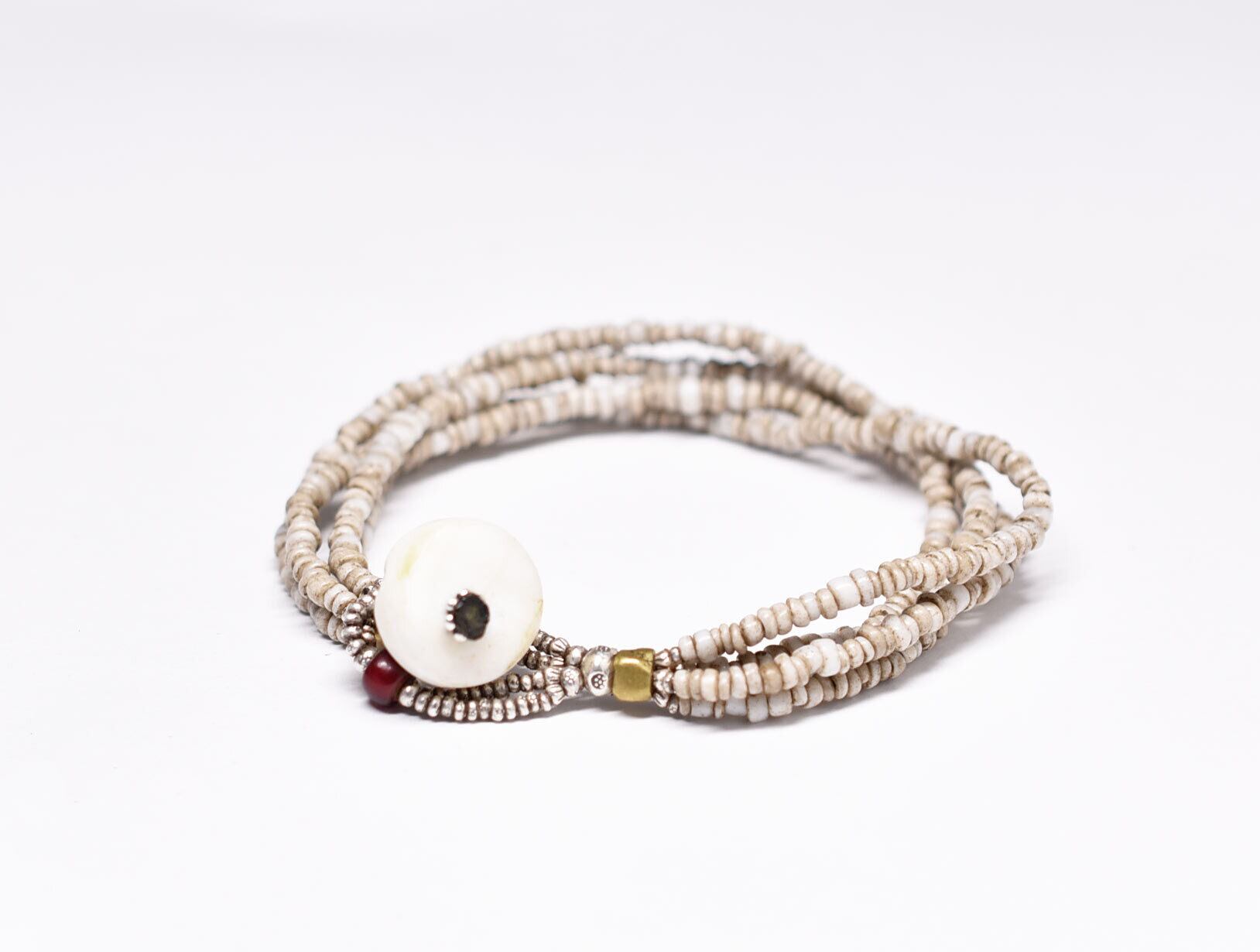 民族の古いネックレスの留め金に使われていた貝をこのブレスも留め金にしました。