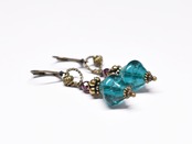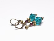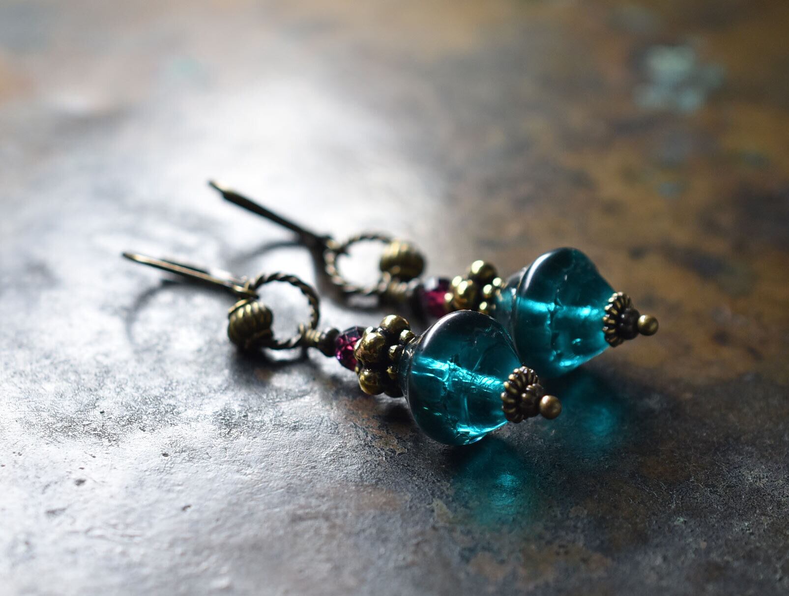 ブルーグリーンドイツヴィンテージビーズとぷっくりブラス、ガーネットのピアス