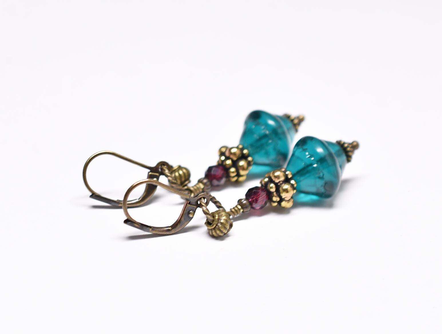 ブルーグリーンドイツヴィンテージビーズとぷっくりブラス、ガーネットを繋いだピアスです。