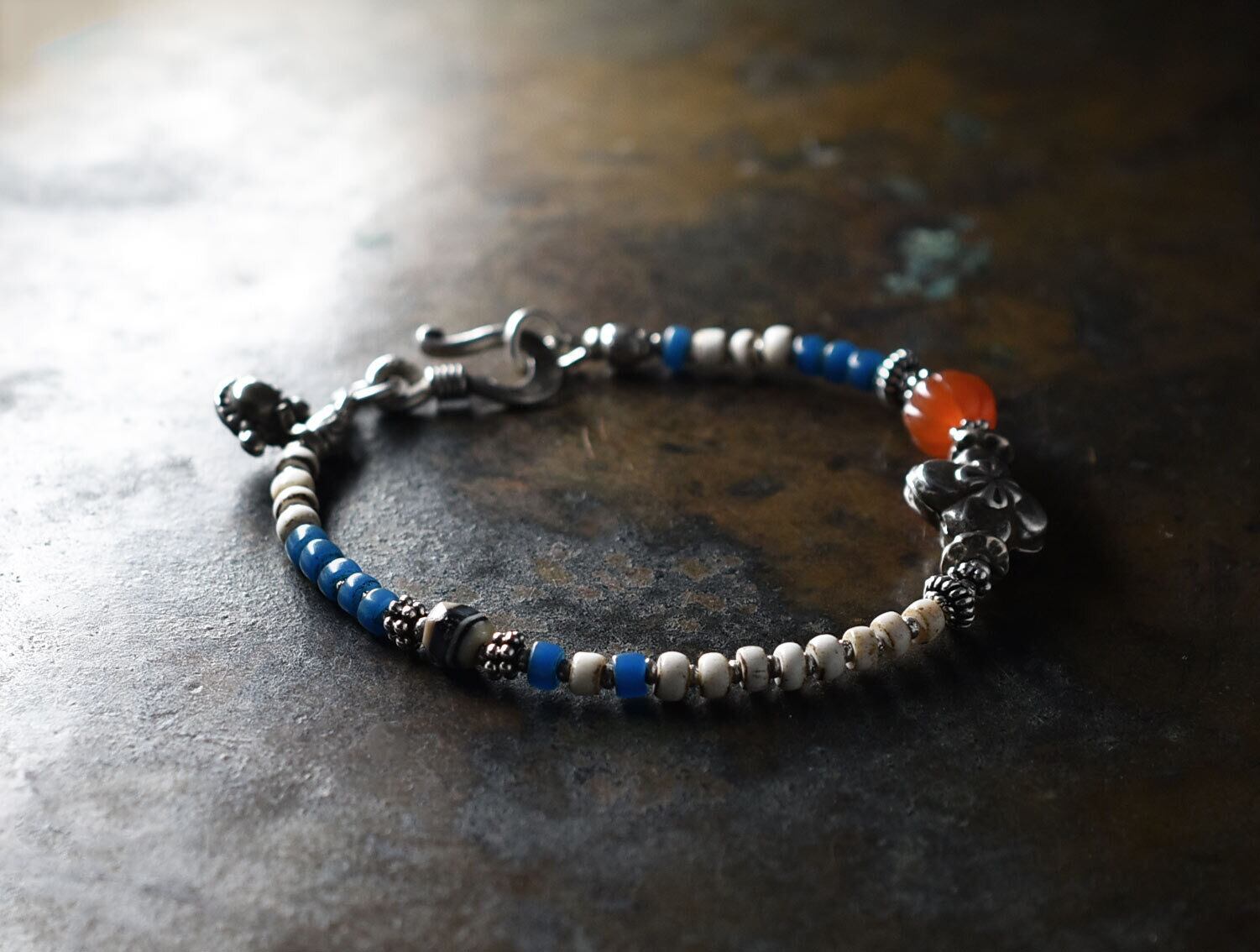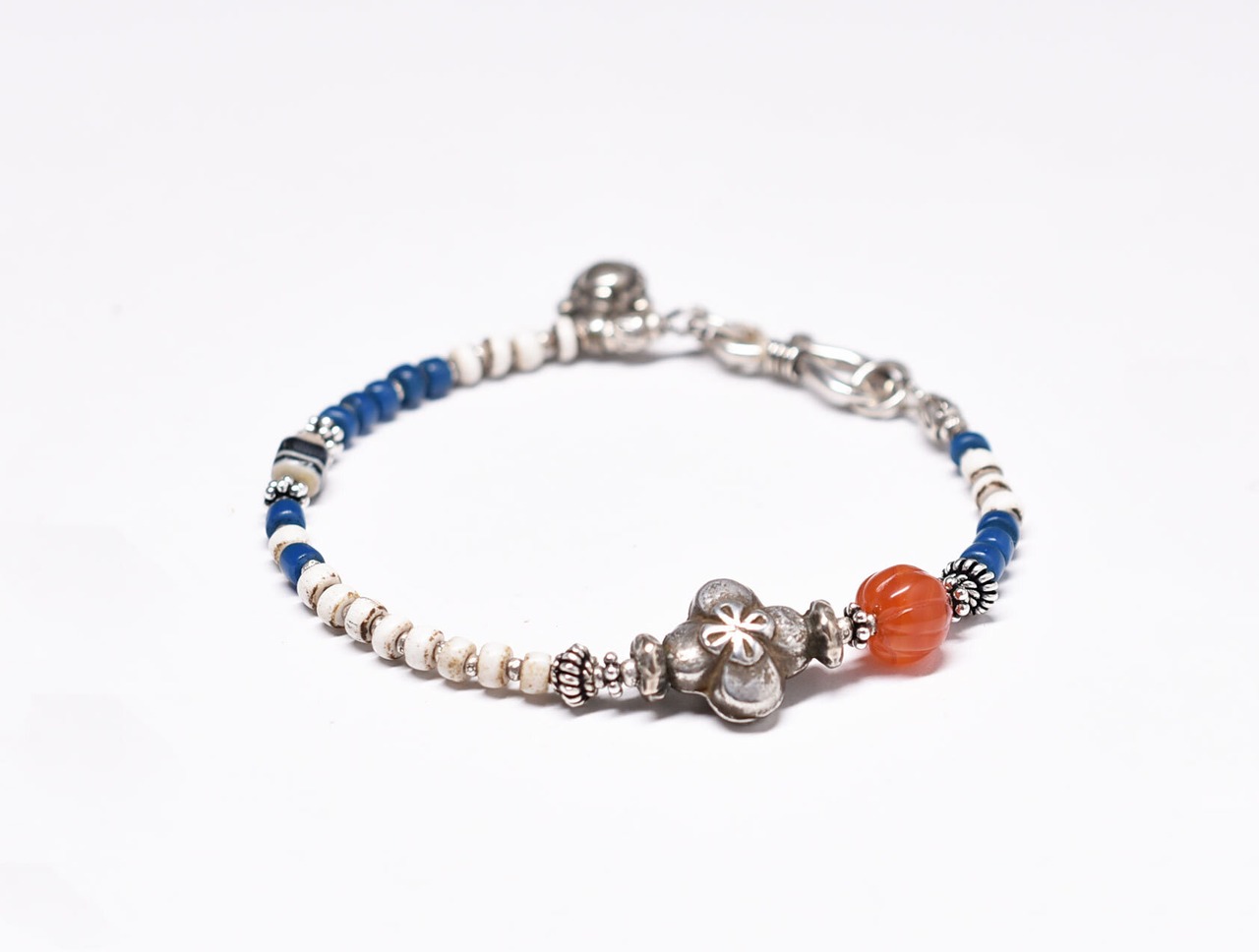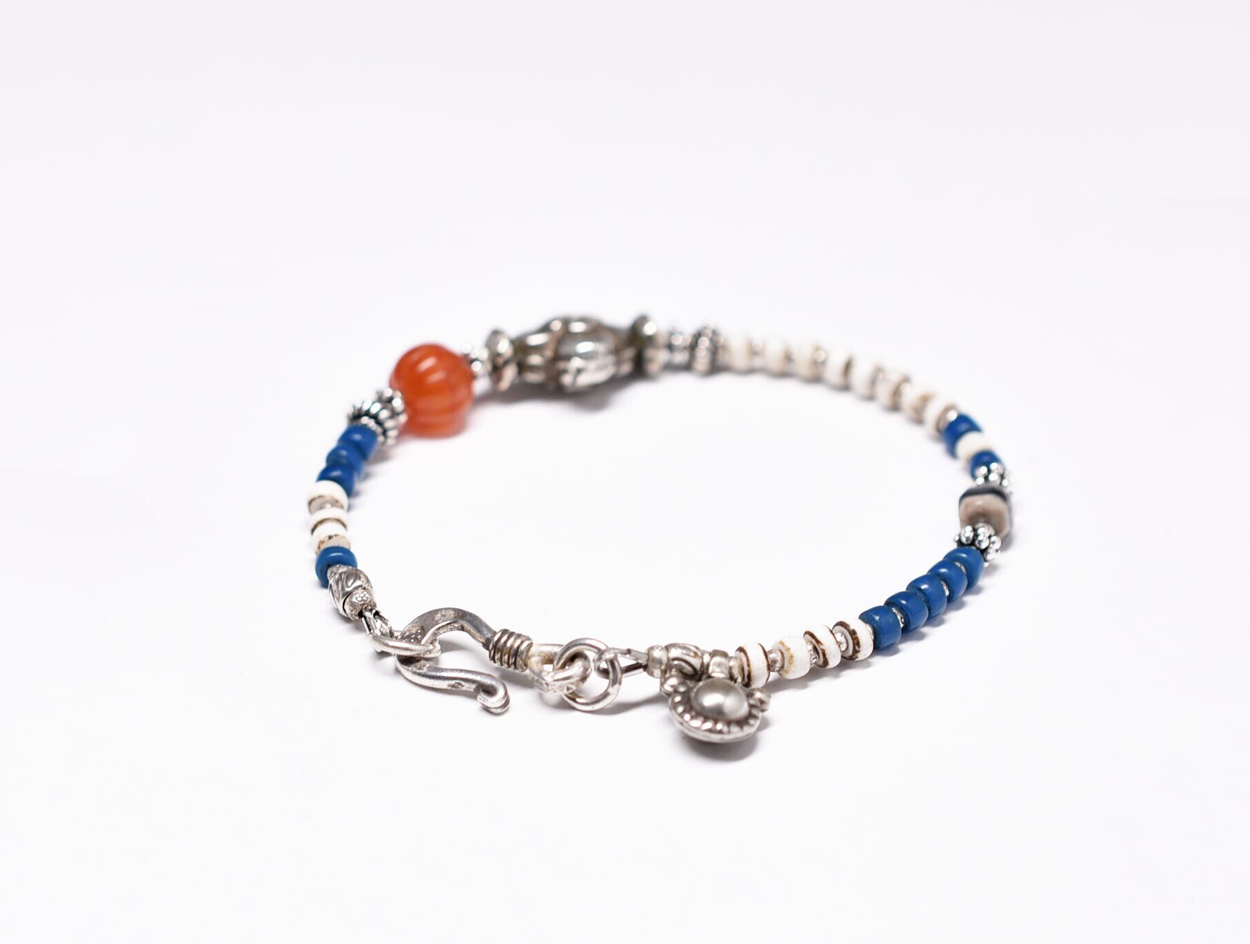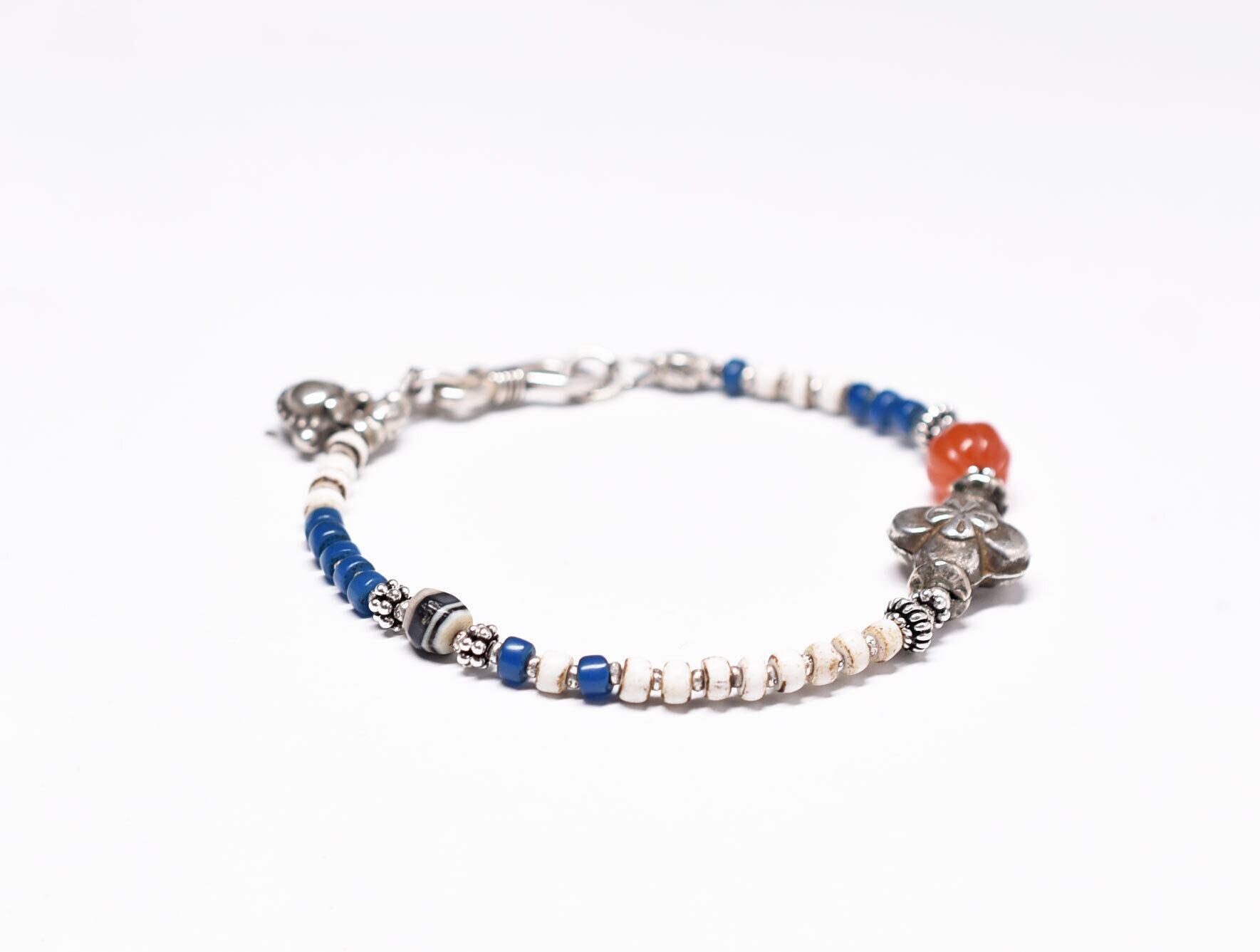 ヒマーチャルシルバー、ヴィンテージカーネリアン、古代瑪瑙、ホワイトビーズと縹色ビーズのブレス