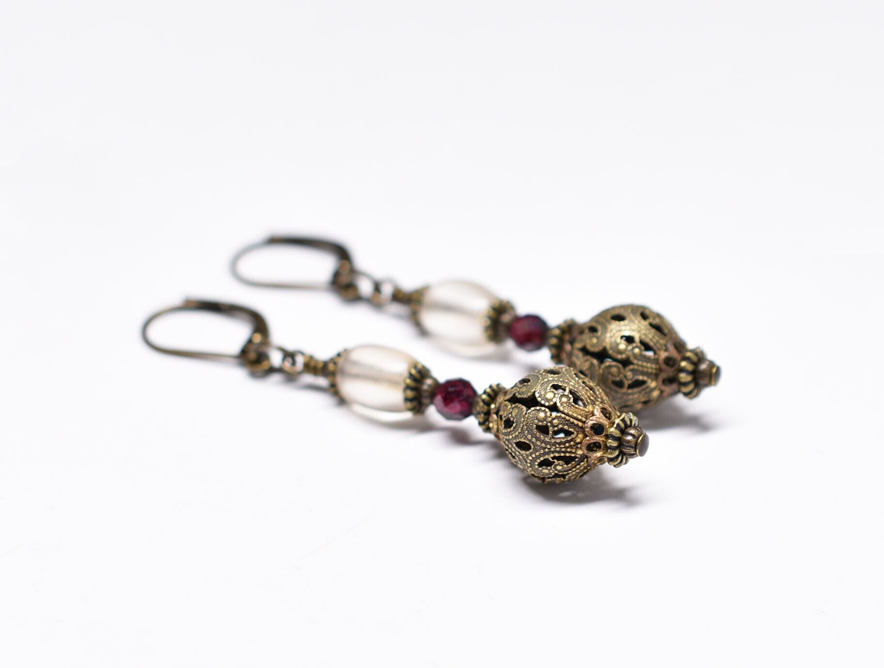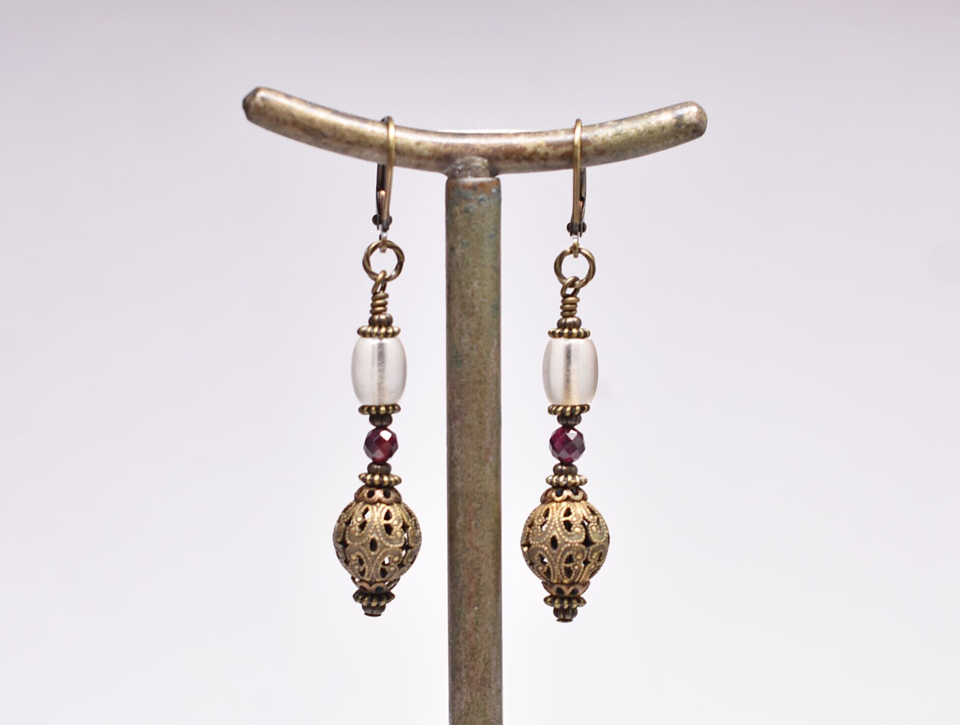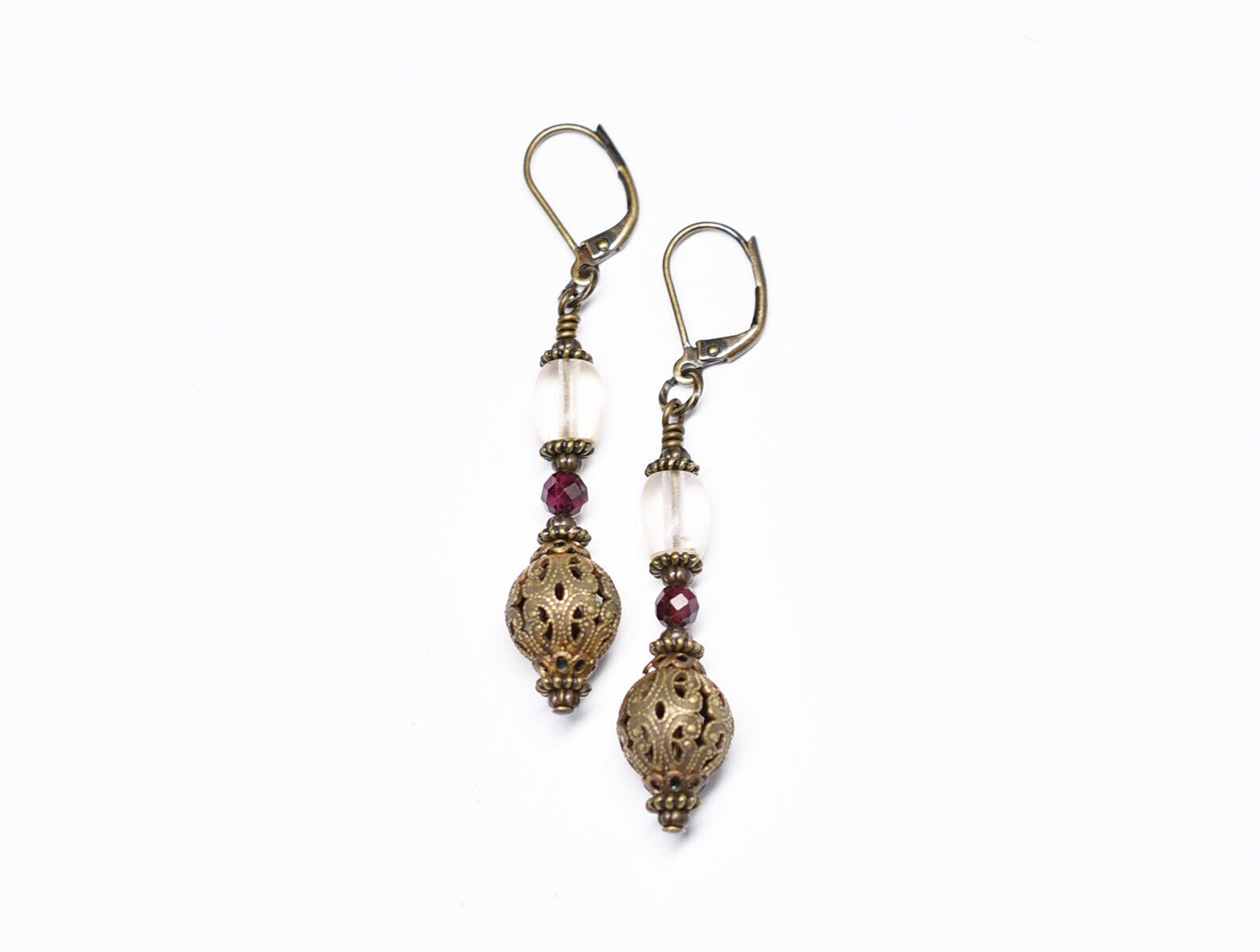 ヨーロッパヴィンテージメタルパーツとガーネット、アンティークボヘミアビーズを繋いだピアスです。