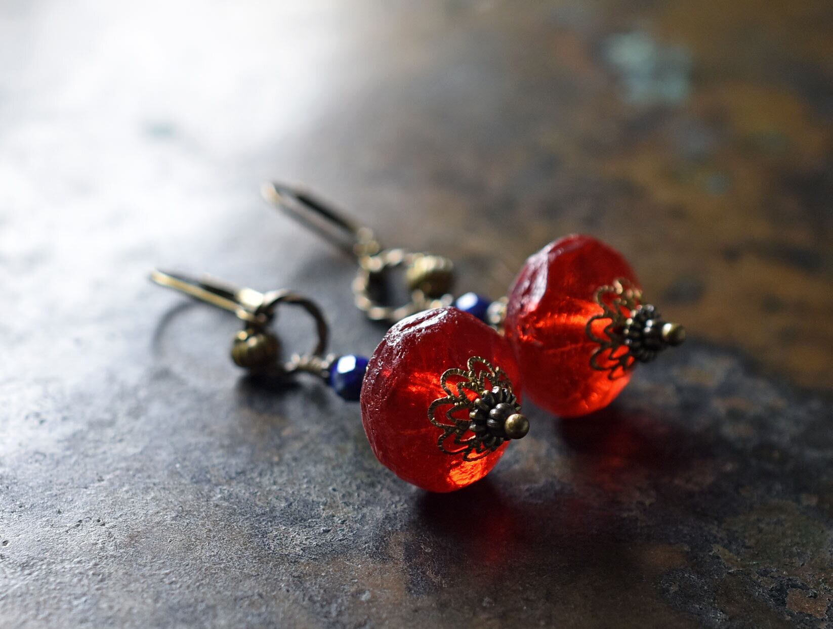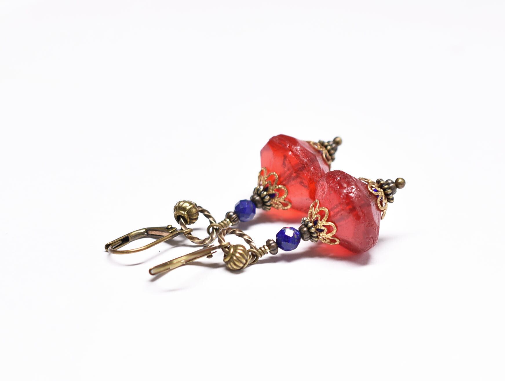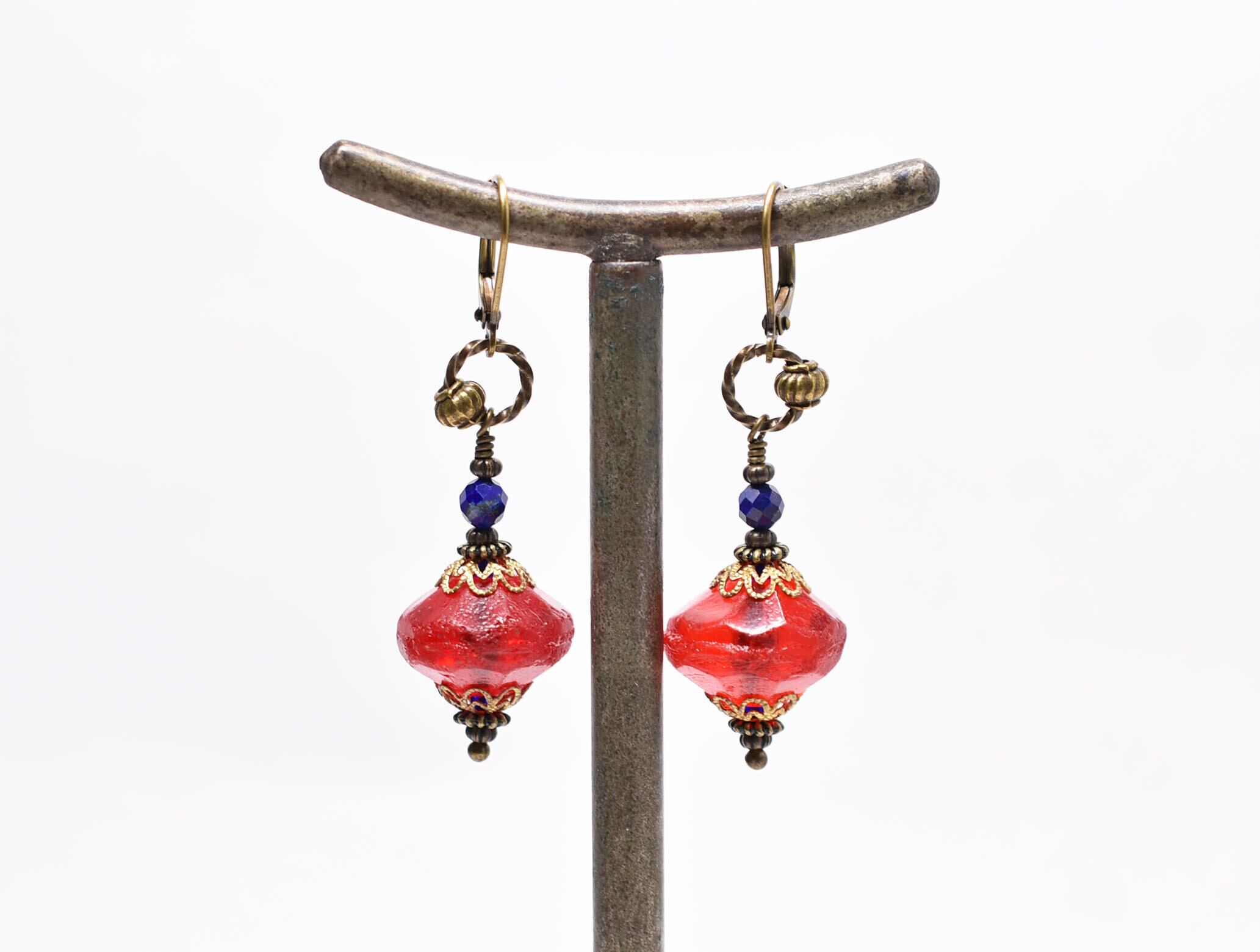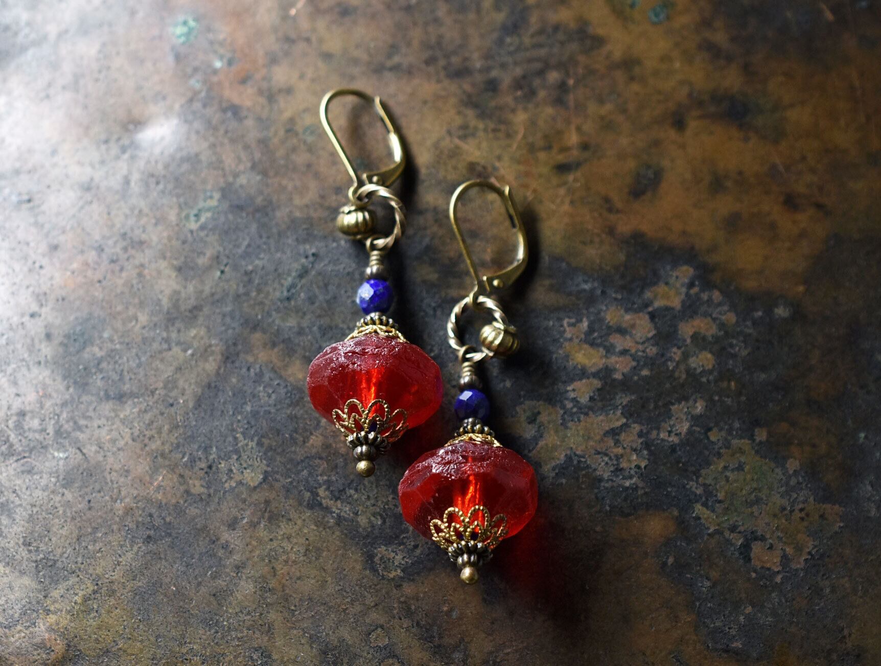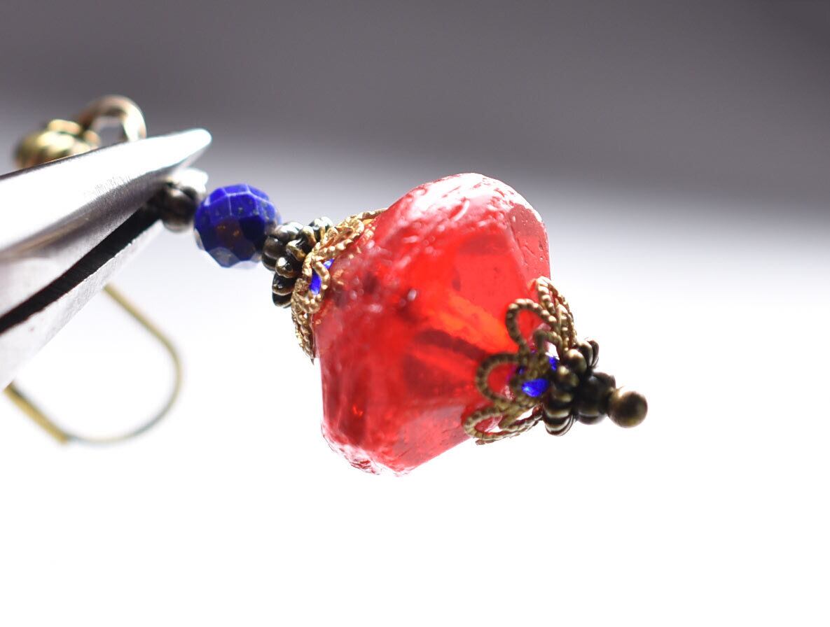 真っ赤な算盤型アンティークボヘミアビーズと隠しブルービーズ、ラピスなどを繋いだピアスです。