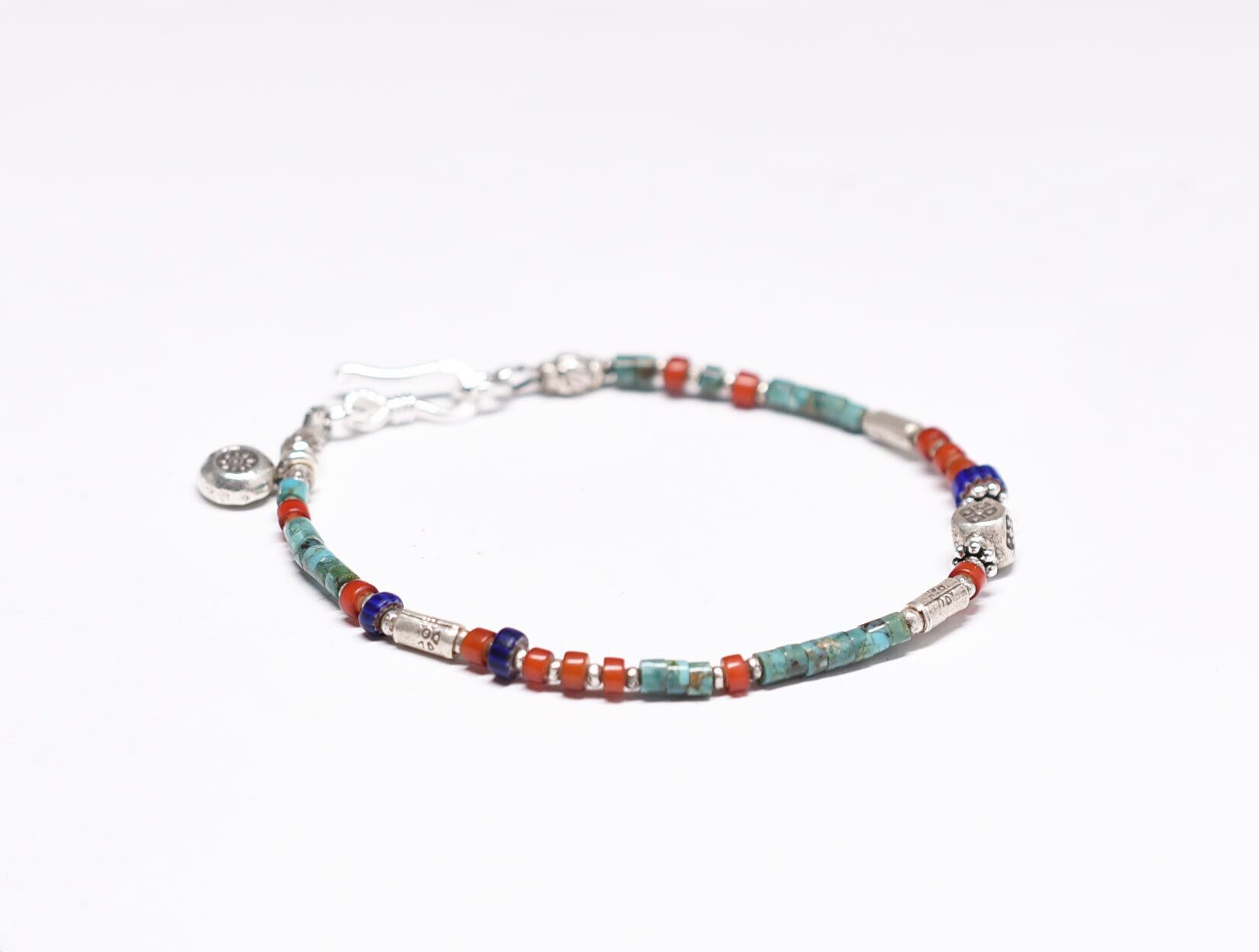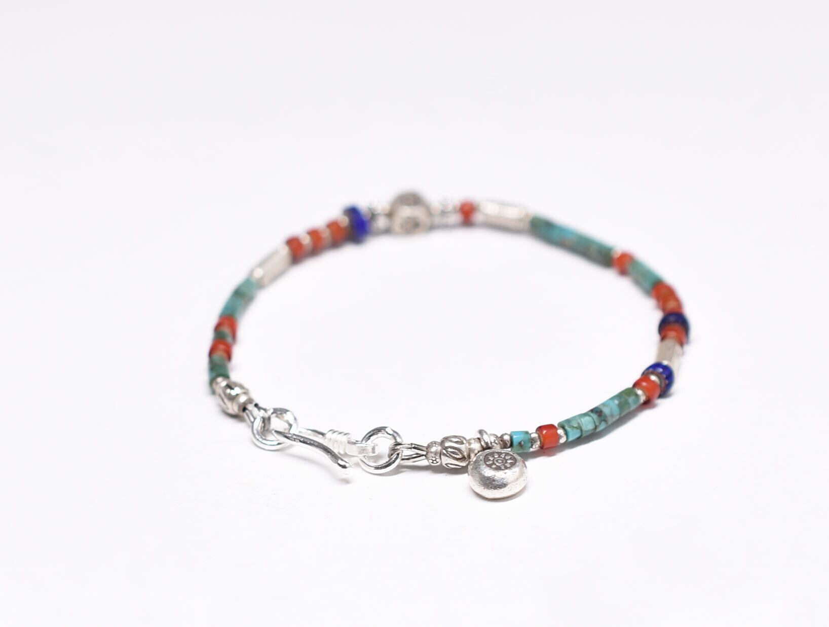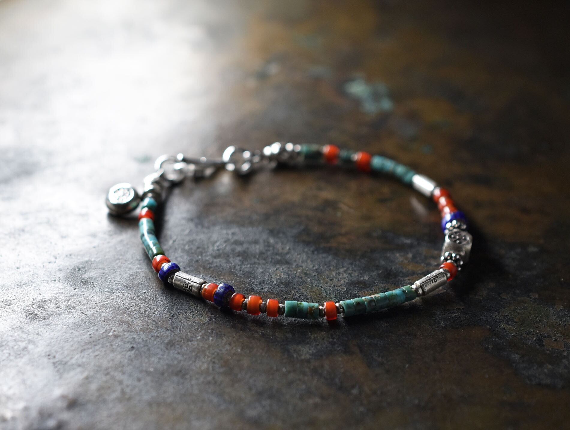 グリーンターコイズと飴色ホワイトハーツ 、ブルーシェブロン、カレンシルバーを繋いだ華奢なブレスです。