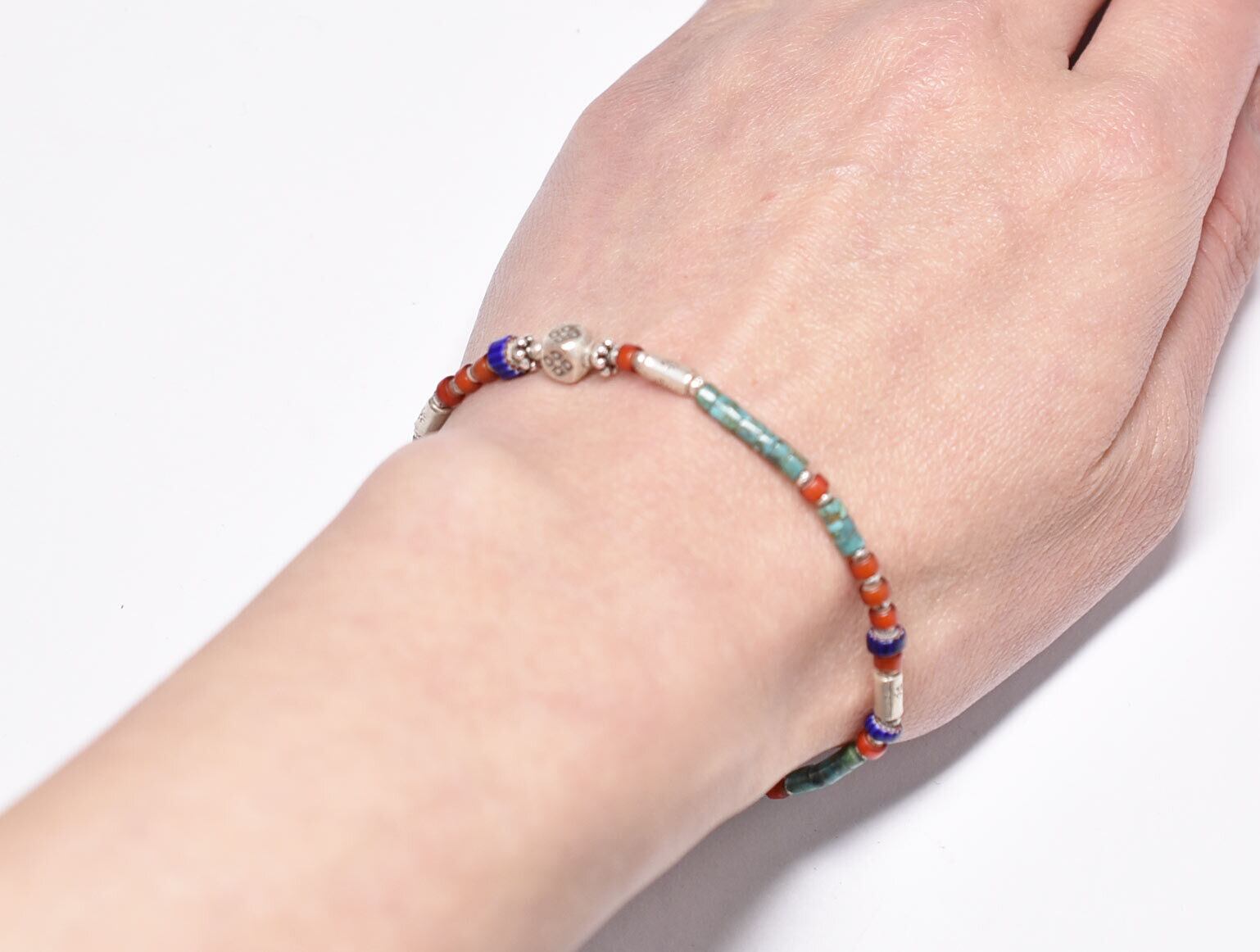 グリーンターコイズと飴色ホワイトハーツ 、ブルーシェブロン、カレンシルバーの華奢なブレス