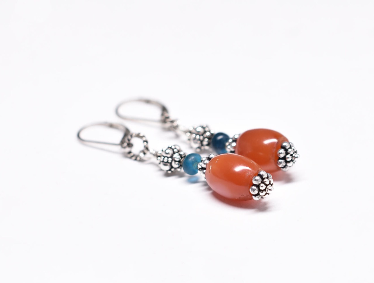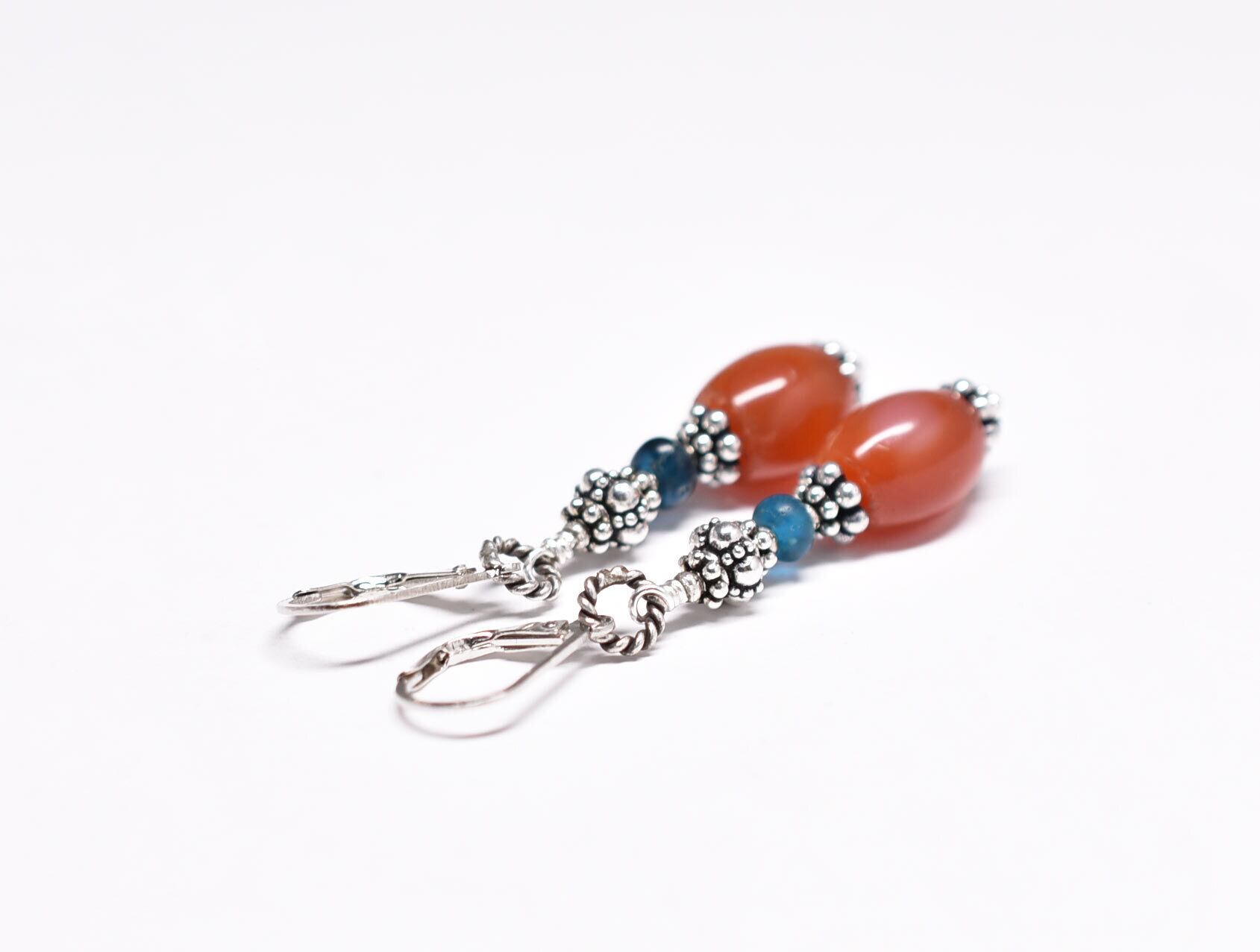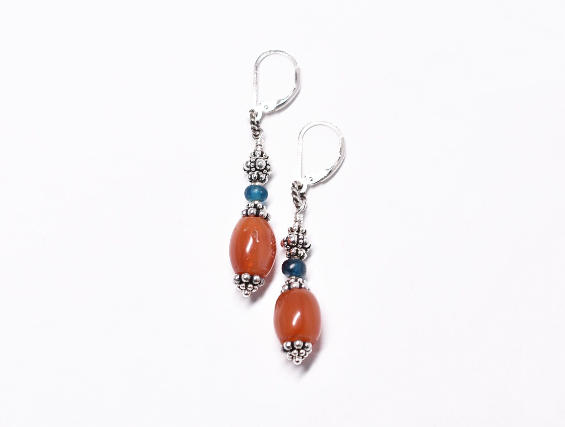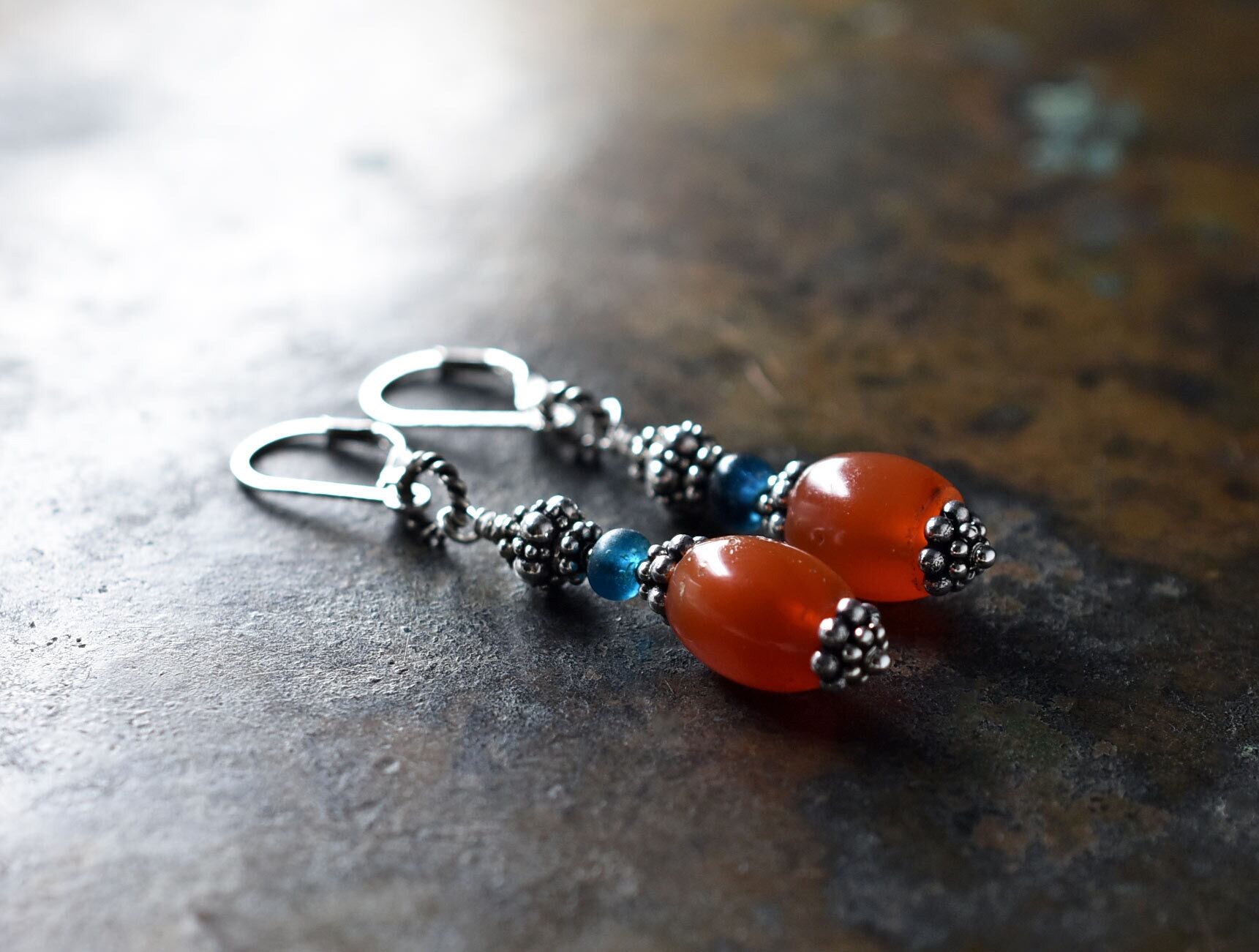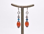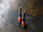 ミゾーラムカーネリアンとエメラルド&インディゴブルービーズ、シルバーを繋いだピアスです。