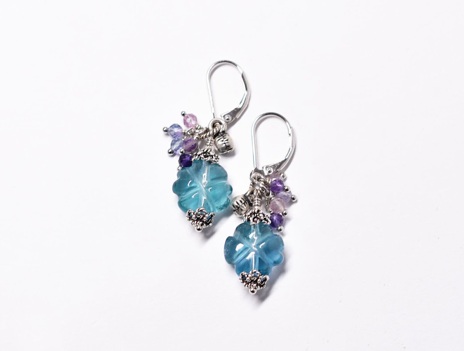 よつばのクローバ型ブルーグリーンフローライトと小さなフローライト、インドシルバー鈴のピアス