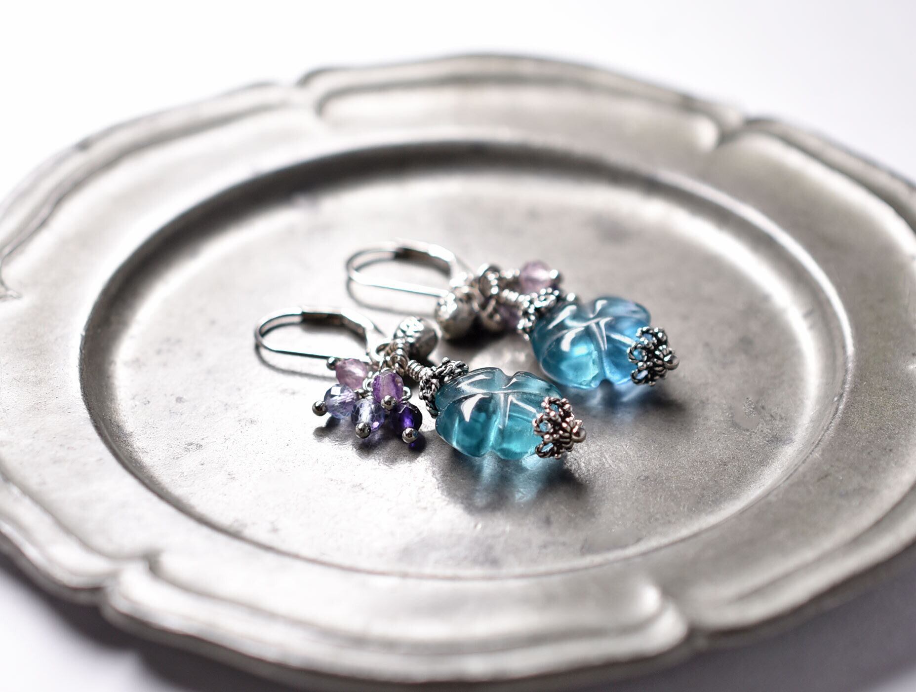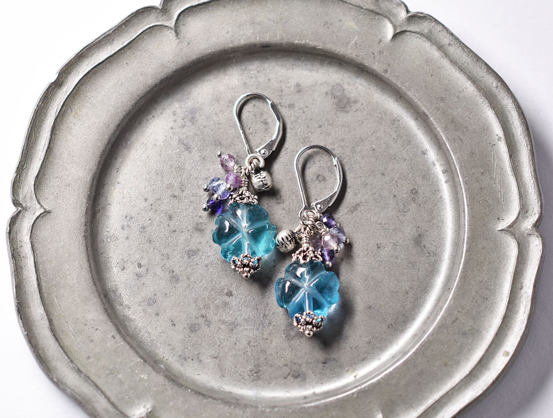 クローバー型をしたブルーグリーンのビーズはフローライトです。