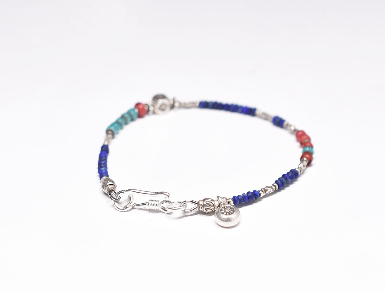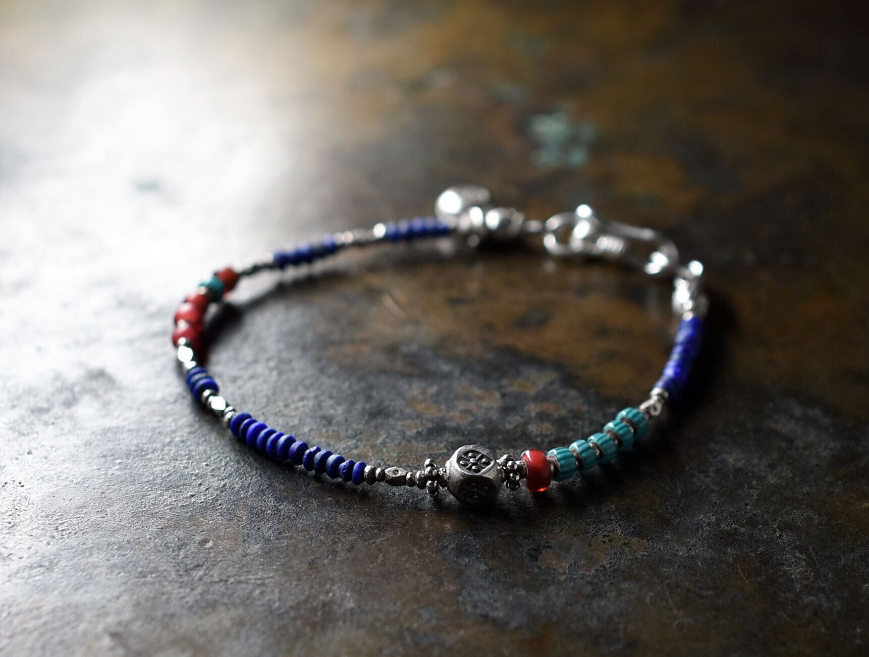 ラピスと金赤ホワイトハーツ 、ターコイズブルーシェウブロンビーズ、カレンシルバーを繋いだ華奢なブレスです。
