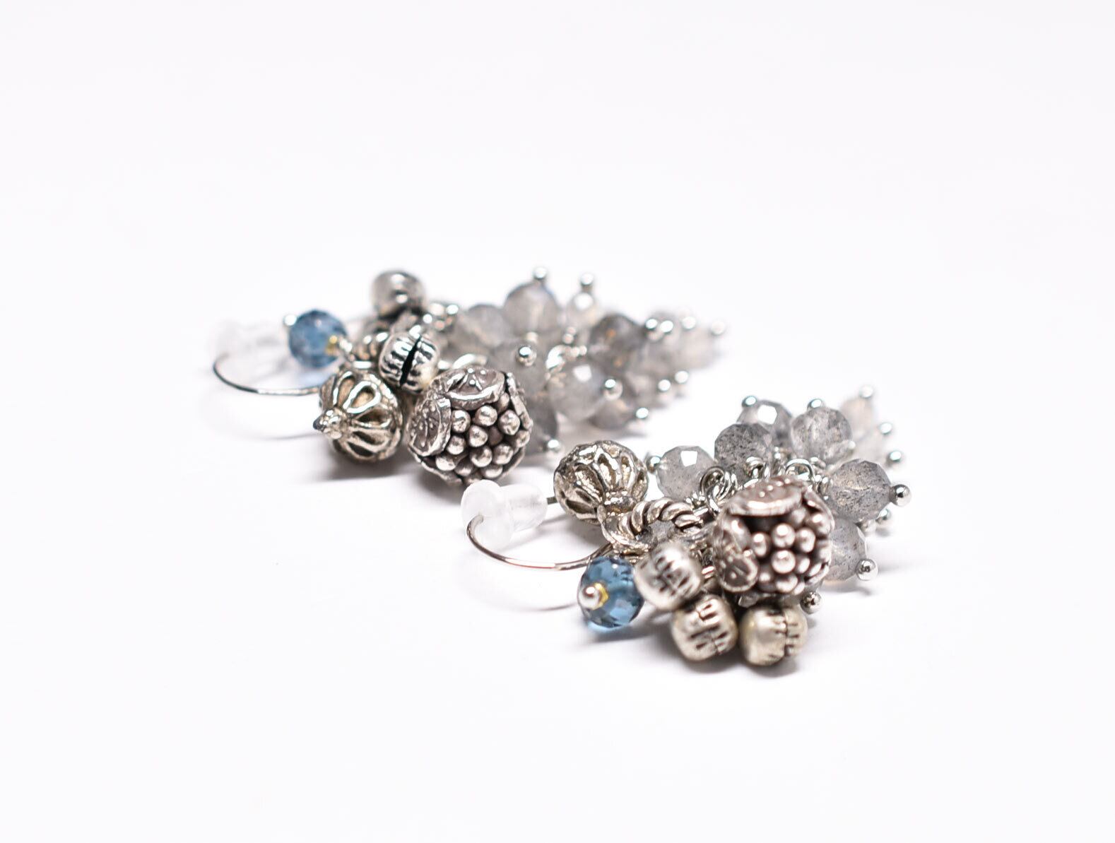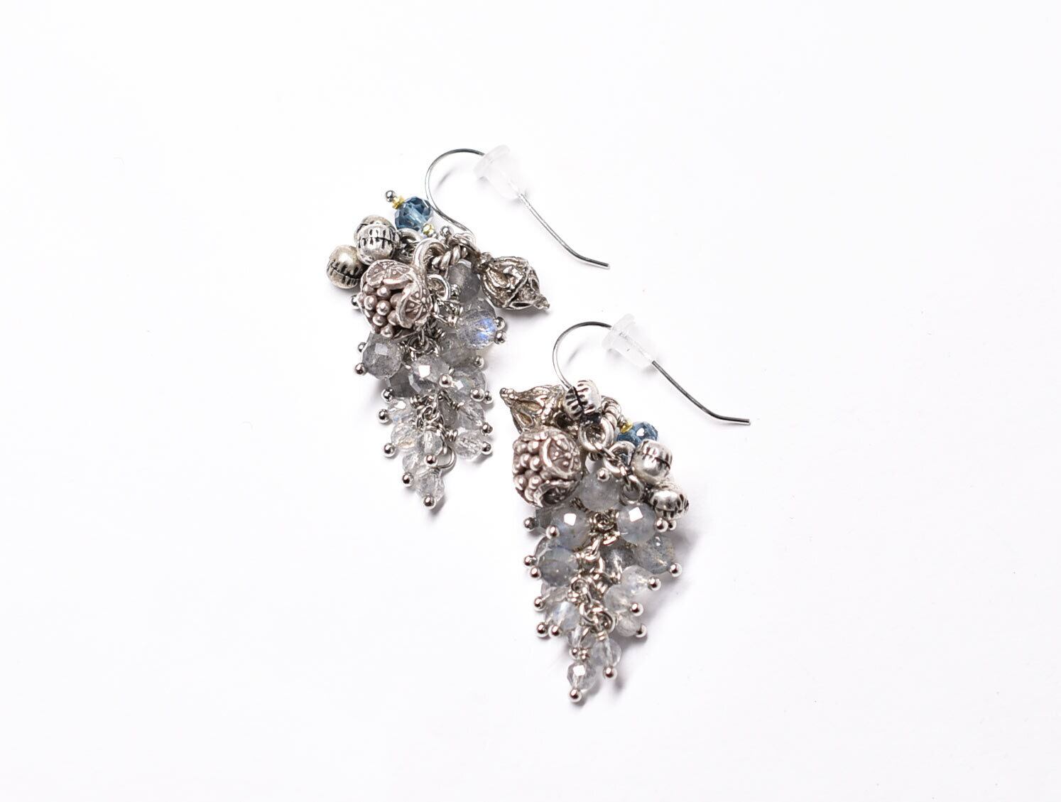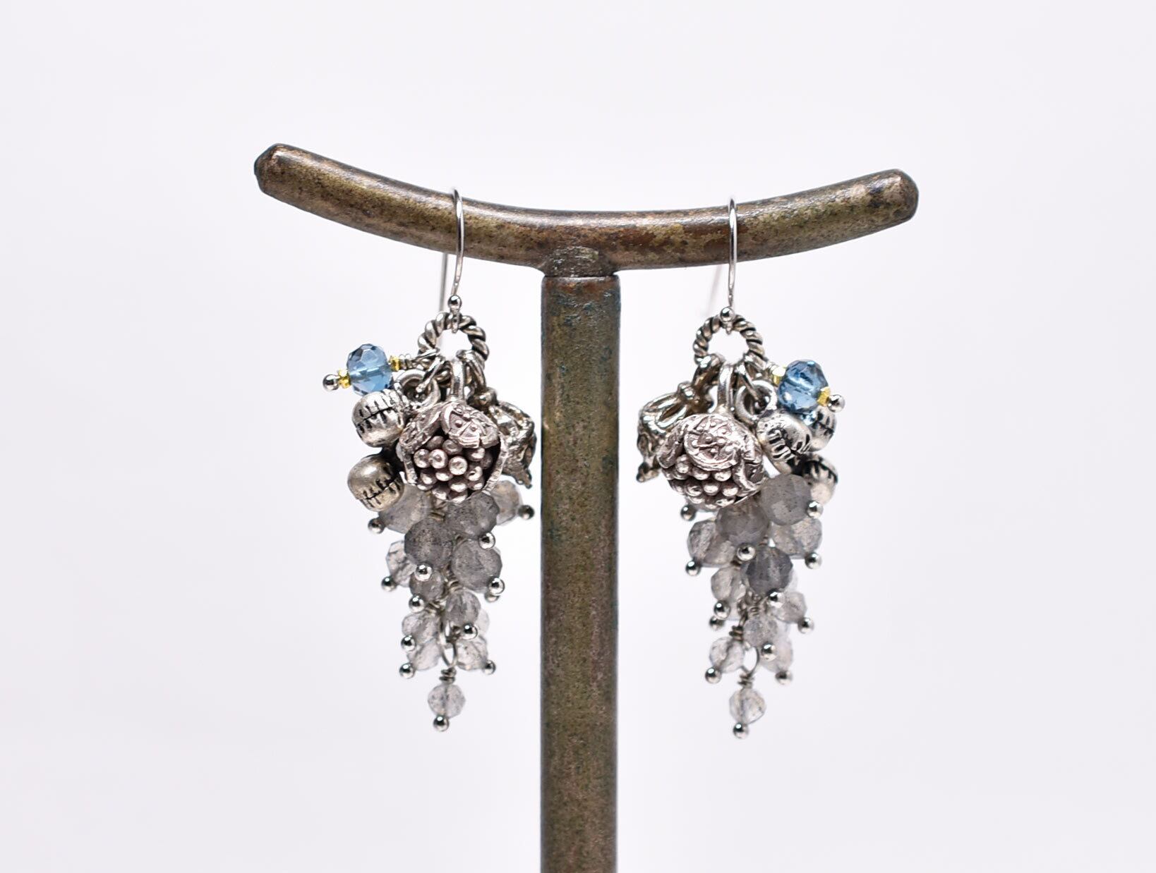 カレンシルバーの蕾、インドピューター、ロンドンブルートパーズ、たわわなラブラドライト、インドシルバー鈴を繋いだピアスです。