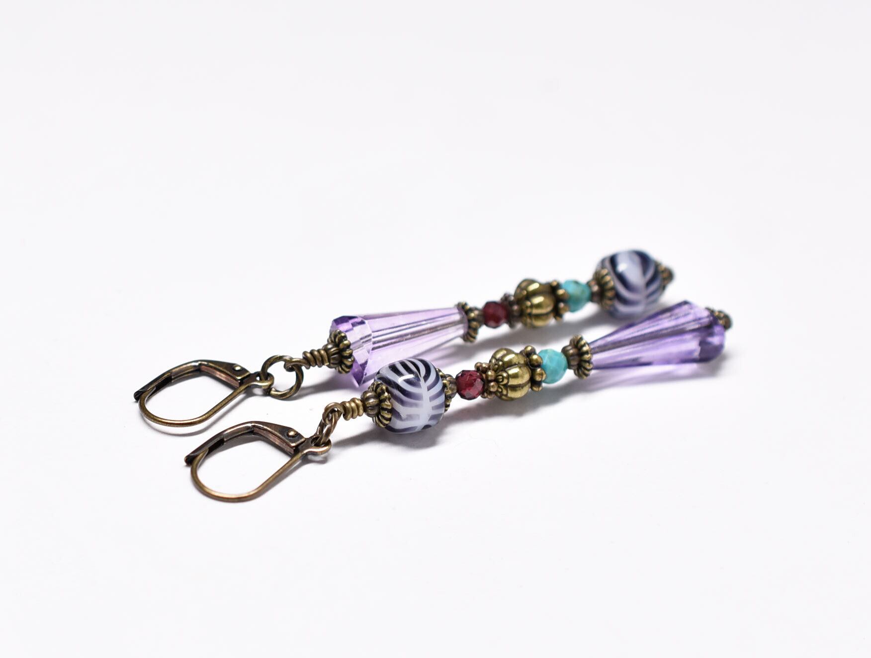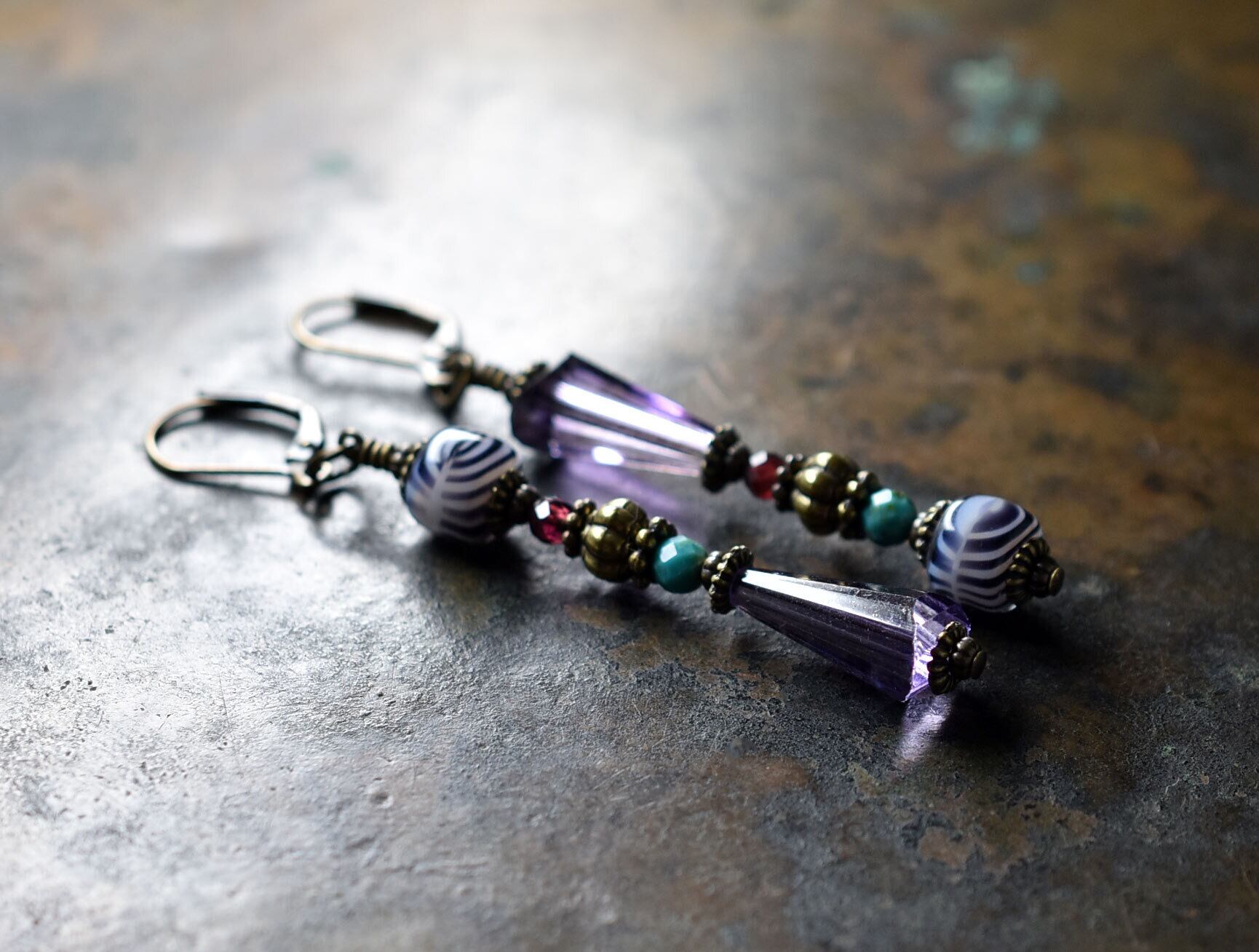 パープル&ゼブラ柄ヴィンテージビーズと手毬ブラス、ターコイズとガーネットを繋いだアンシメトリーなピアスです。