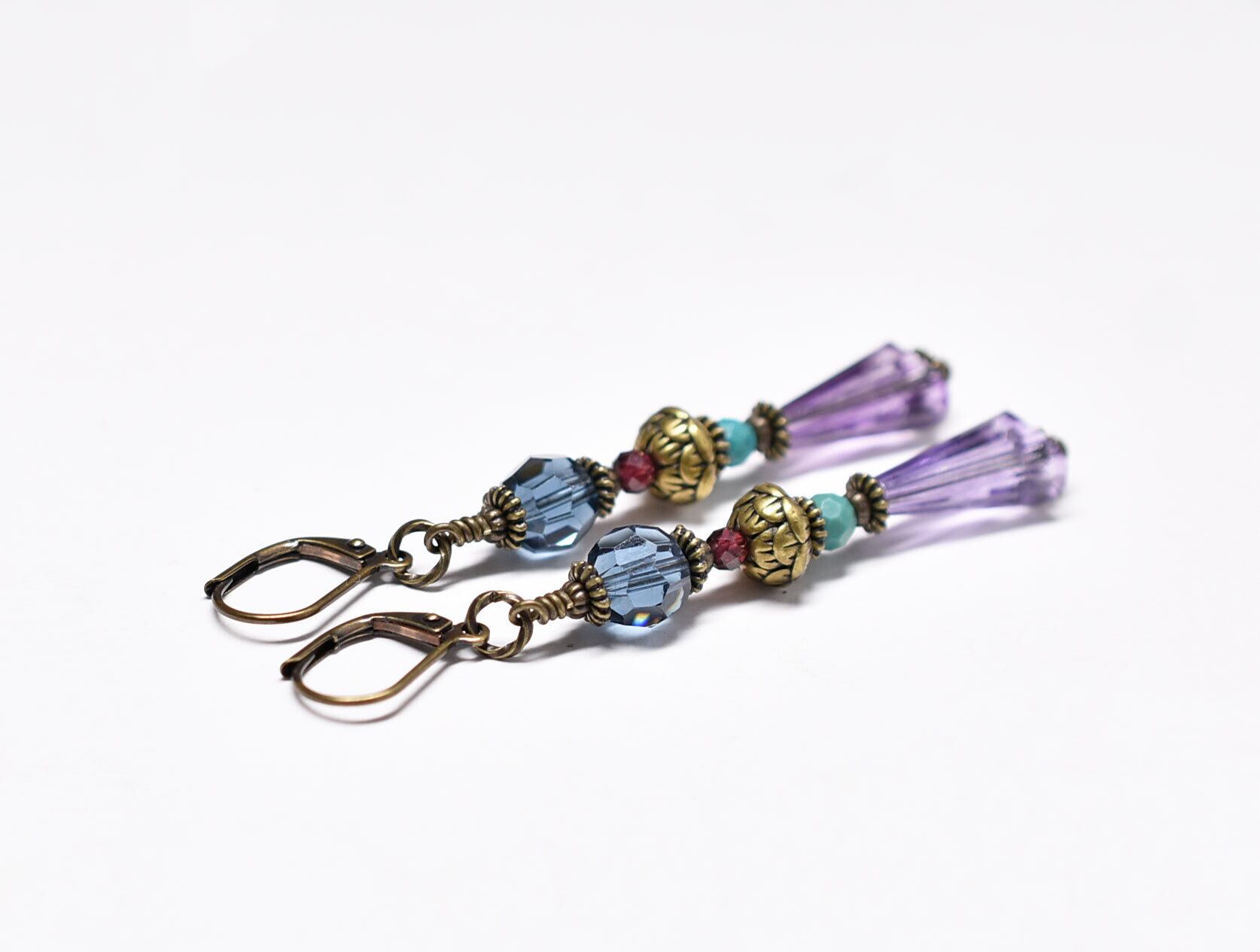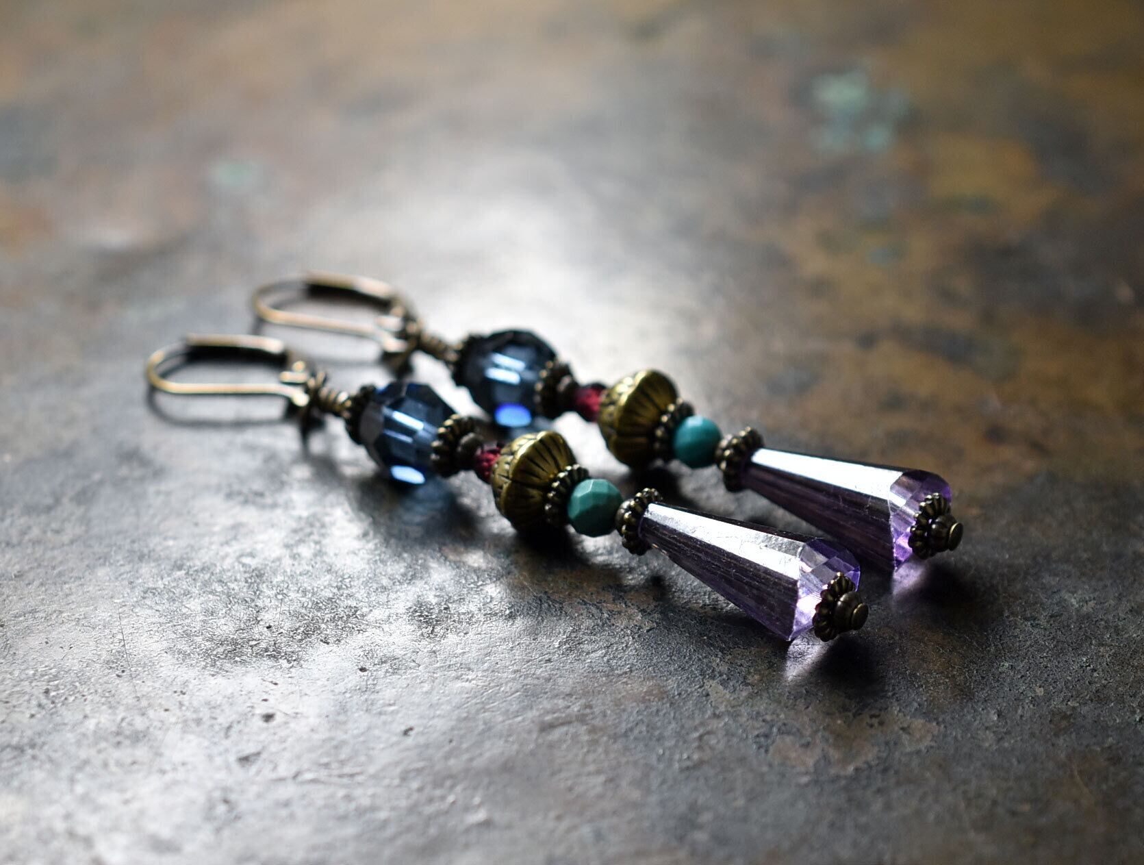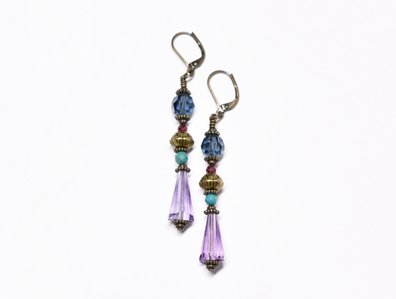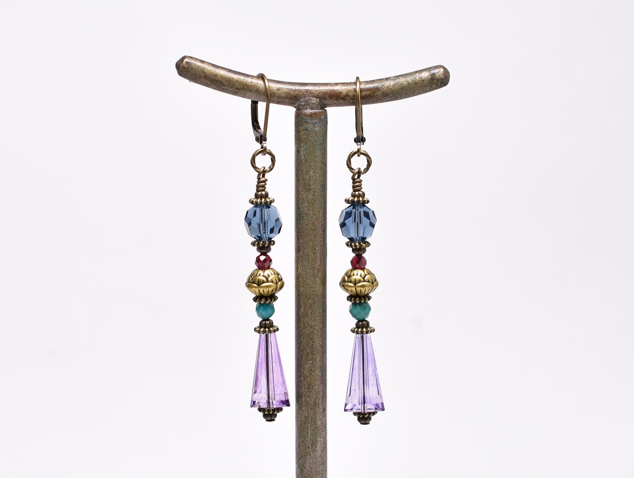 パープル&アイアンブルーヴィンテージビーズと蓮華ブラス、ターコイズとガーネットを繋いだピアスです。