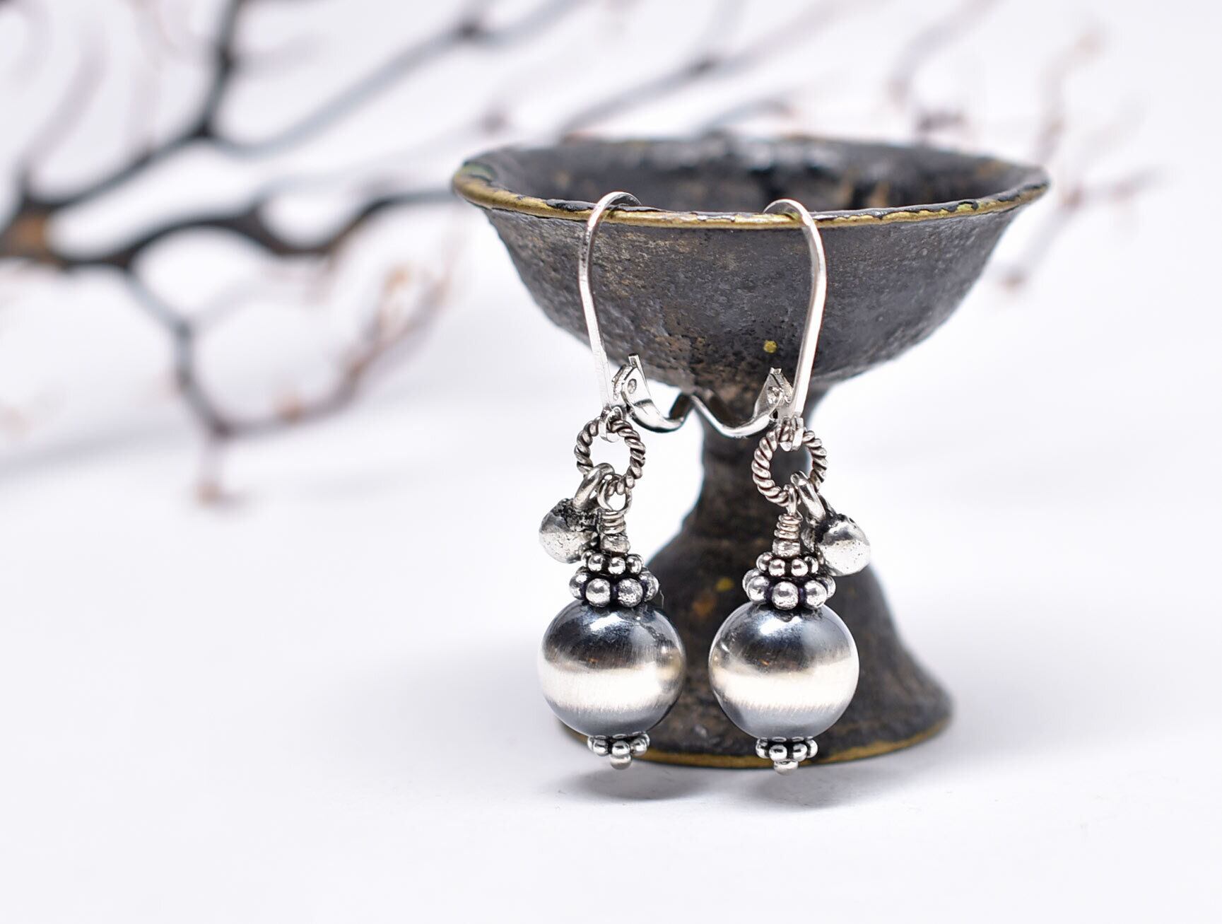 インドシルバーの鈴とナバホパールを繋いだピアスです。
