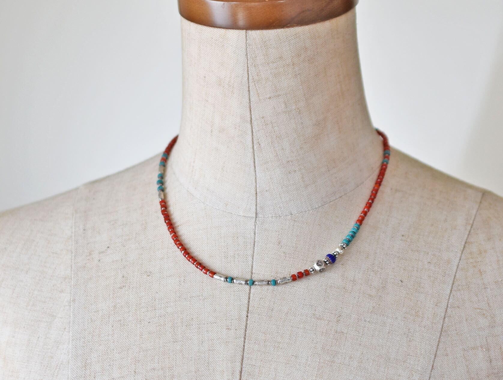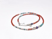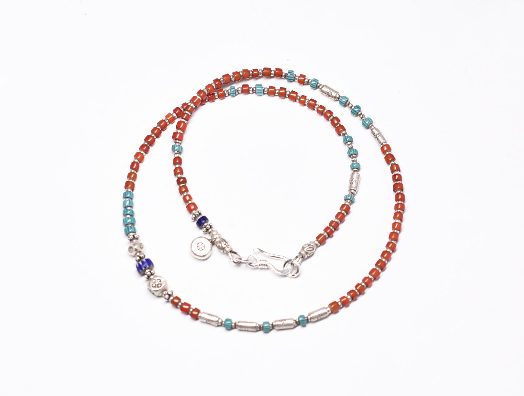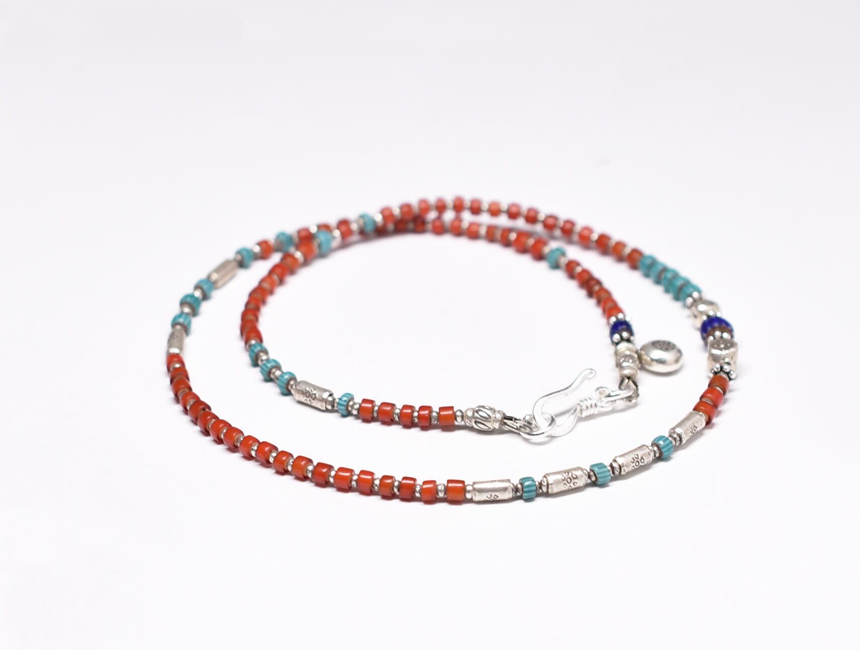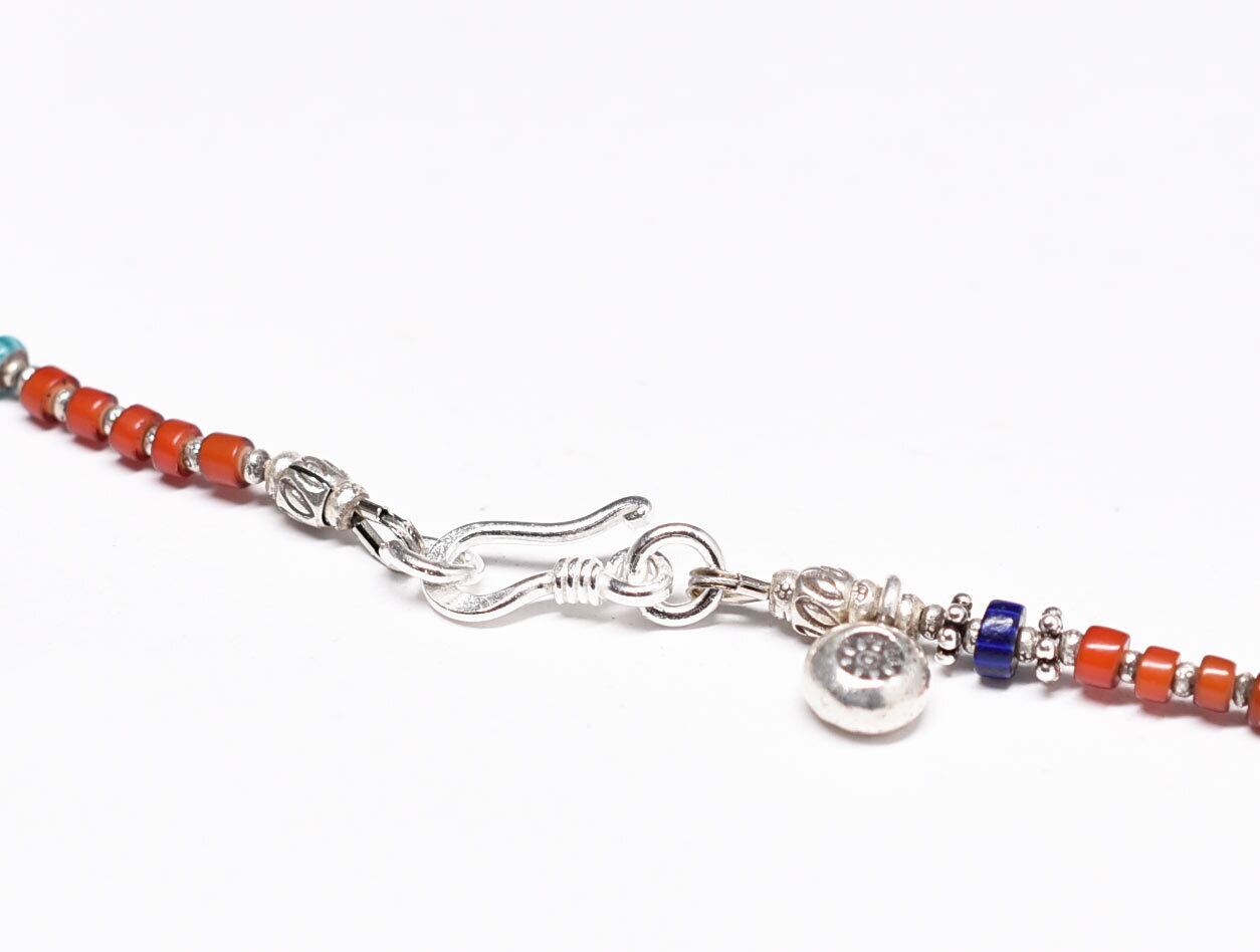 カレンシルバーとブルー&ターコイズブルーシェブロン、飴色ホワイトハーツの華奢なネックレス
