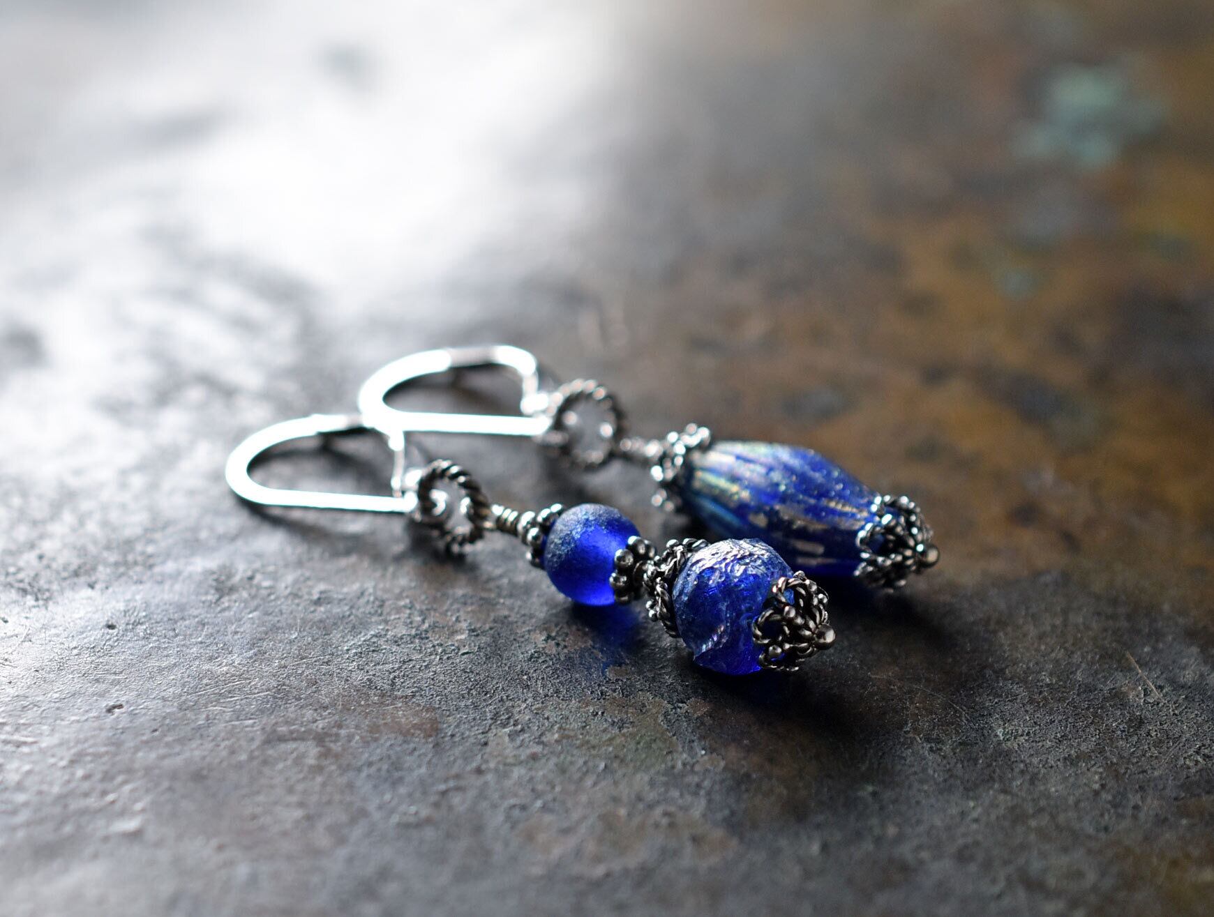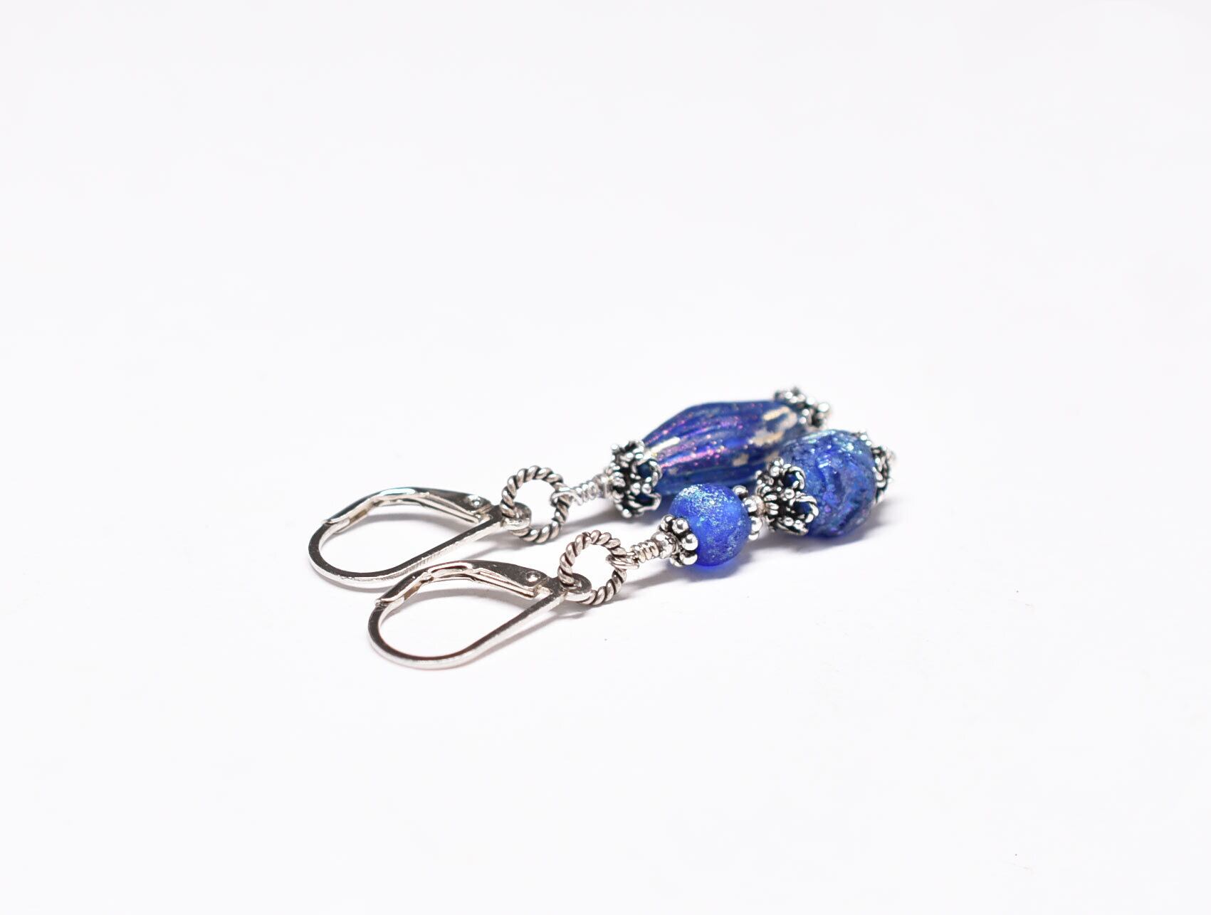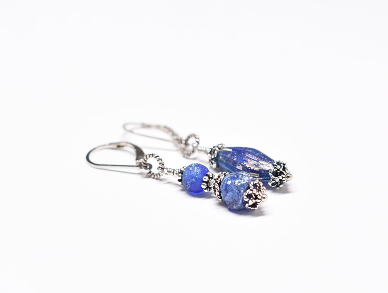 ローマングラスビーズの上部の飾りはシルバー製です。ジャーマンシルバーに、スターリングシルバーをのせたものです。繊細な細工が可愛らしいです!