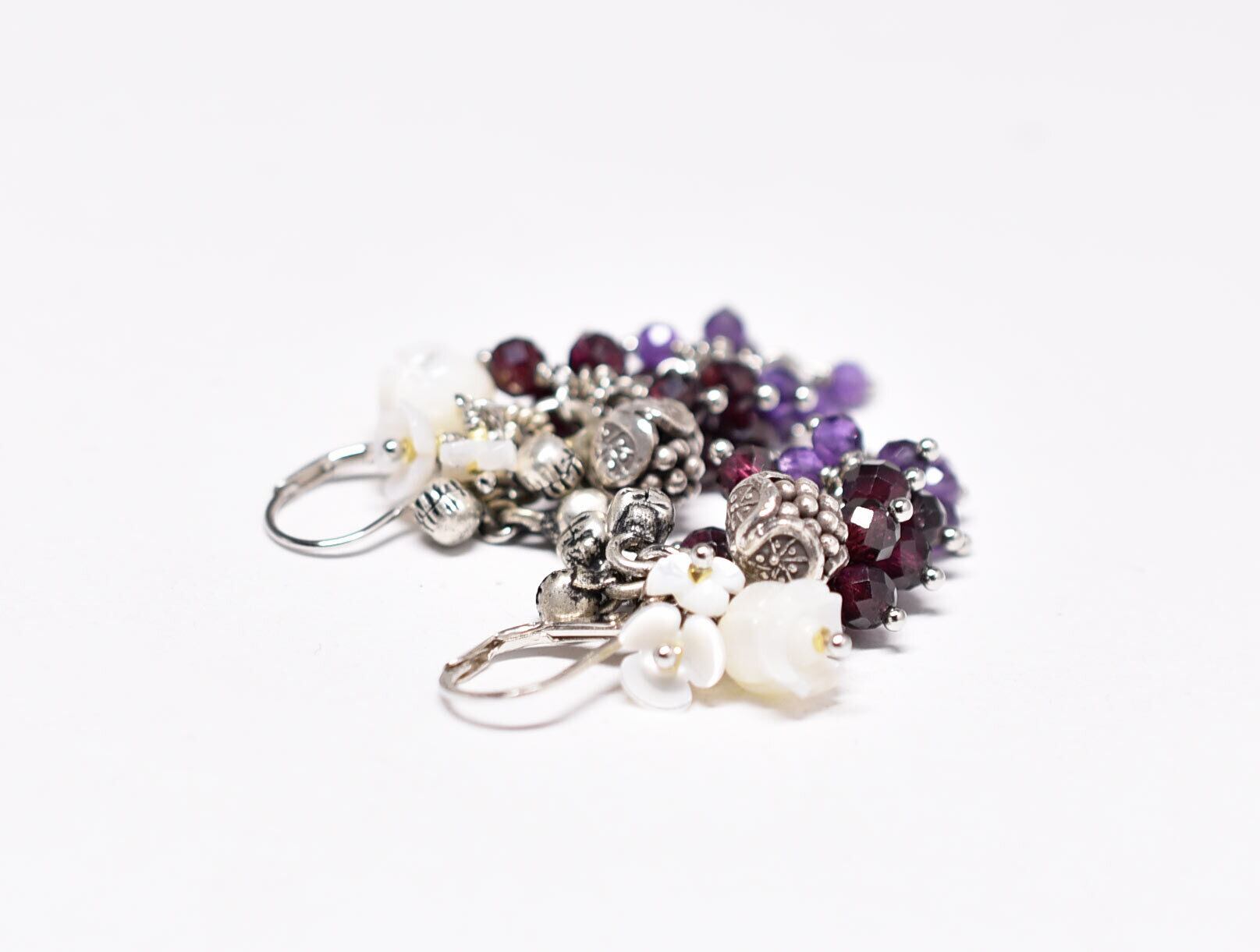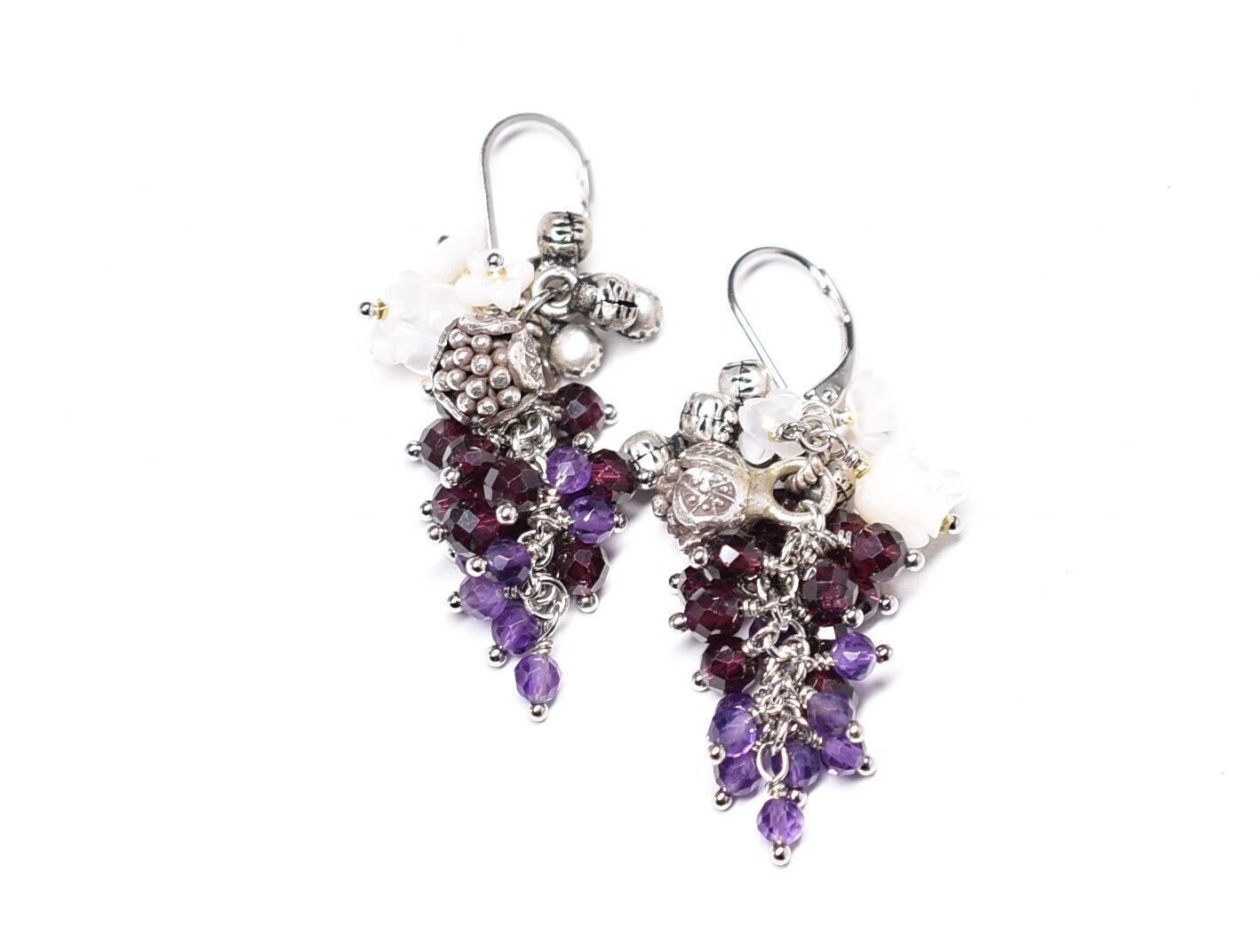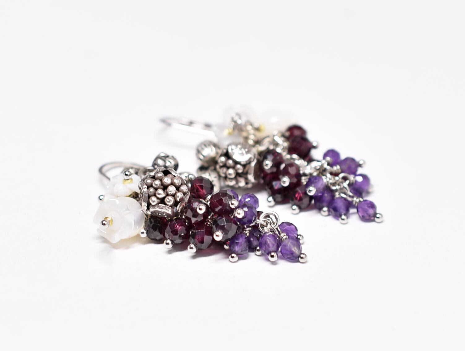 カレンシルバーの蕾、白蝶貝のお花、たわわなガーネット&アメジスト、インドシルバー鈴のピアス